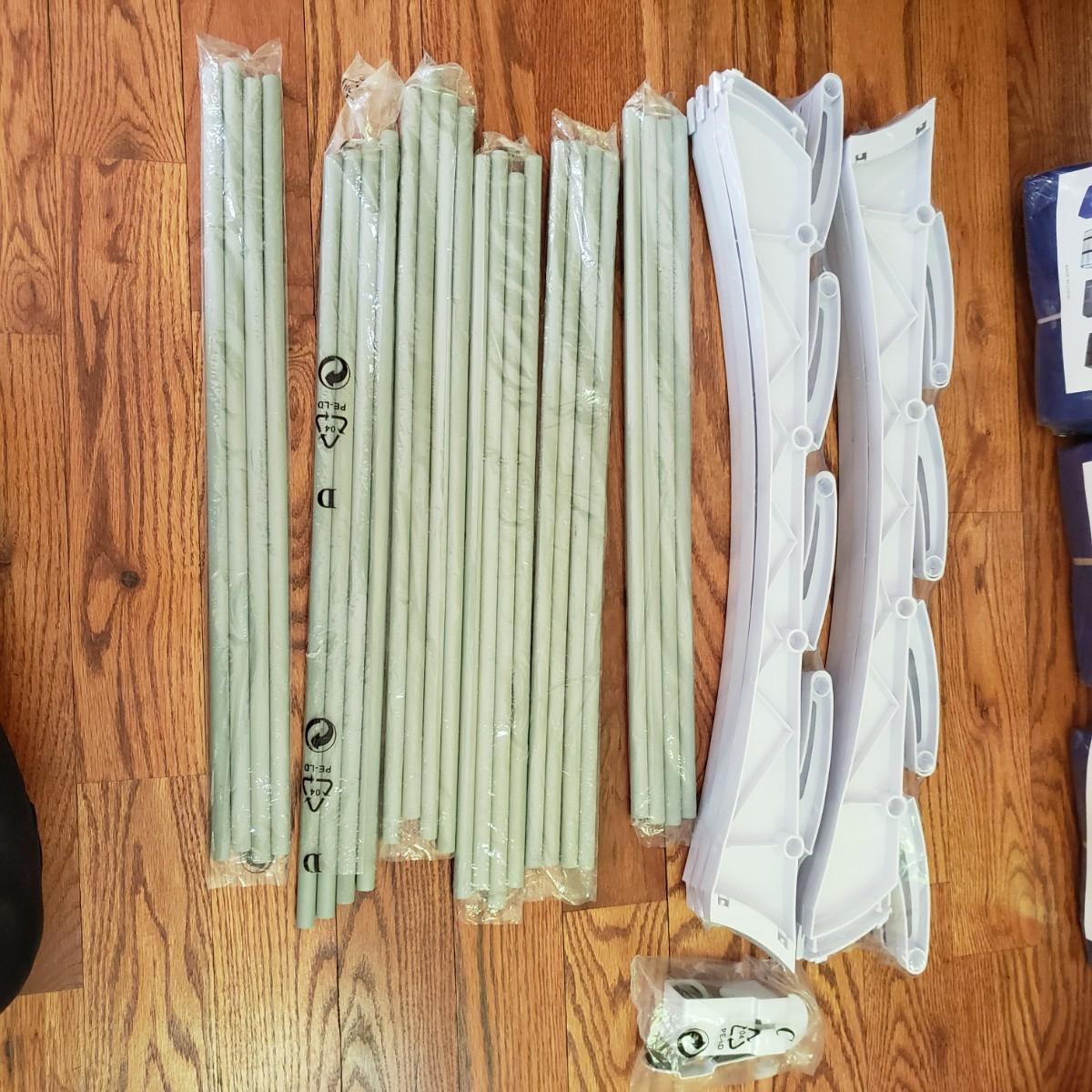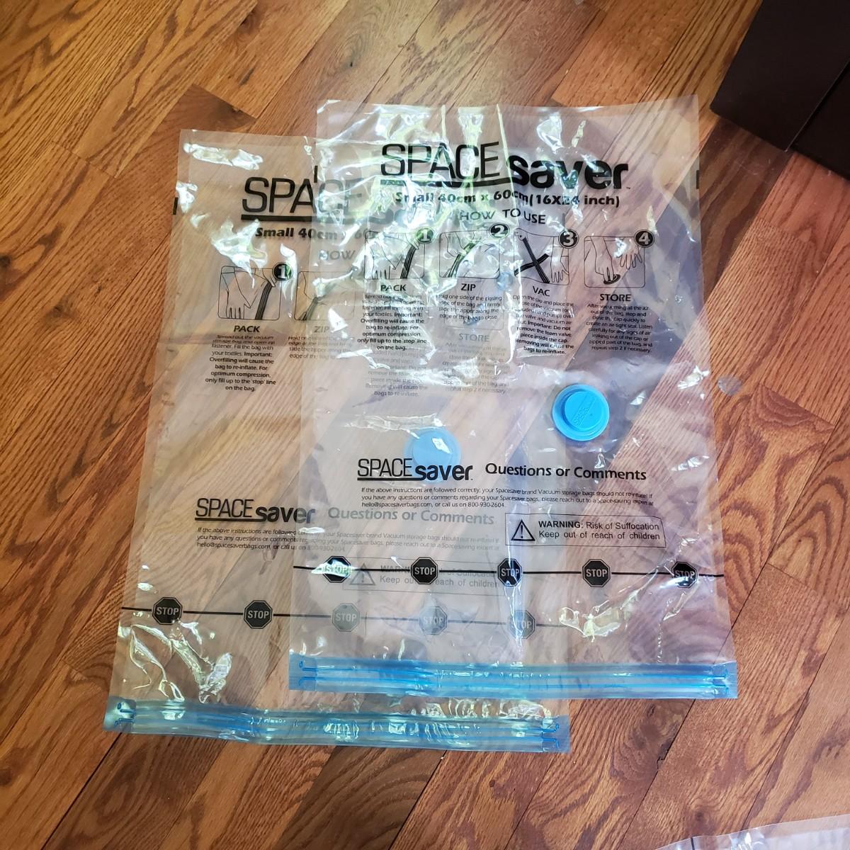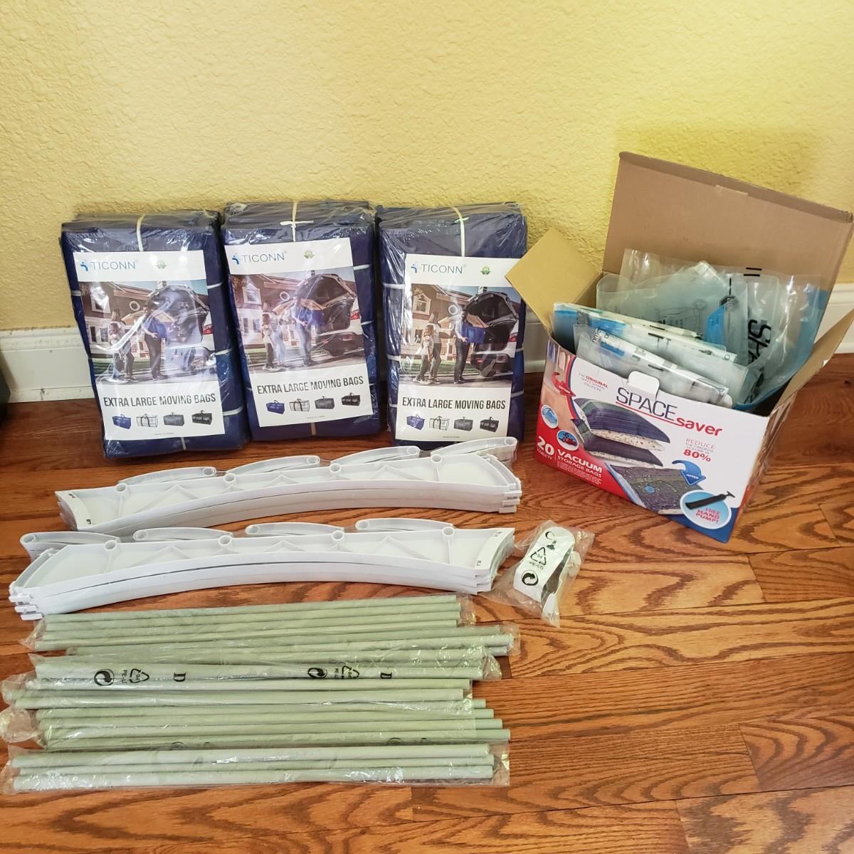 This lot contains two small, two jumbo and four large Space Saver bags. Three new extra large moving bags with straps and two new over the door racks from Ikea.