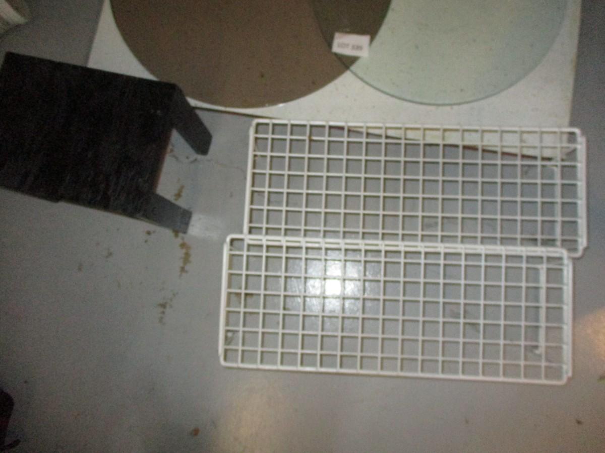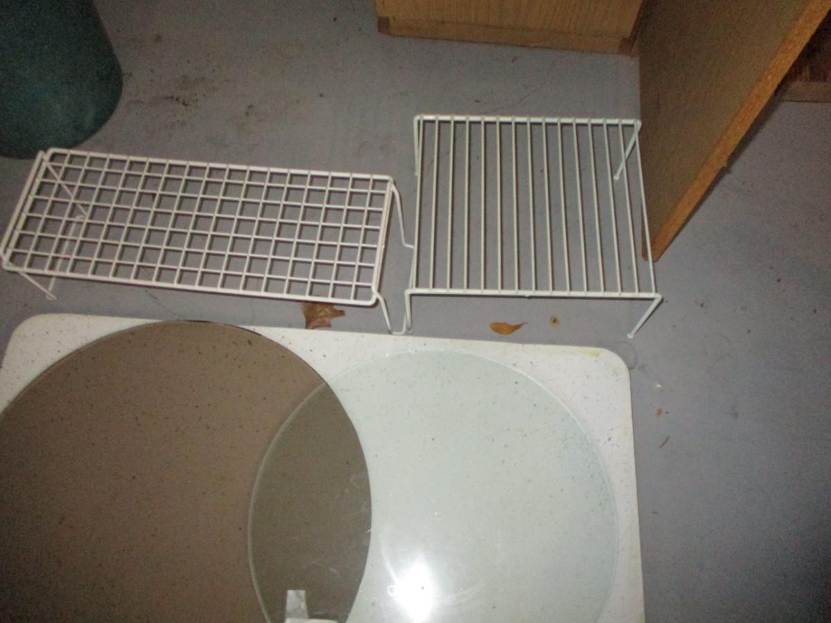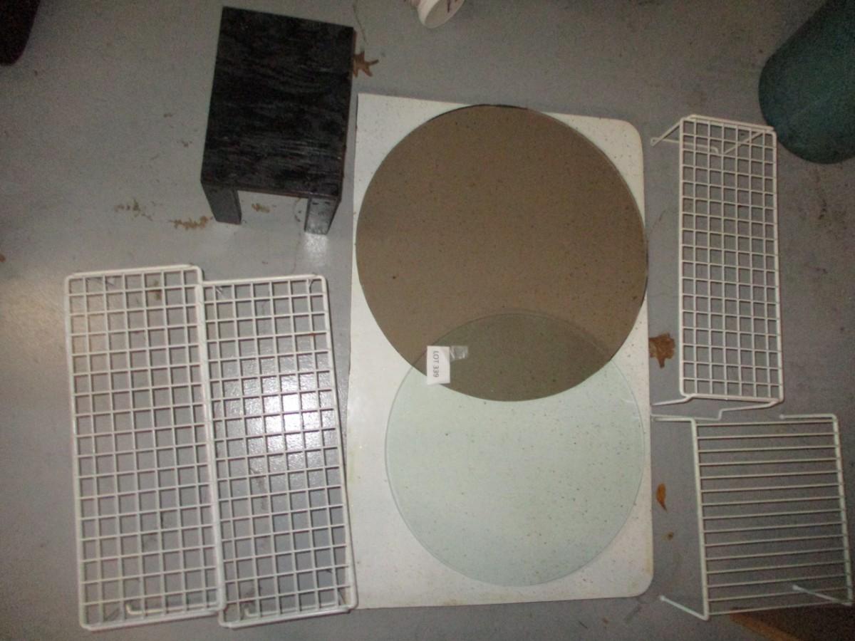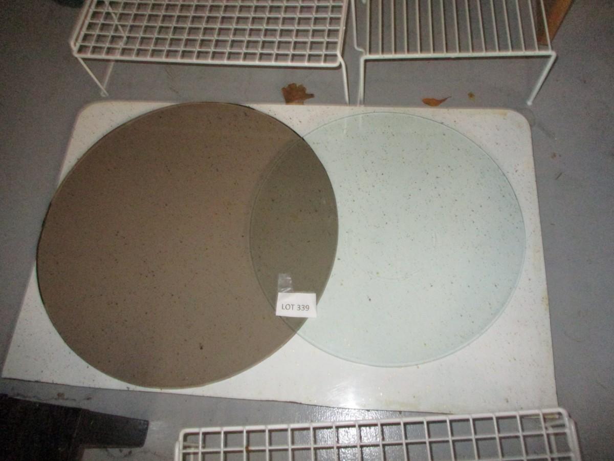 Smoke & clear glass table rounds, Formica table top, shelf space savers