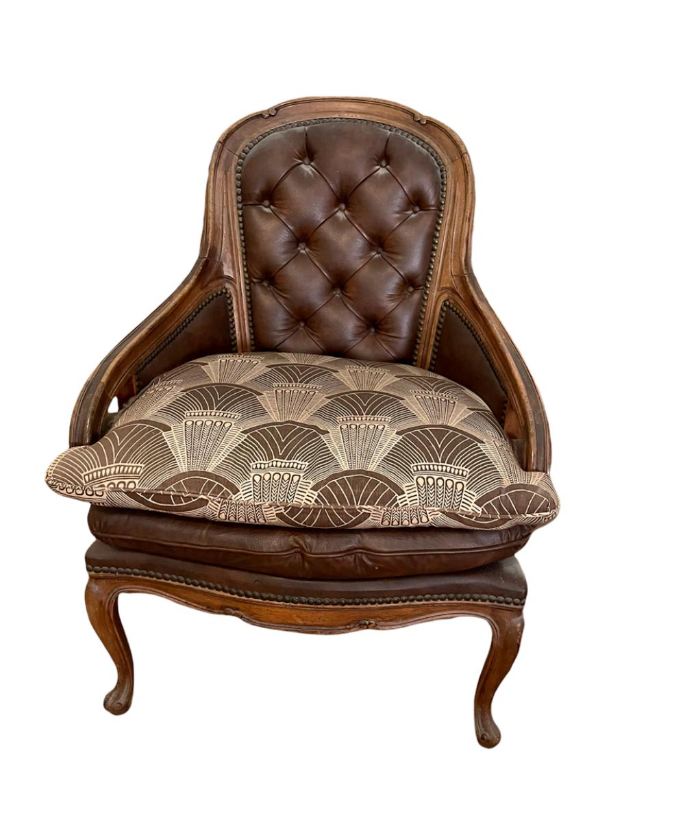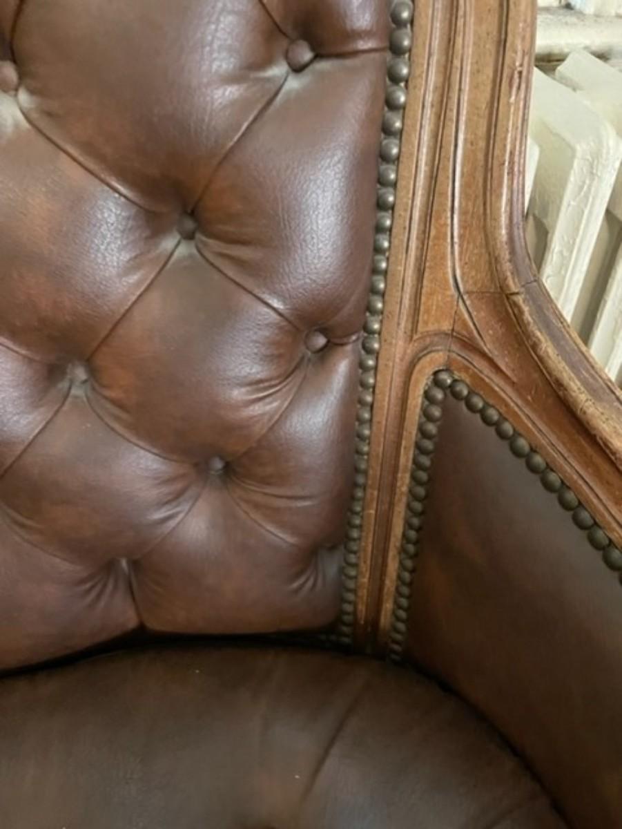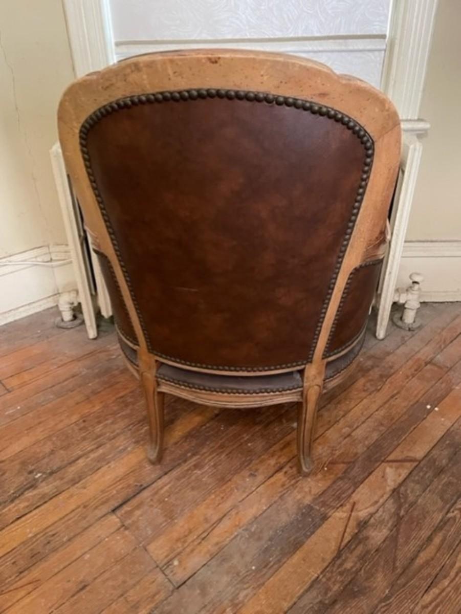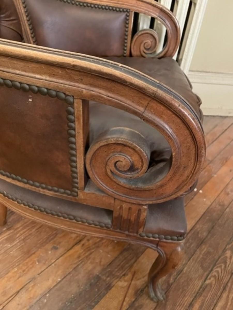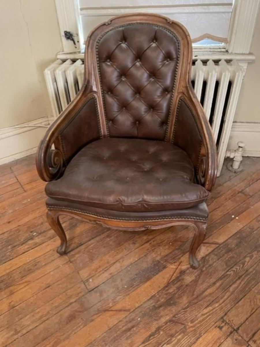 Spacious Vintage Brown Leather and Wood Wing Chair - jb11288