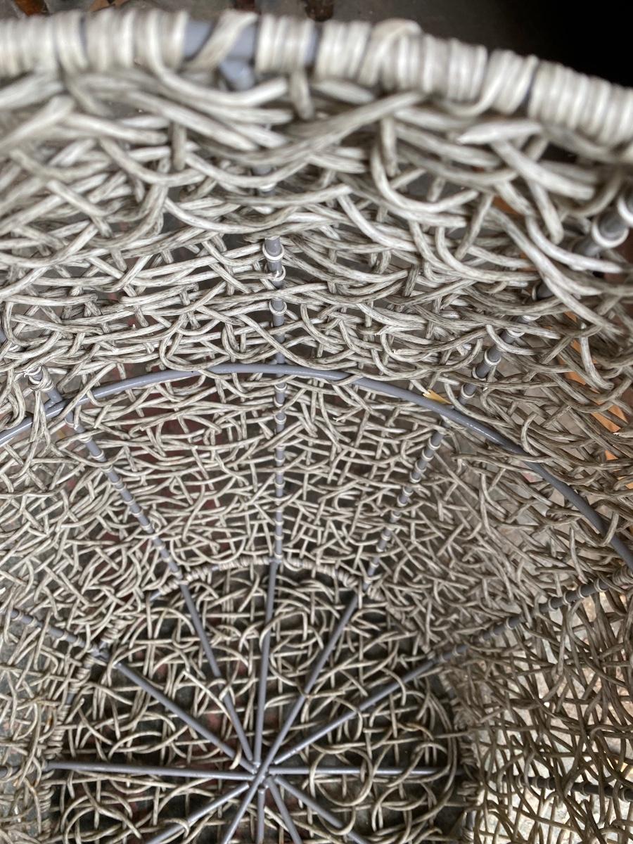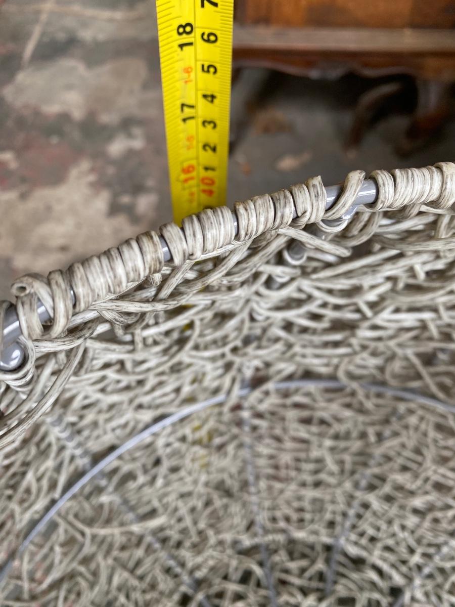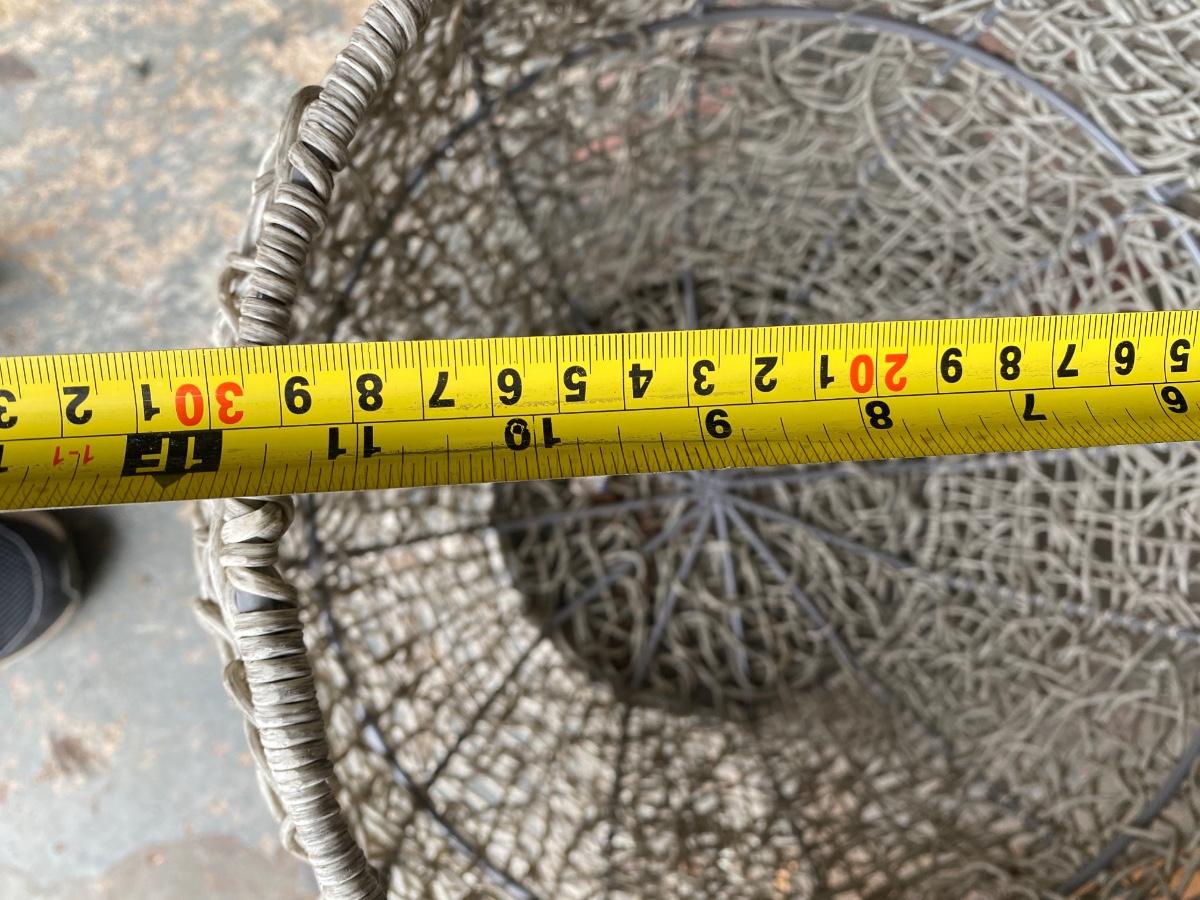 spaghetti wrapped metal re-inforced large basket. 16" high x 12" diameter at base and top (wider in the middle