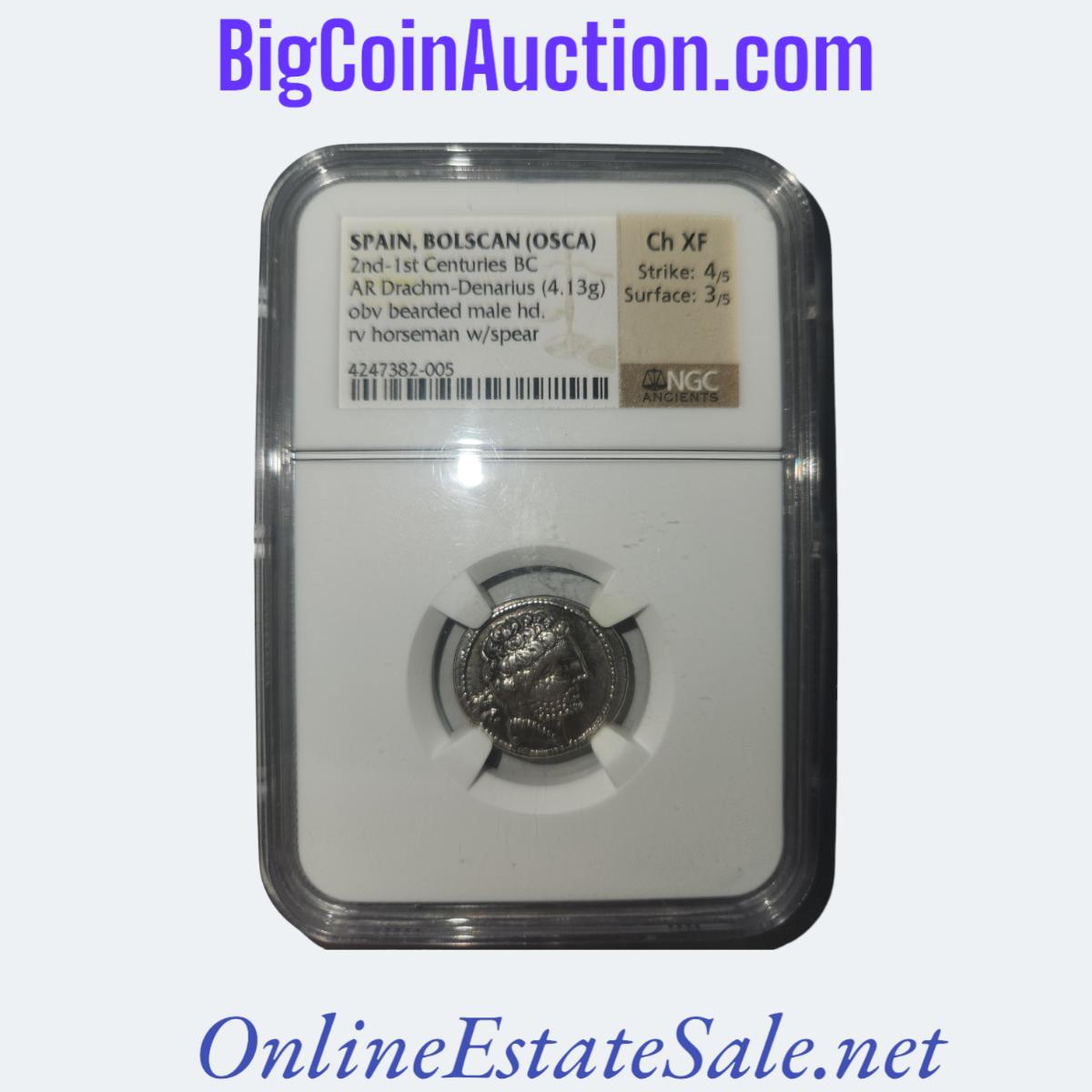 Spain, Bolscan (OSCA) 2nd - 1st Cent. B.C. AR Drachm - Denarius (4.13g) Obv Bearded Male HD.