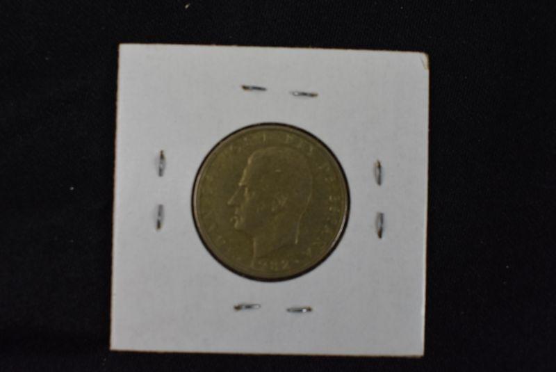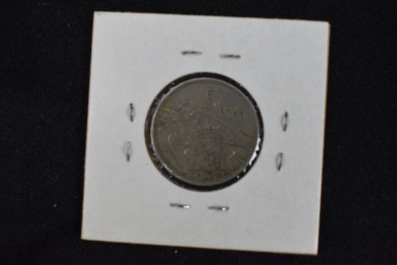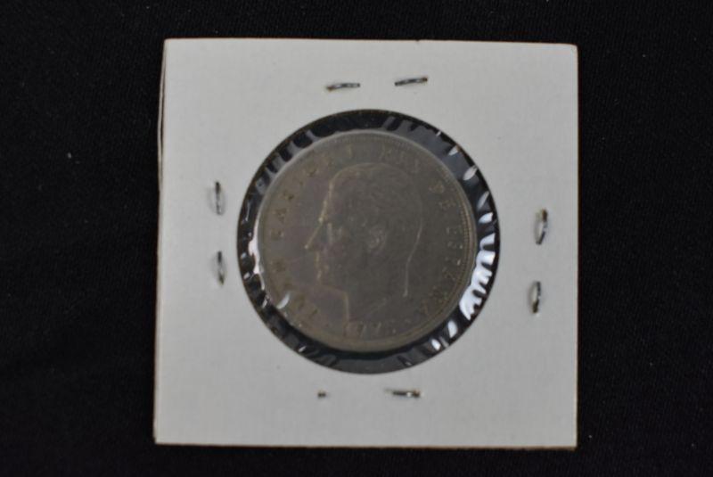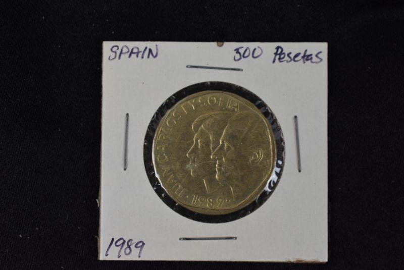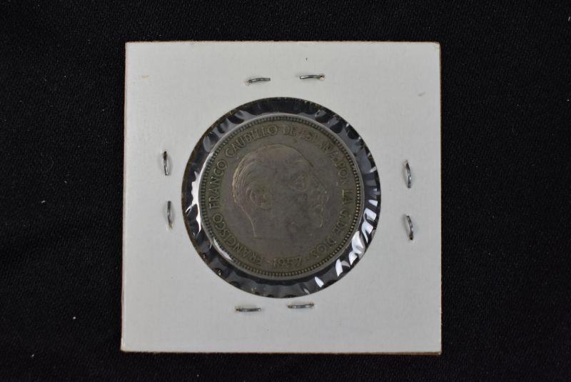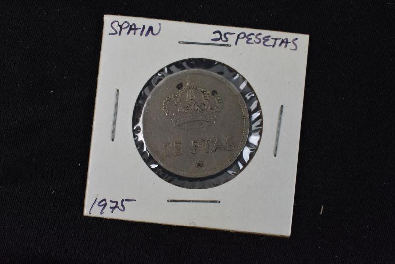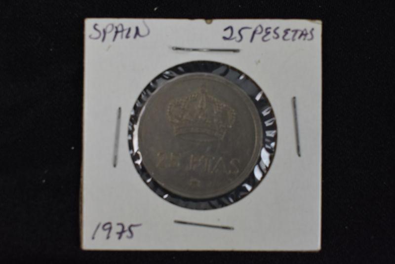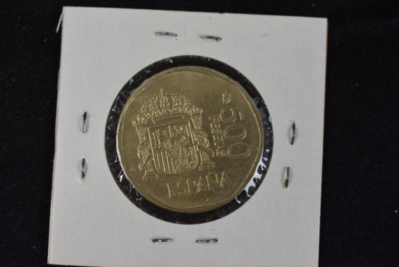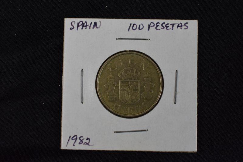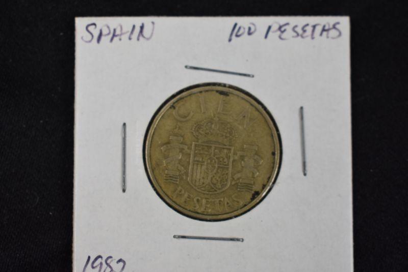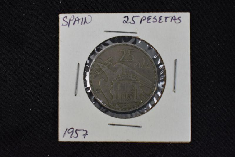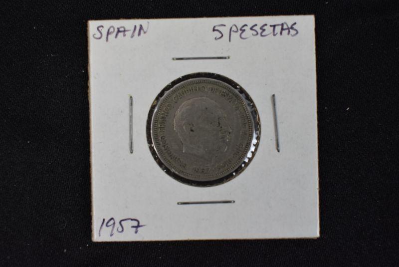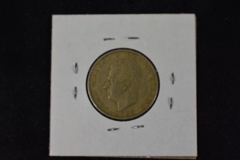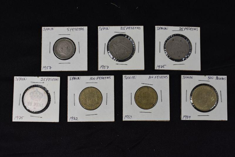 1957 Spain 5 Pesetas, 1957 Spain 25 Pesetas, 1975 Spain 25 Pesetas, 1975 Spain 25 Pesetas, 1982 Spain 100 Pesetas, 1982 Spain 100 Pesetas, and 1989 Spain 500 Pesetas