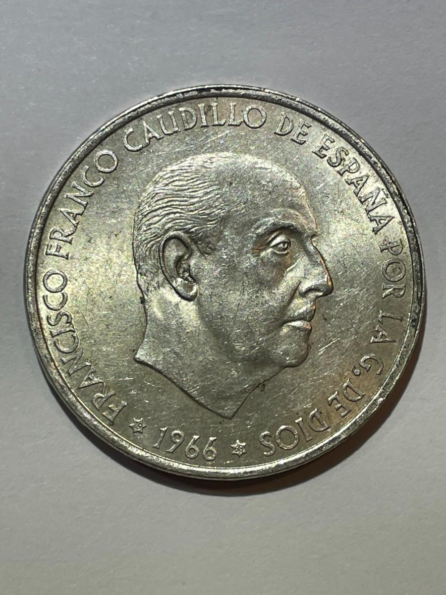 Spain First Year Issue (1966) AU Condition 100 Pesetas Large SILVER Coin Featuring General Bahamonde & Shield as Pic'd.