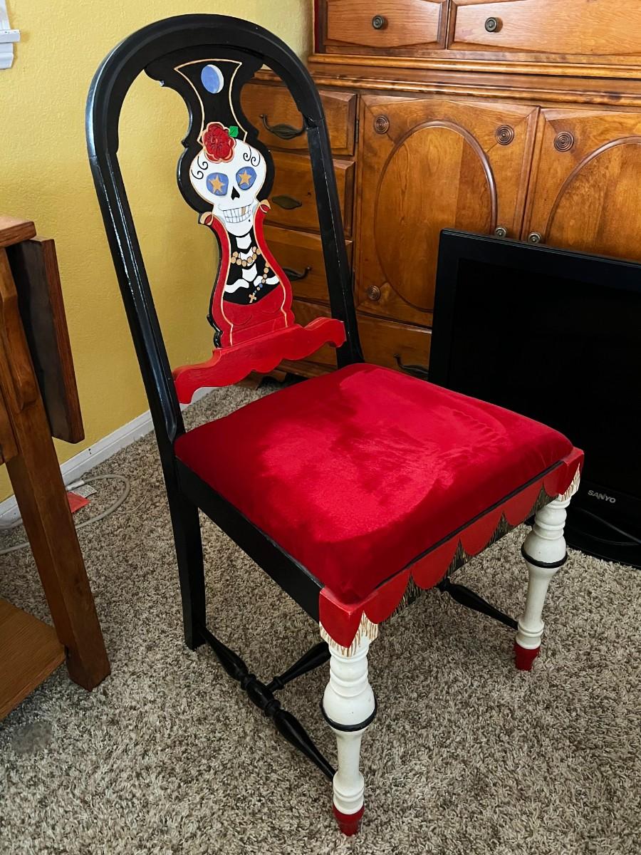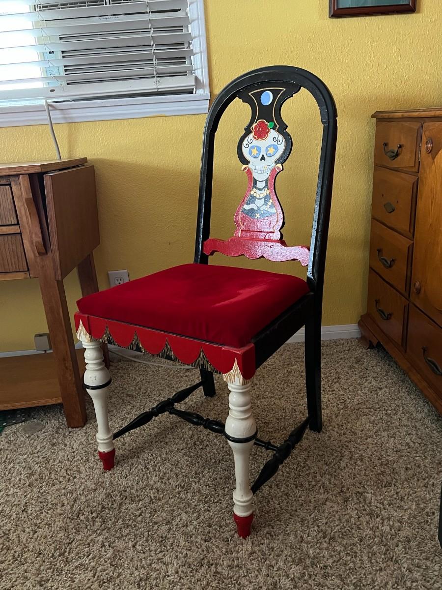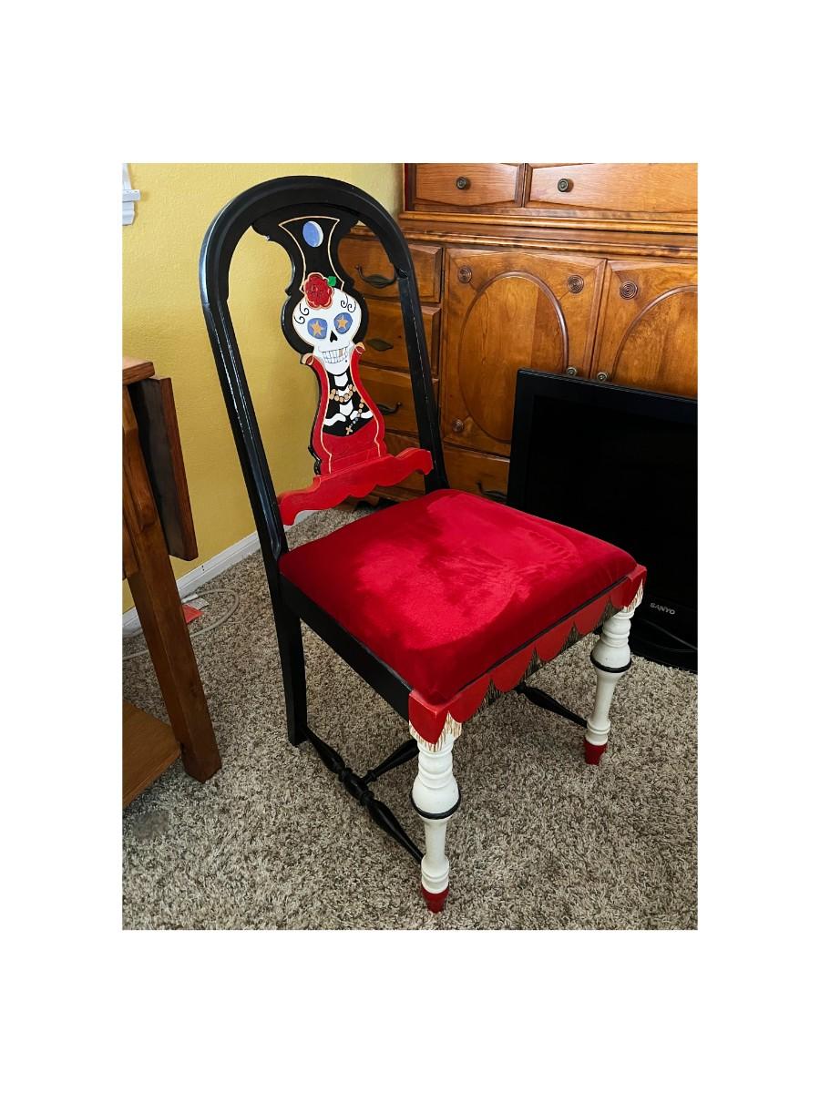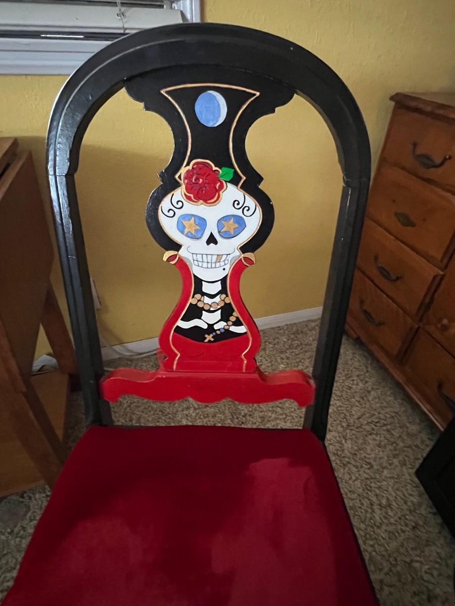 Spanish Calavera Skeleton Day of the Dead Chair, there is no significant damage to the chair and is in good useable condition. Check pictures for more details and for sizing.