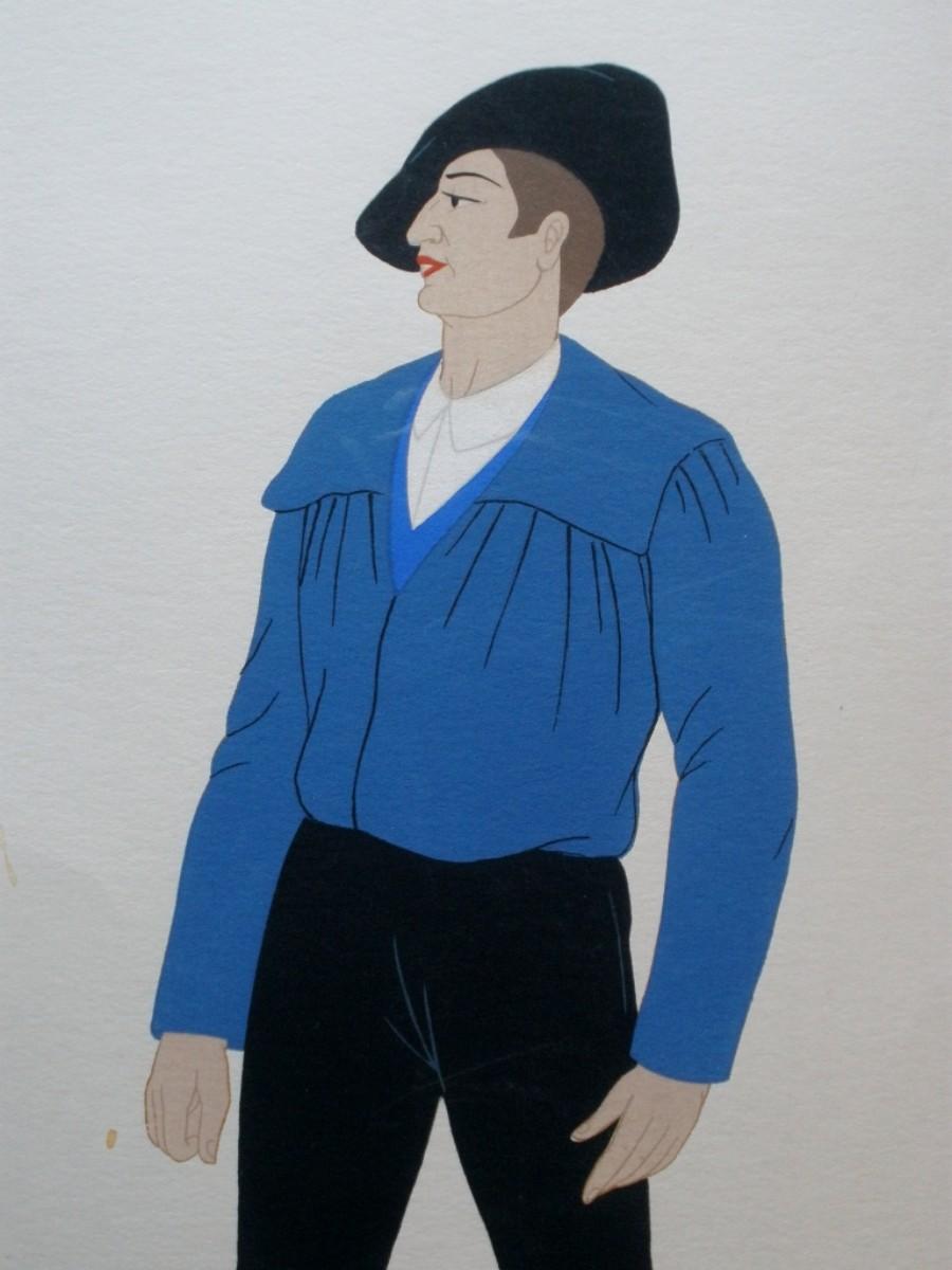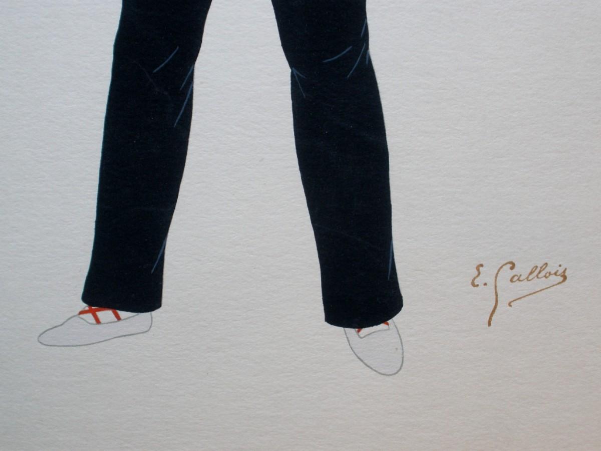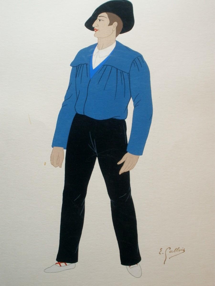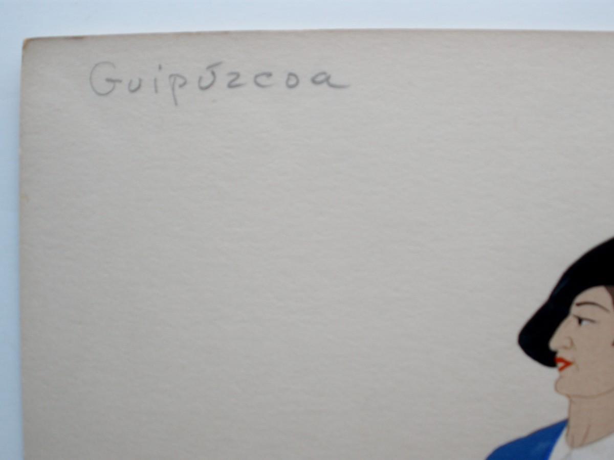Spanish Man’s Costume from Guipjzcoa by Emile Gallois, believe this to be from 1939 series "Costumes Espagnols" by E. Gallois, and appears to be a pochoir illustrations from a numbered portfolio (no.17), on light cardboard measuring 12 ¼ x 15 ¾ in., the region of the costume is penciled in on upper left.