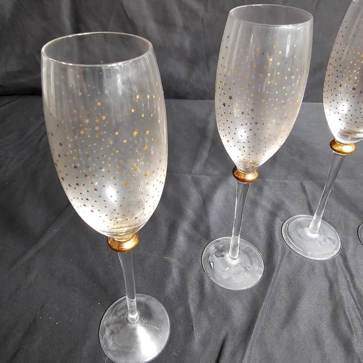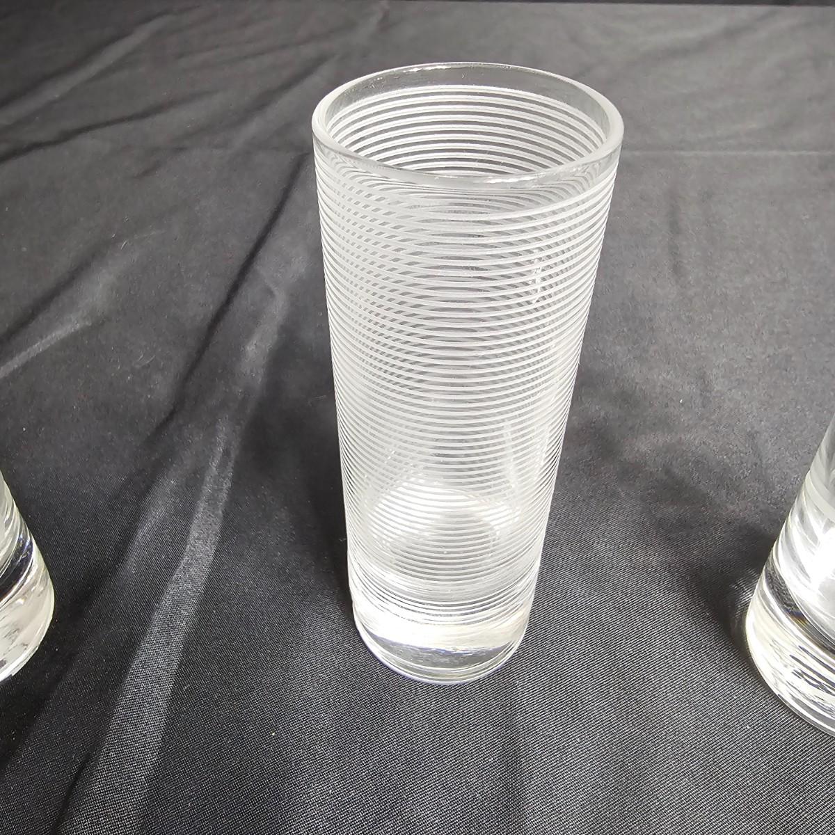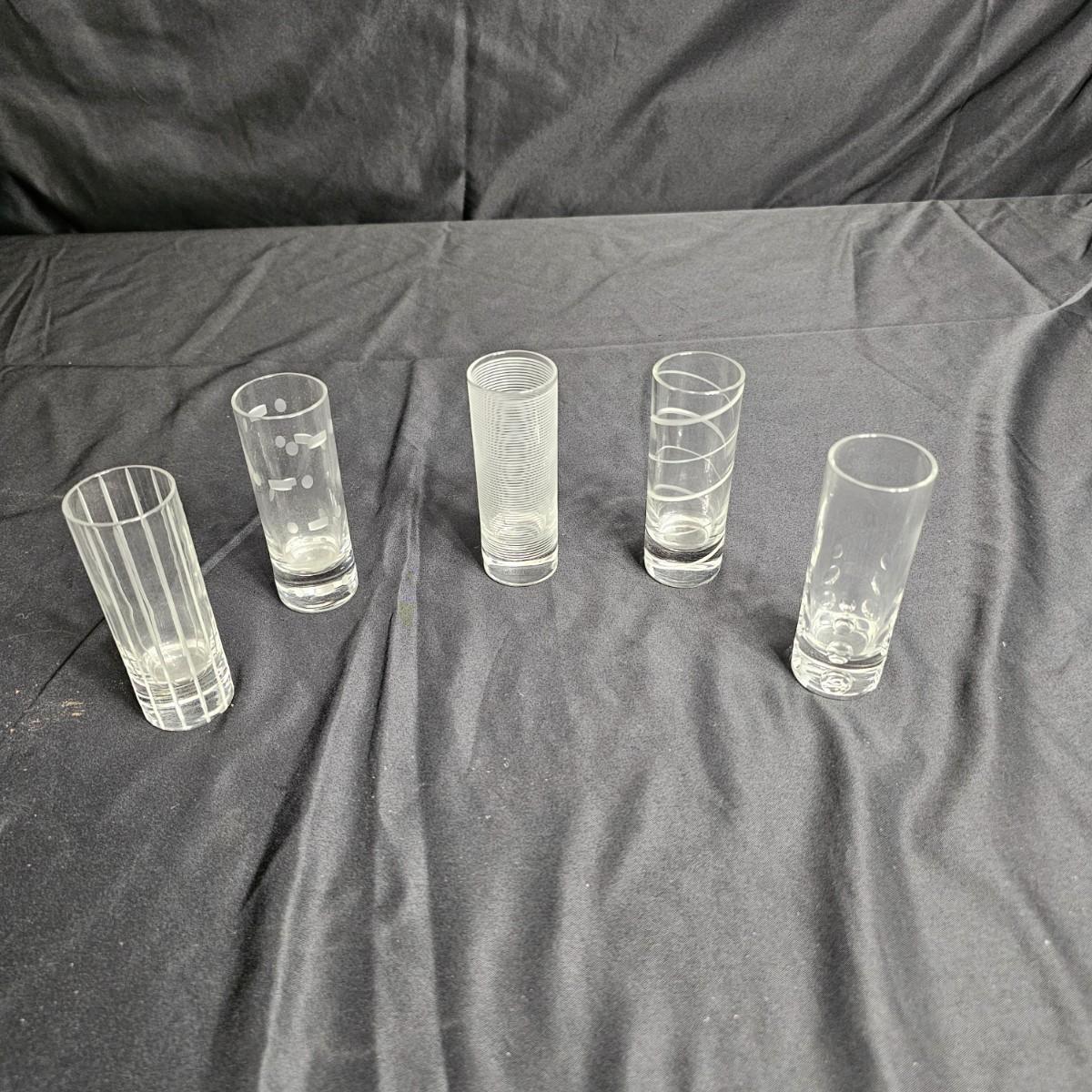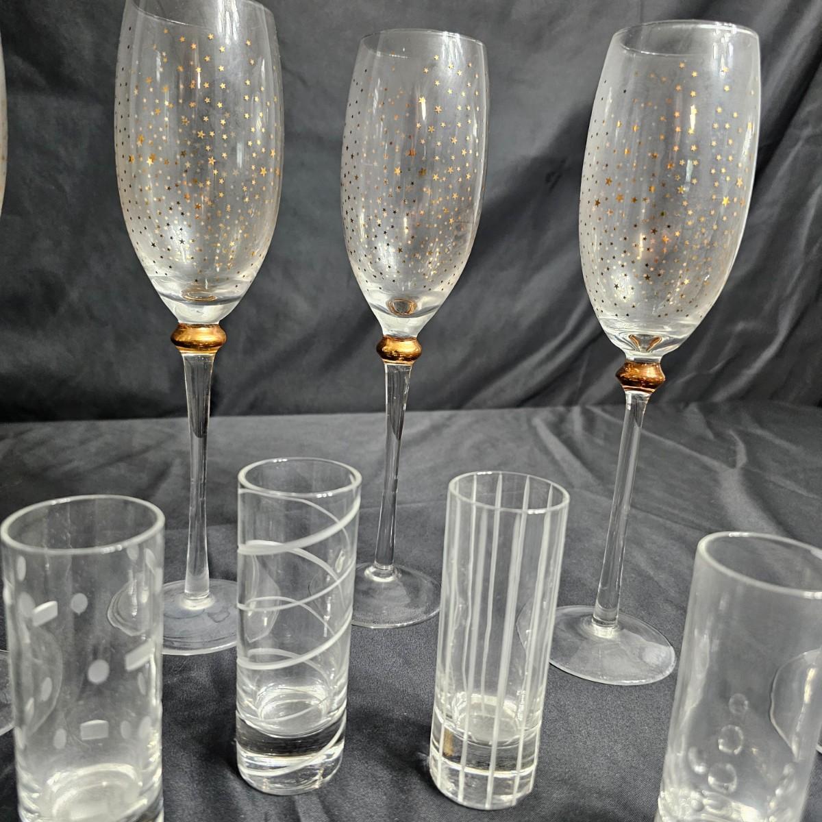 Six matching champagne flutes and five individual tall shot glasses. Flutes are 2.5"D x 10"H, have gold glittery bubble design on glass part. Shot glasses are each a different MCM design and measure 1.5"D x 4"H. All items somewhat cloudy, they appear to only need cleaning. See photos for details. Shipping available.