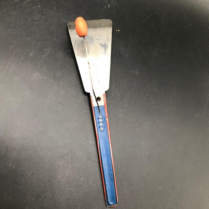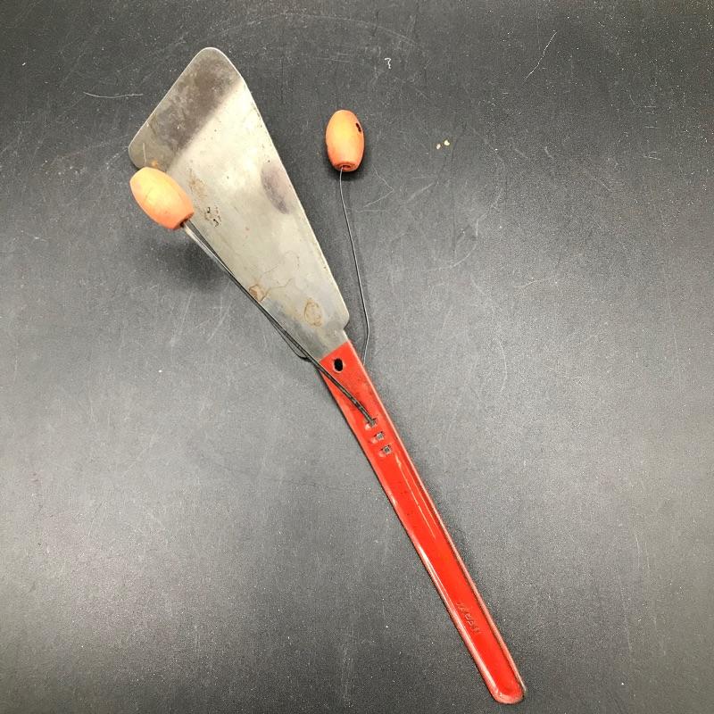 Up for auction is a child’s toy which appears to be a stamped sheet metal spatula with two wooden knobs fastened to a fan metal wire attached to each side of the spatula. Each of these makes a clanking noise when shaken back-and-forth.