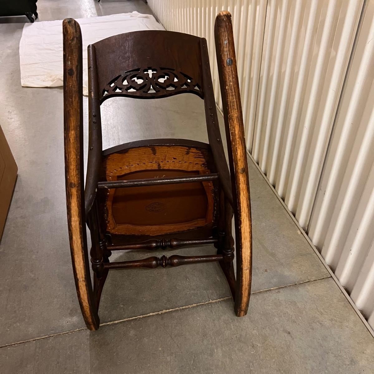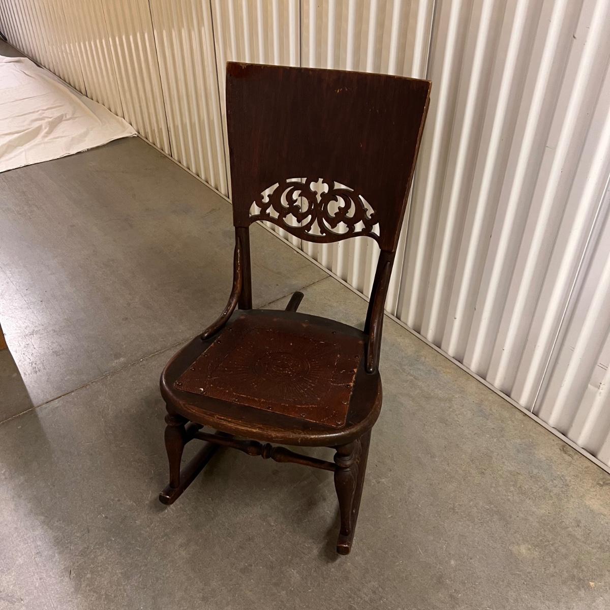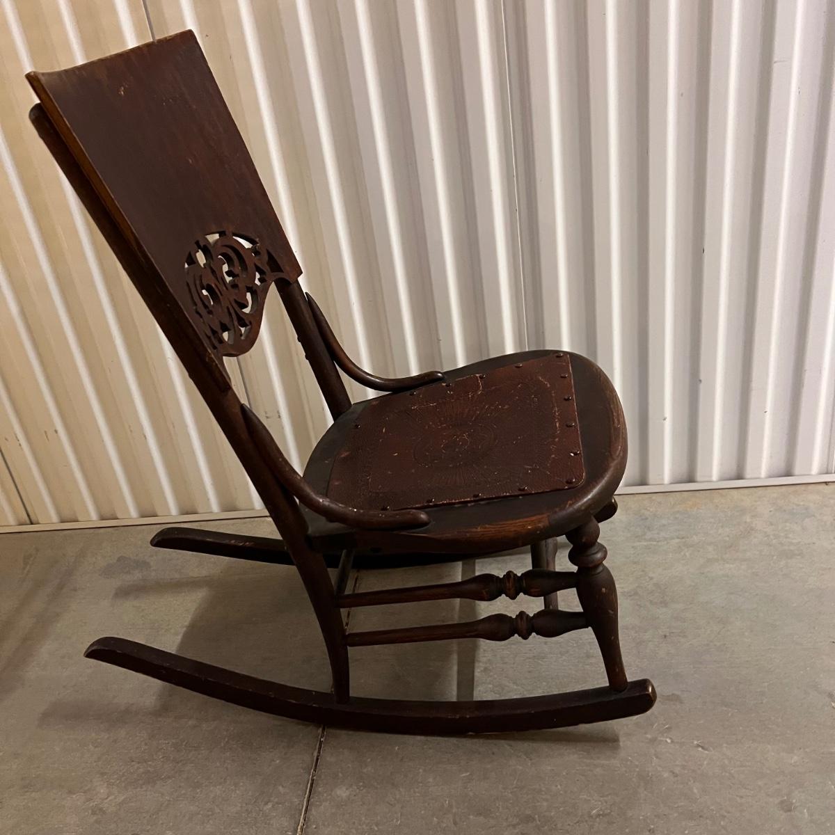 This solid wood rocking chair has a seat that appears to be leather and intricate carved details in the tall back of the chair. Measures 18” x 31” x 34”H with 15” seat height. Marked Spaulding Fiber Products on bottom.