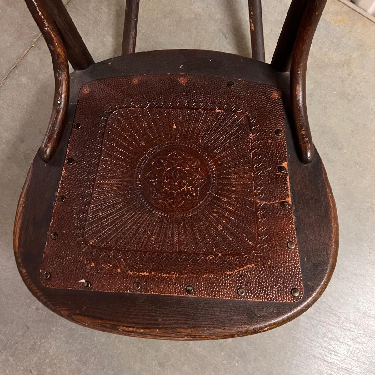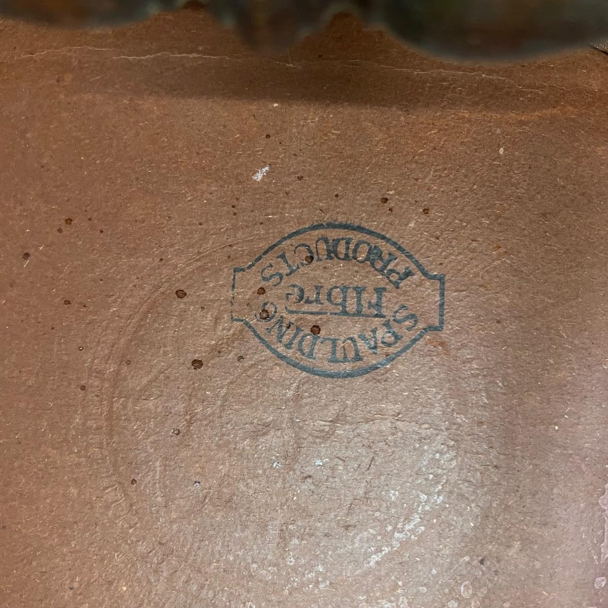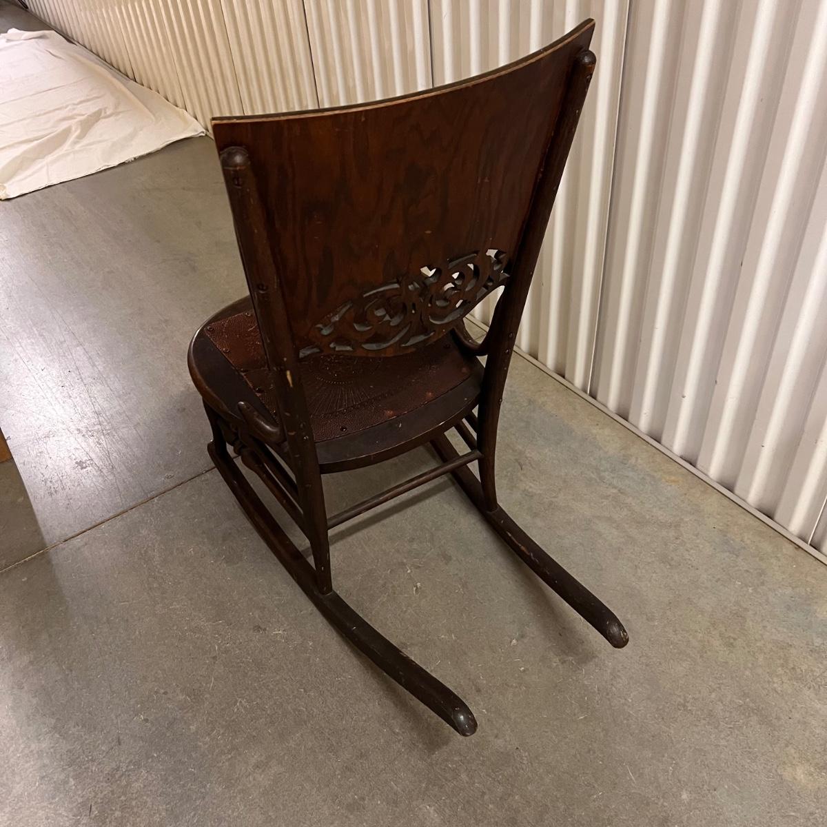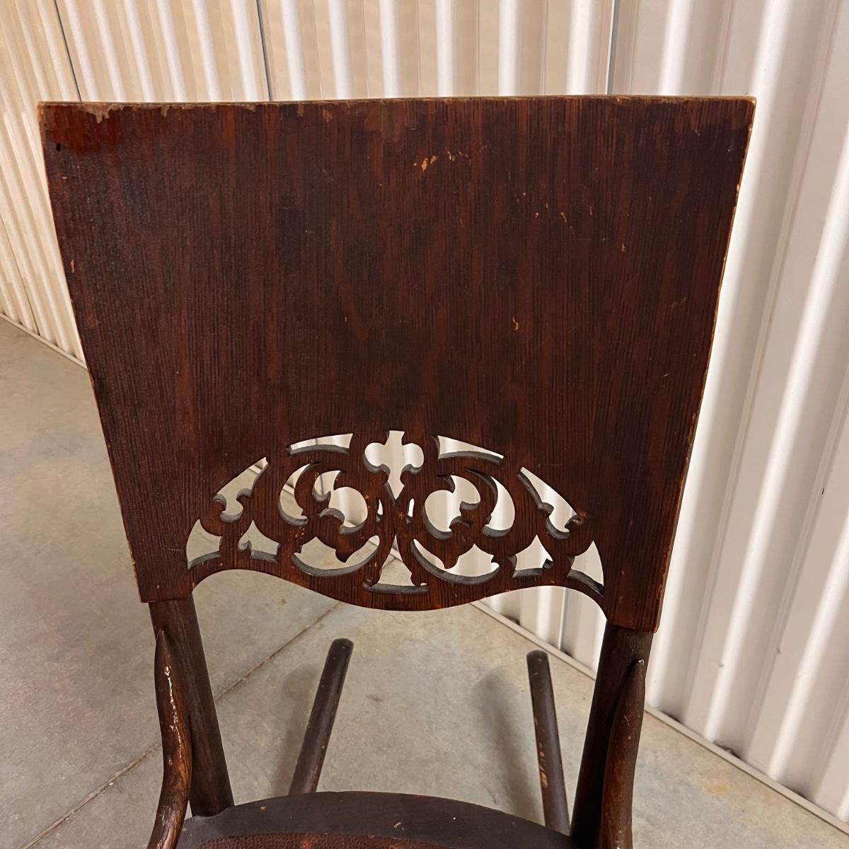 This solid wood rocking chair has a seat that appears to be leather and intricate carved details in the tall back of the chair. Measures 18” x 31” x 34”H with 15” seat height. Marked Spaulding Fiber Products on bottom.