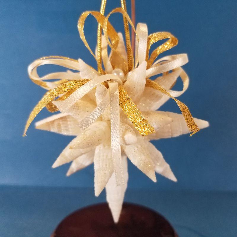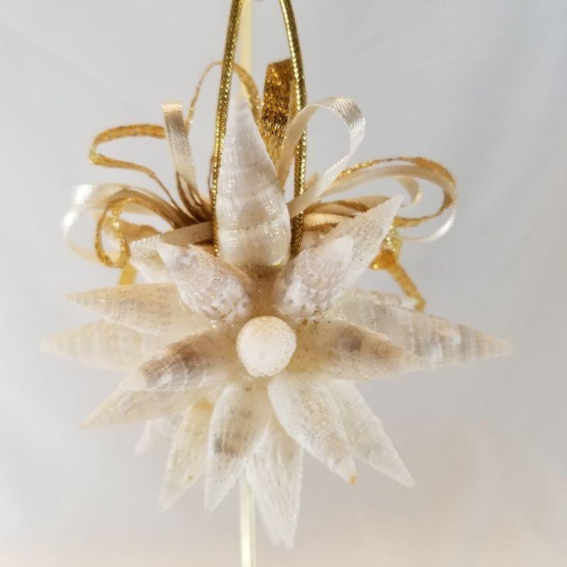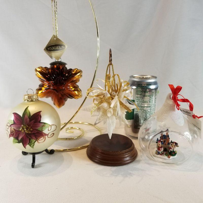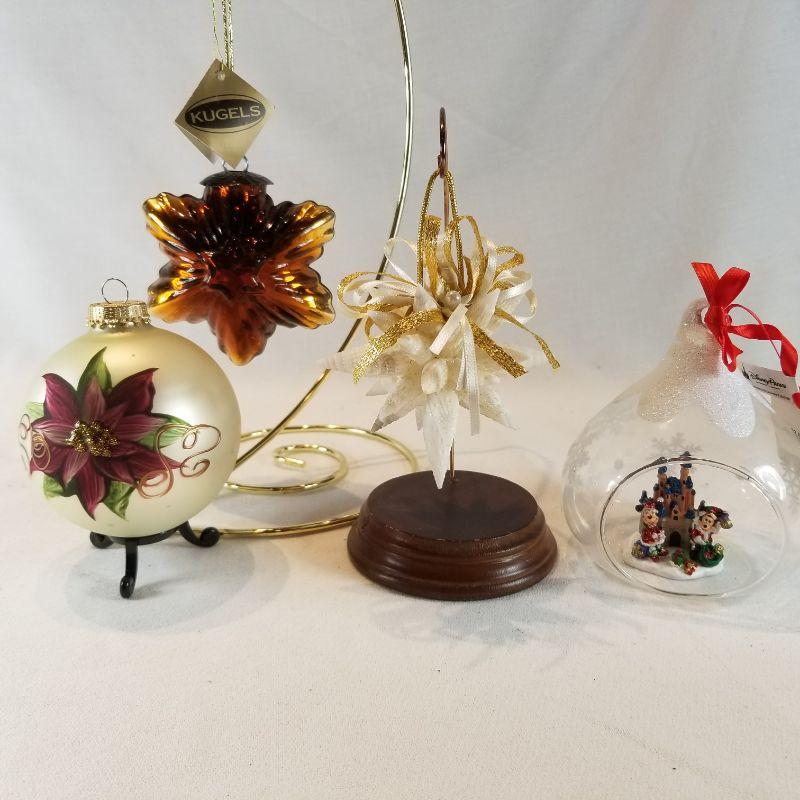 Set of 4 very special ornaments. The large glass star is a German Kugel, the Ivory ornament is a hand-painted Poinsettia, the middle ornament is a hand-made star using sea shells and ribbon - quite gorgeous and the fourth is a hand-blown glass globe with Disney characters - very cute. All are in very good condition and appear to be new. Ornament stands are NOT included.
