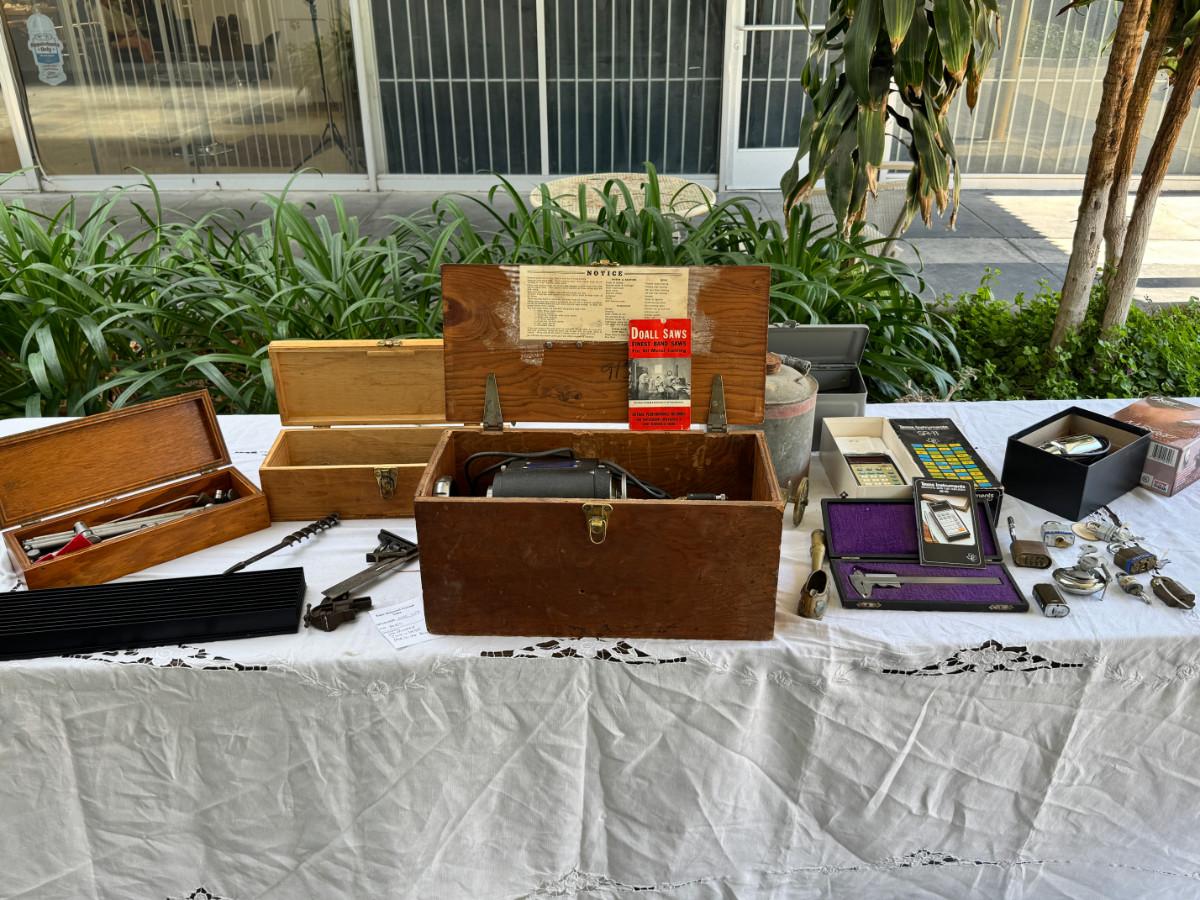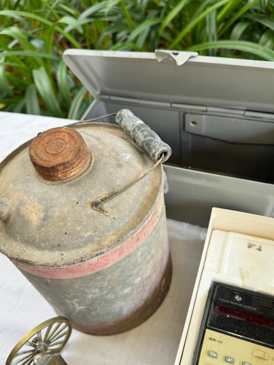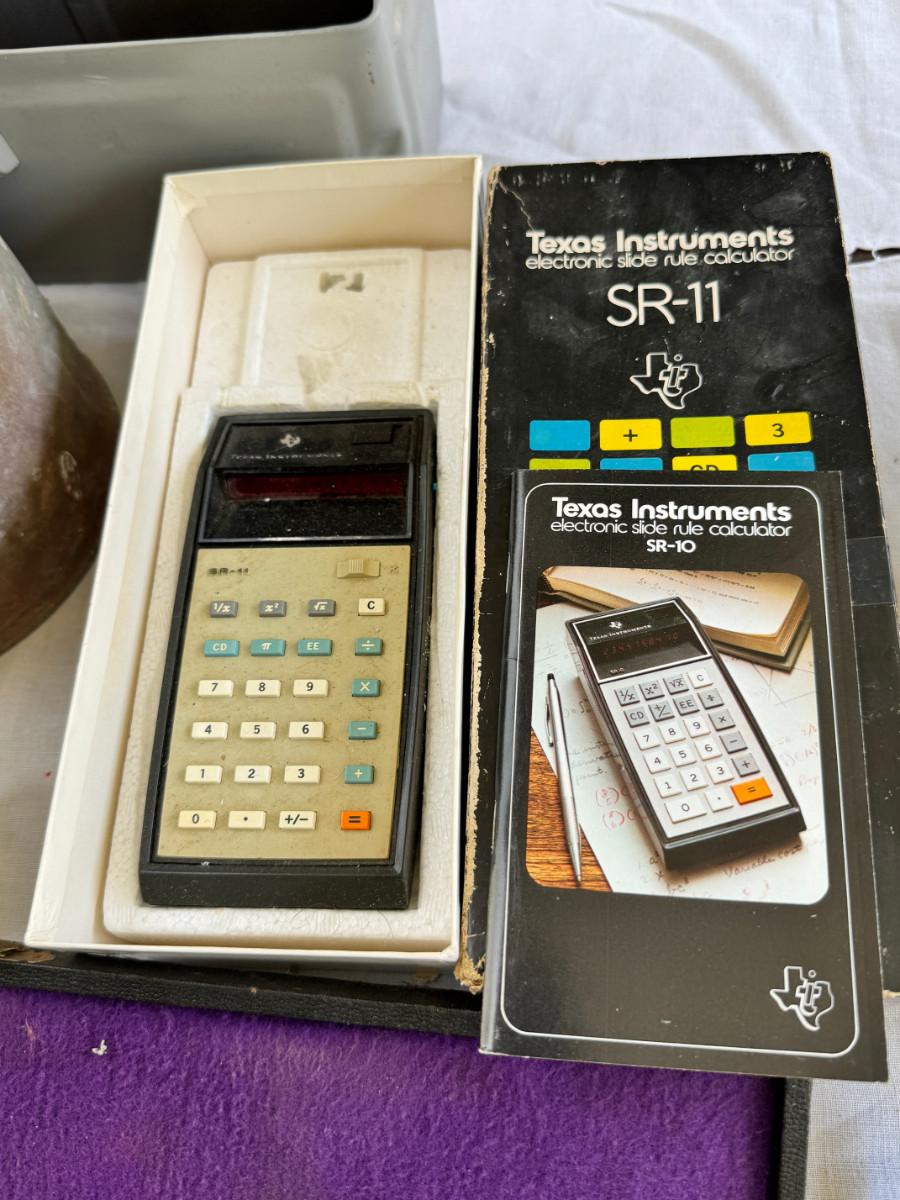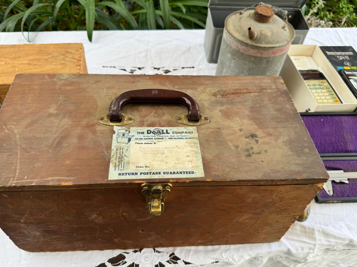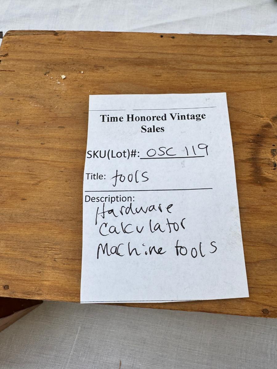 TI calculator, untested, Very heavy DoAll machinist tool, tested it does run, Calipers, drill bits, Tool Box, Locks and keys. No Shipping