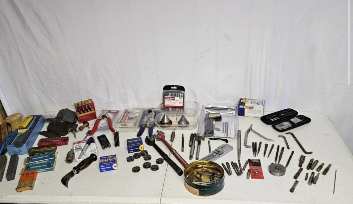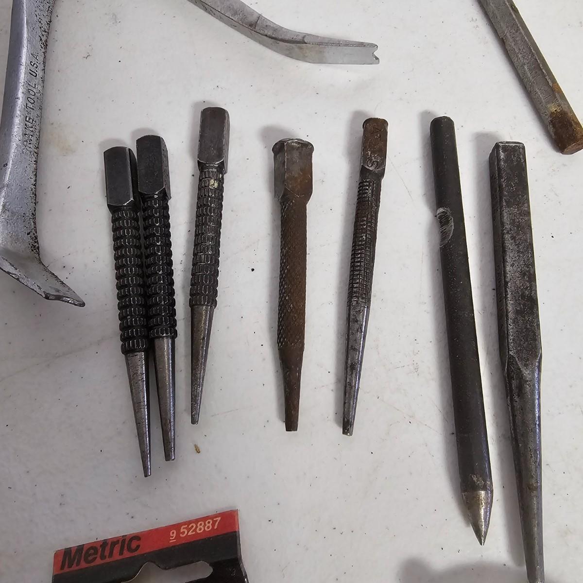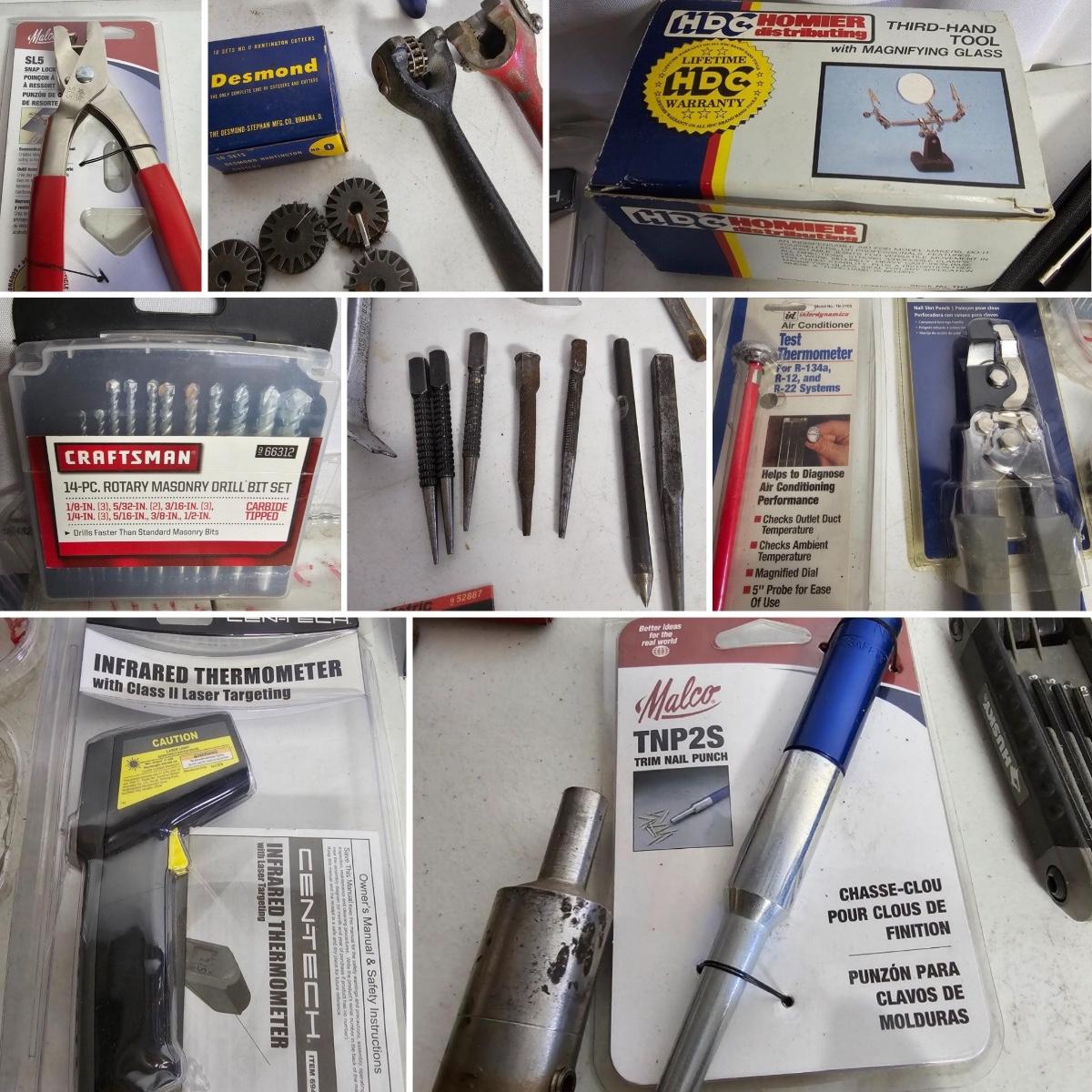 Tools to use in special areas. Drifts, punches, tap & die parts, lathe cutters, balances and more. Some items well used. Laser item not tested. See photos for inventory and details. Shipping available.