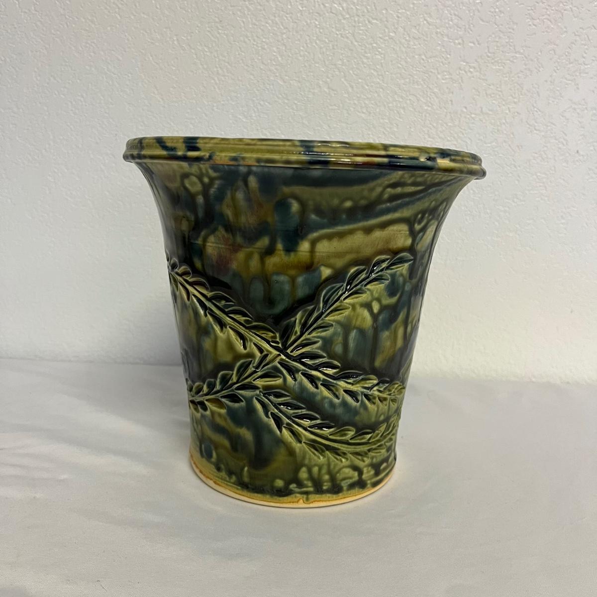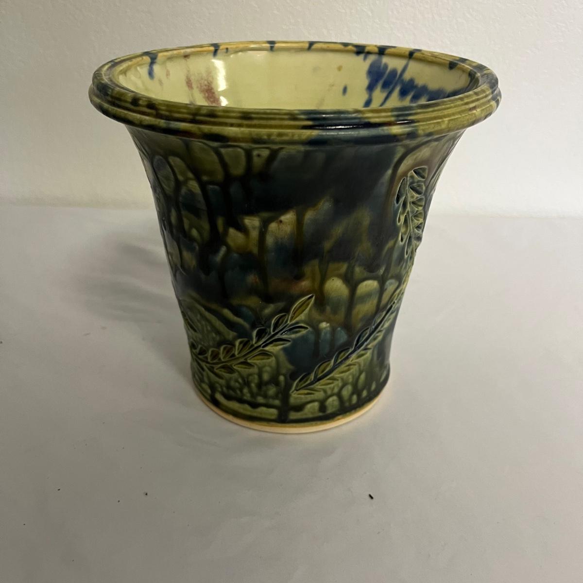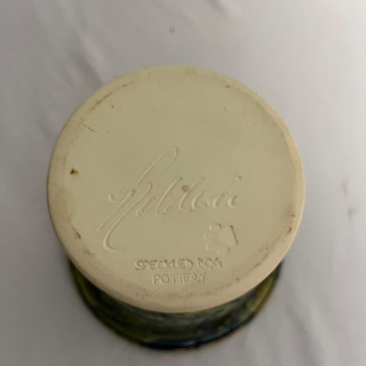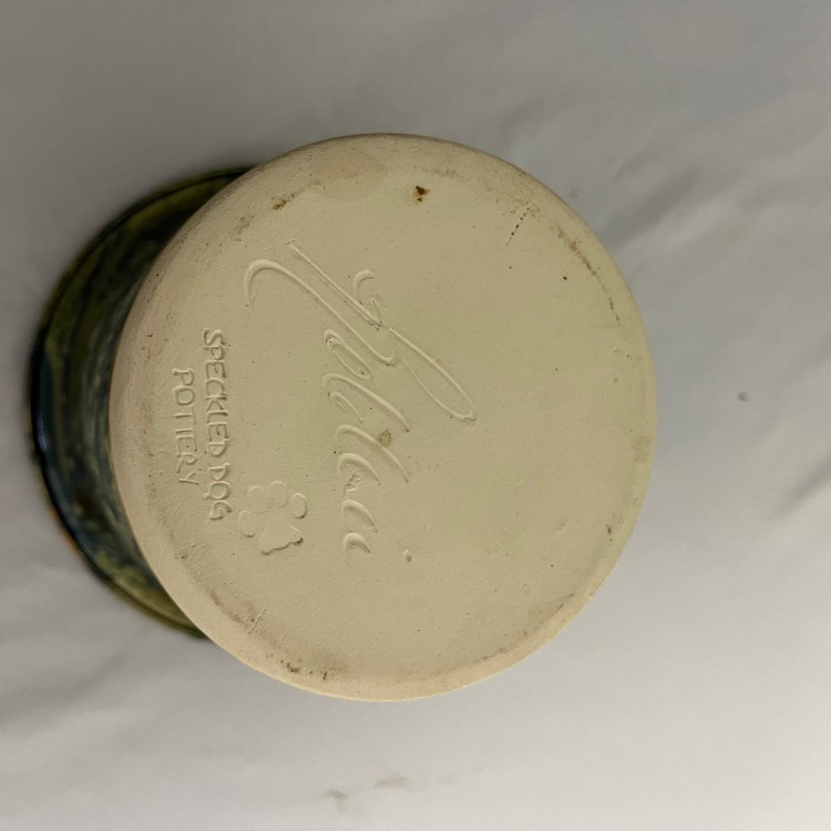This pot is signed and marked Speckled Dog Pottery. Pot measures 7.25”D x 6.75”.