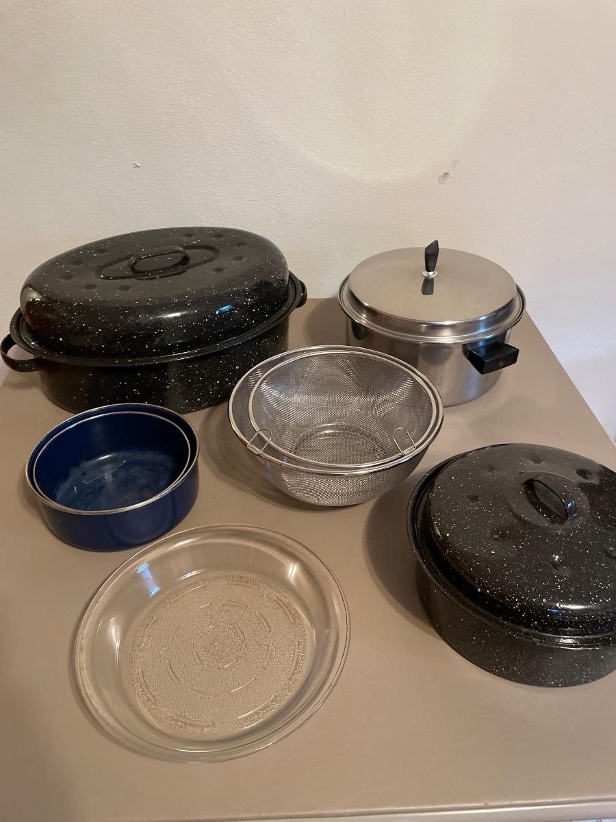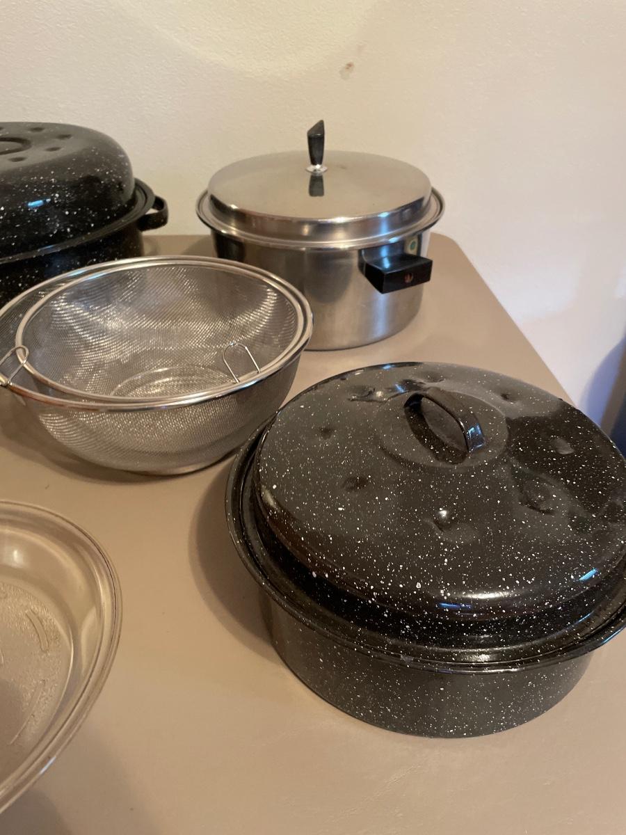 Speckled enamel roasters and cookware