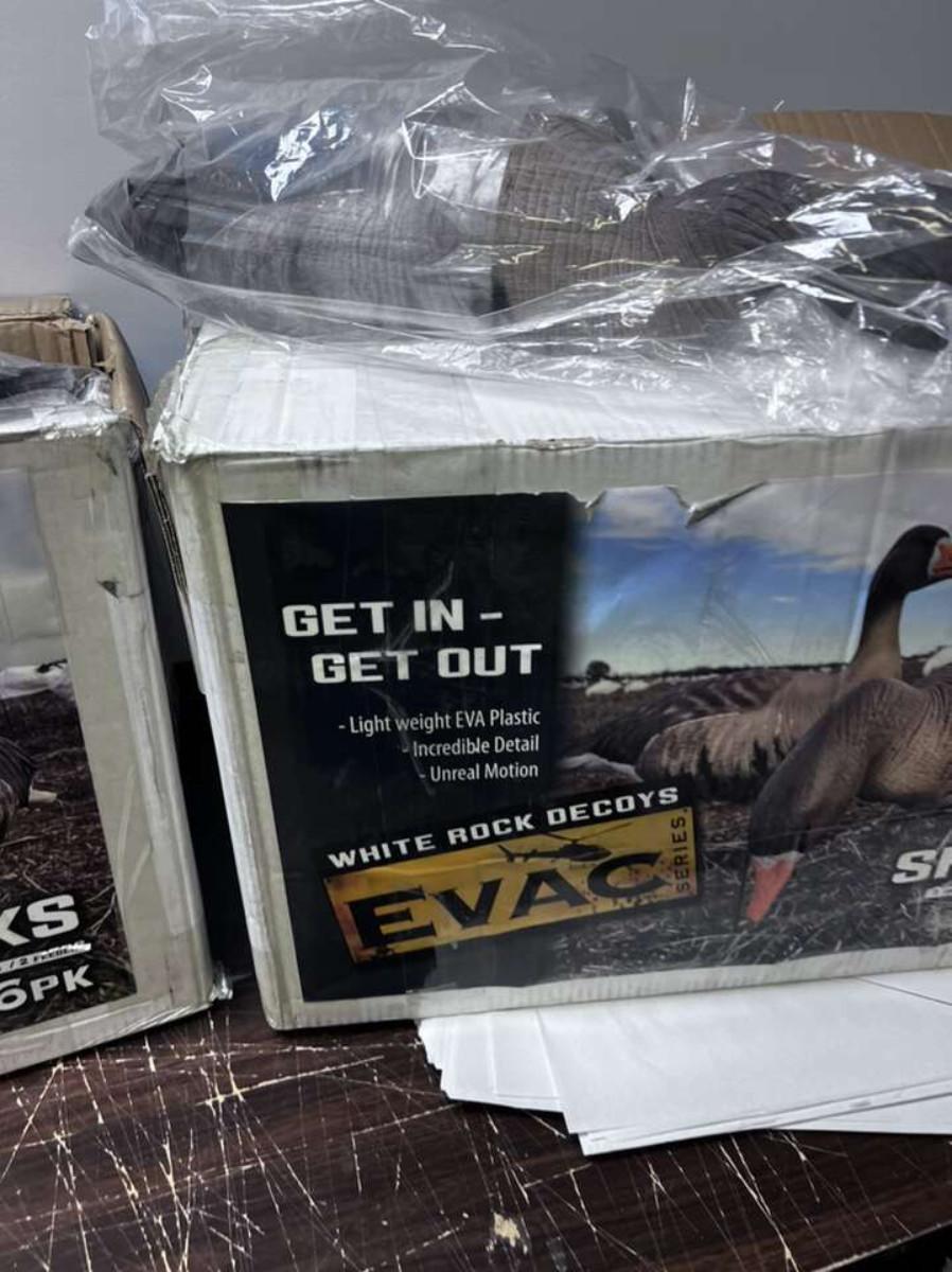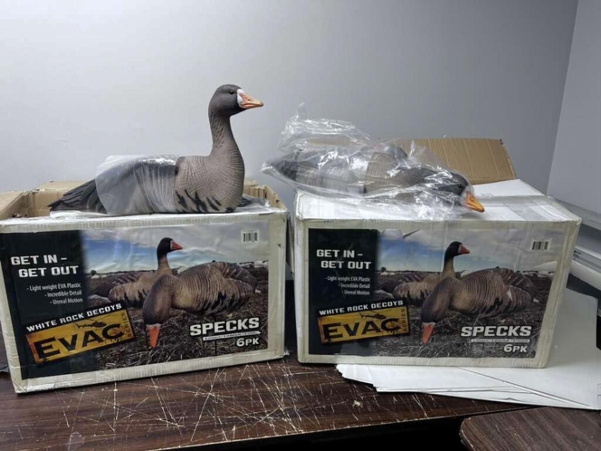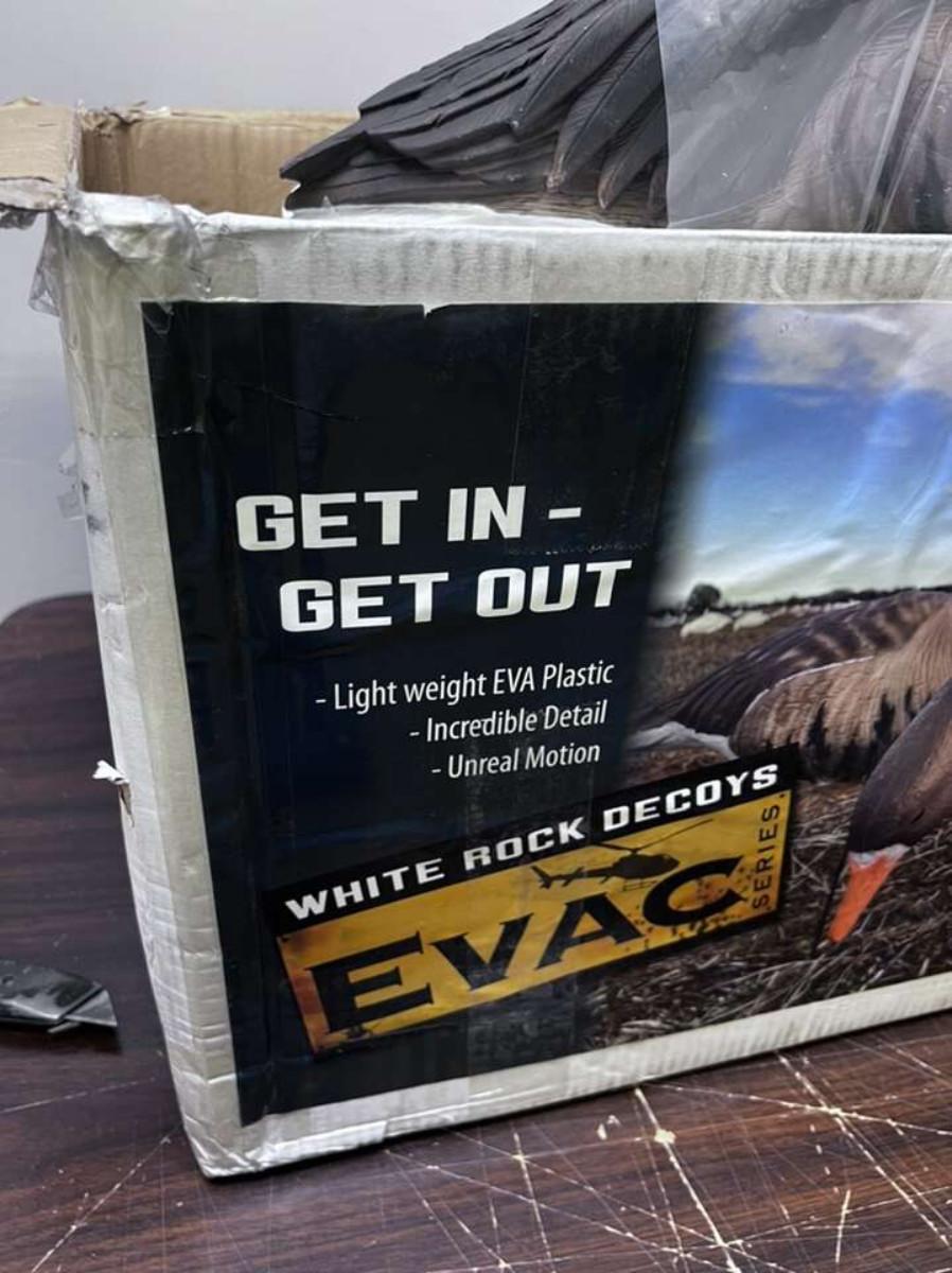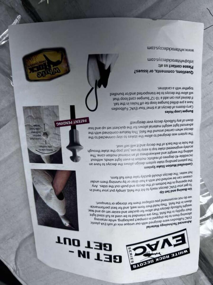 Two boxes of 6 decoys NEW in the box. Stakes included. White Rock Decoys EVAC Series field decoys.