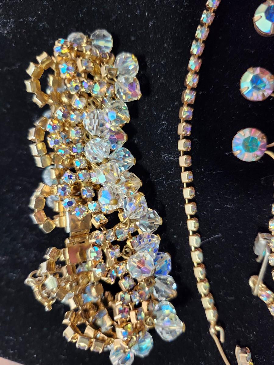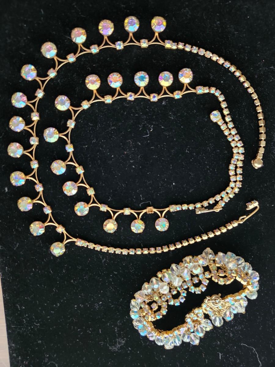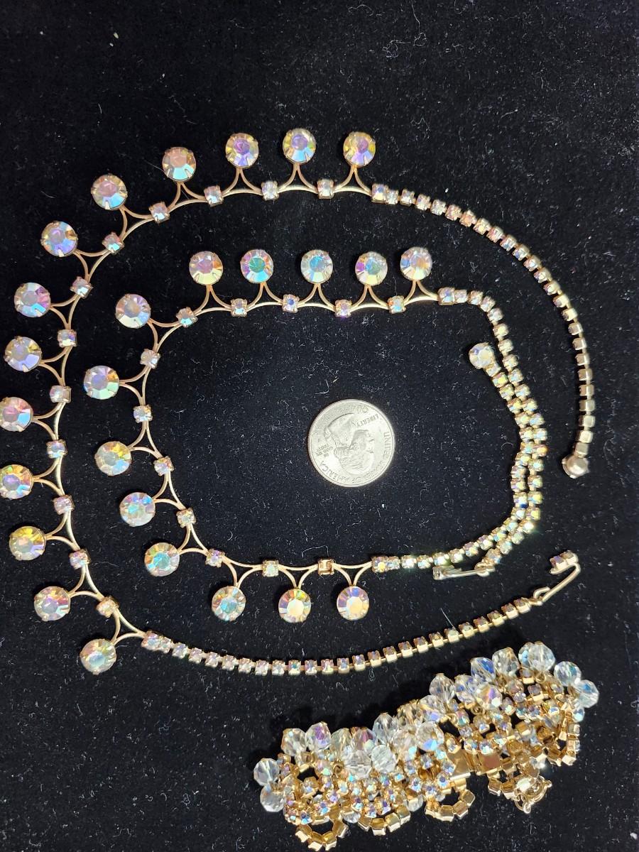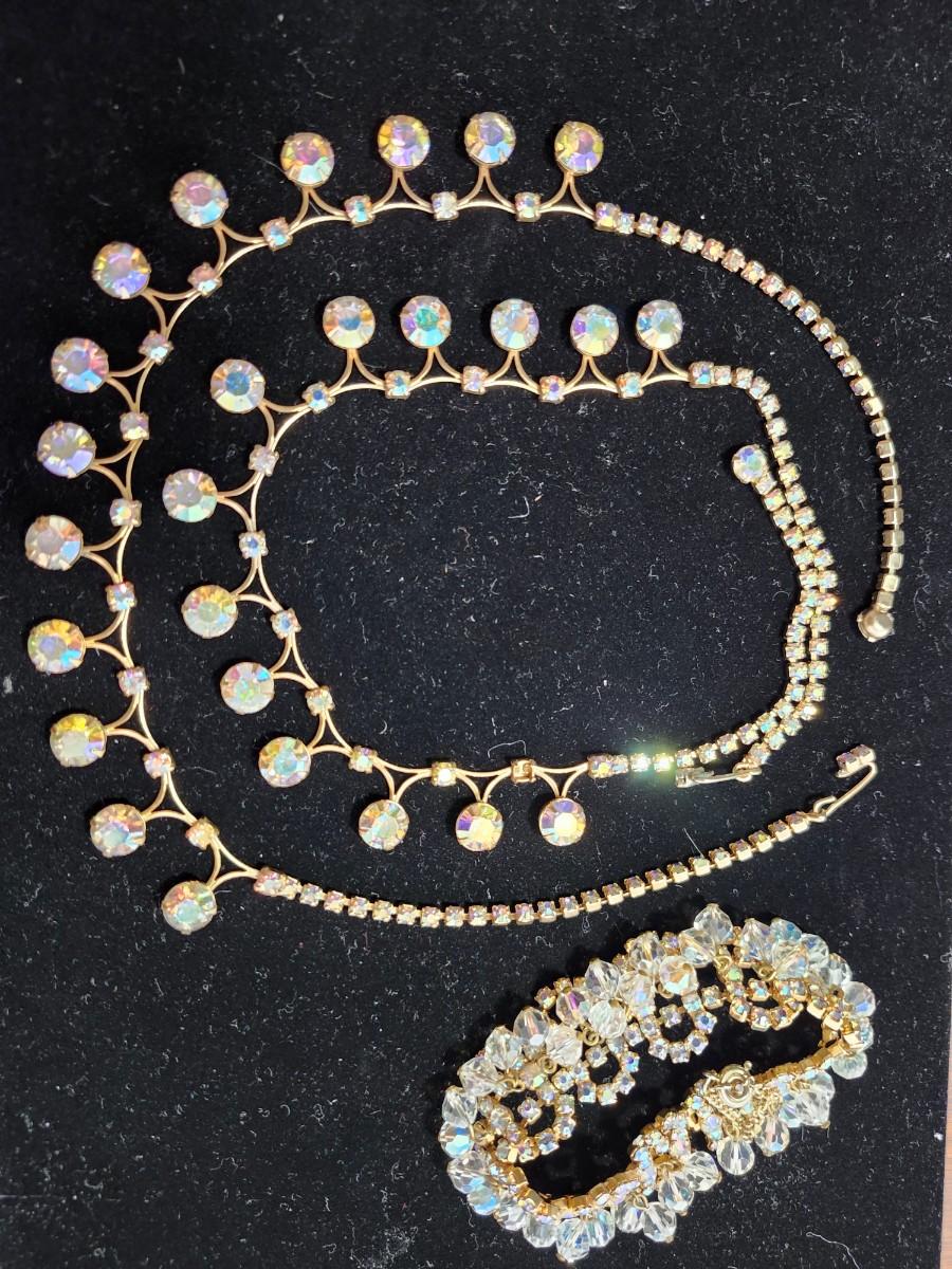 There are 2 chokers and 1 bracelet in this set. The chokers could be worn together or alone. Gold tone backing.