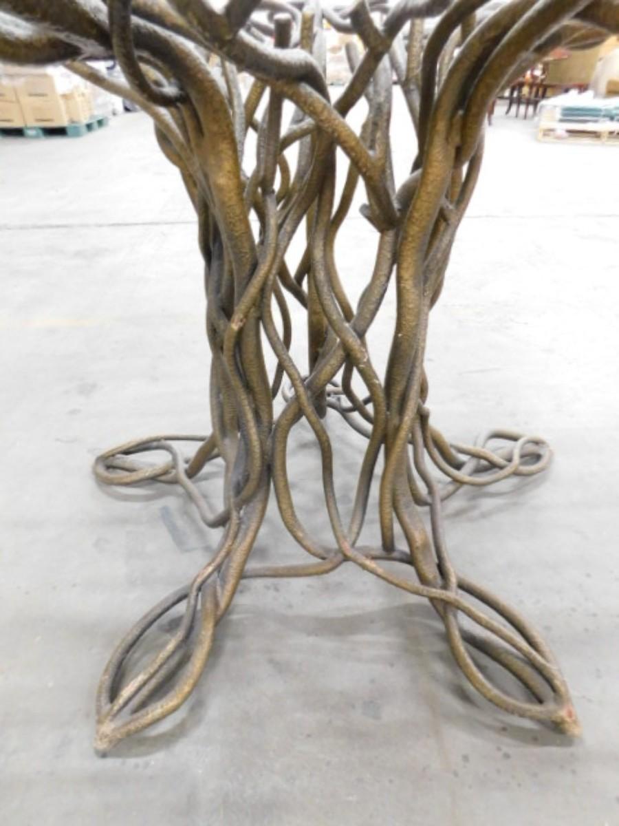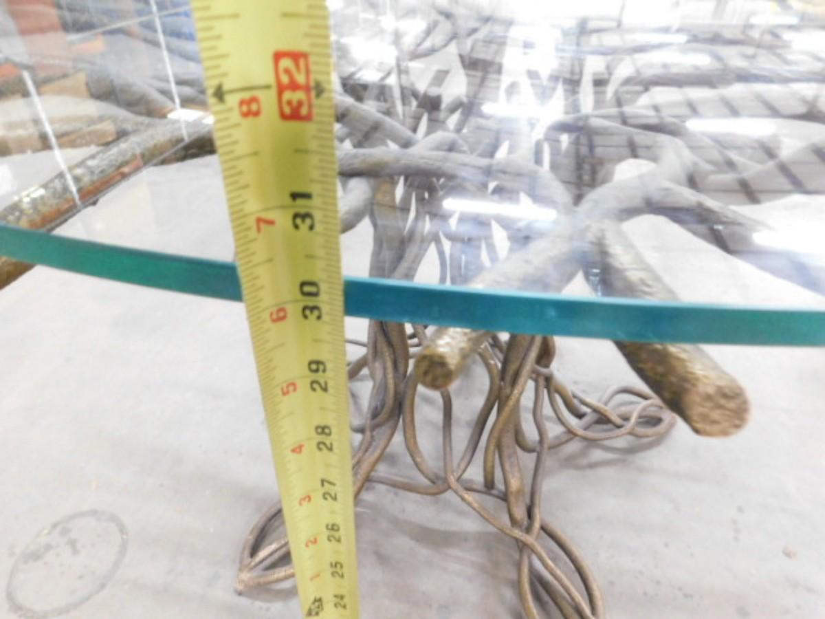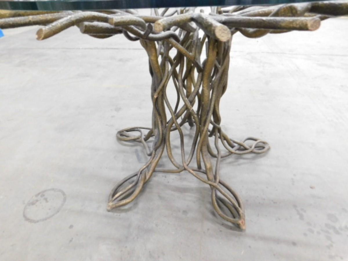 Spectacular Contemporary Design 48" Solid Metal 'Tree Branch' Base Glass-Top Chair Height Table Choice #2 of 2. Stunning cabin piece or landscape art furniture. Base has a brass rod texture and is solid and requires two people to pick up. Glass removes. Expect some wear or scratches to finish. Shipping option available via freight or local mover at Buyer's expense. Buyer must have all shipping scheduled within the stated dates and times of pickup. Recommended local mover is Beaty Bros. Moving 828-201-2982