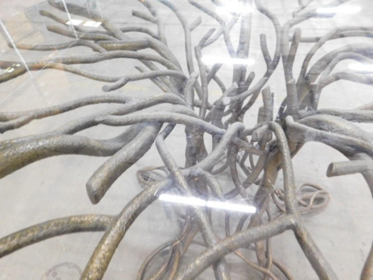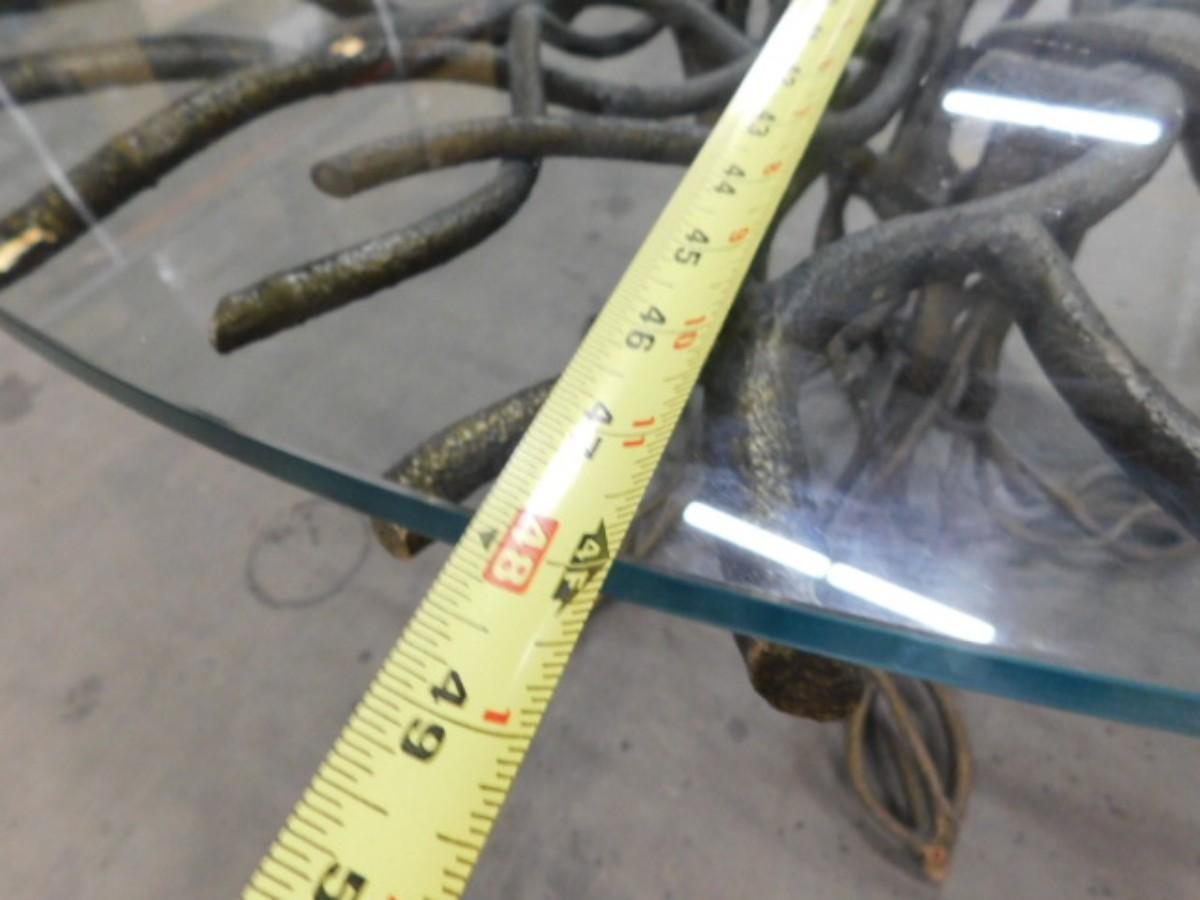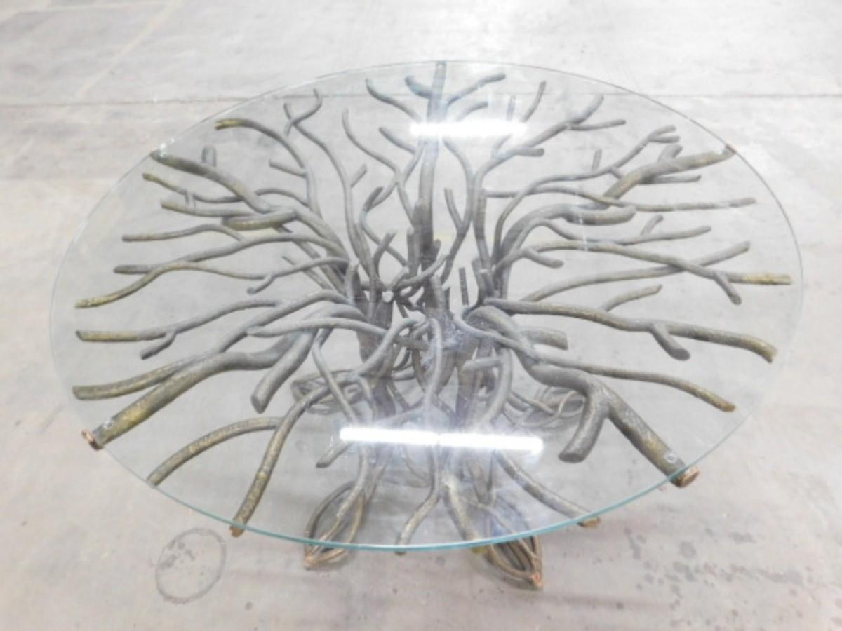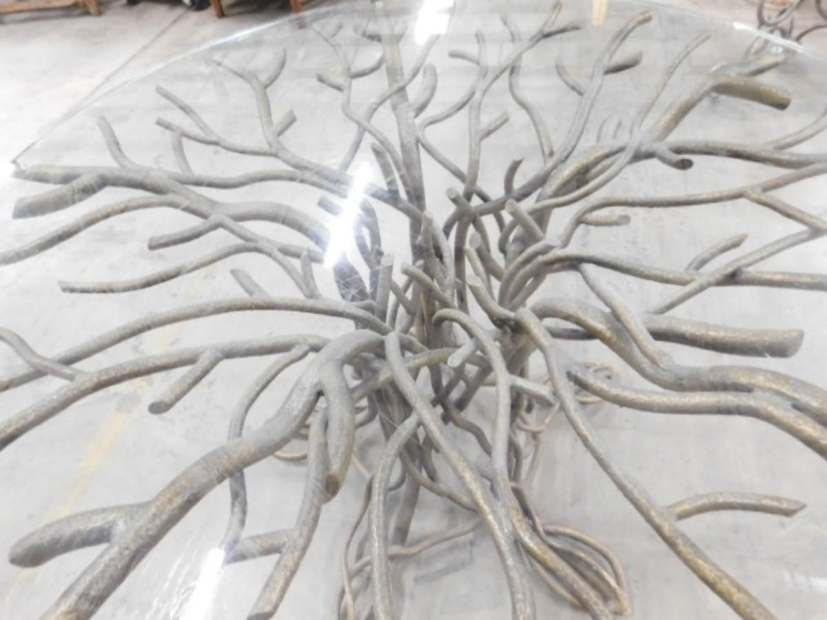 Spectacular Contemporary Design 48" Solid Metal 'Tree Branch' Base Glass-Top Chair Height Table Choice #2 of 2. Stunning cabin piece or landscape art furniture. Base has a brass rod texture and is solid and requires two people to pick up. Glass removes. Expect some wear or scratches to finish. Shipping option available via freight or local mover at Buyer's expense. Buyer must have all shipping scheduled within the stated dates and times of pickup. Recommended local mover is Beaty Bros. Moving 828-201-2982