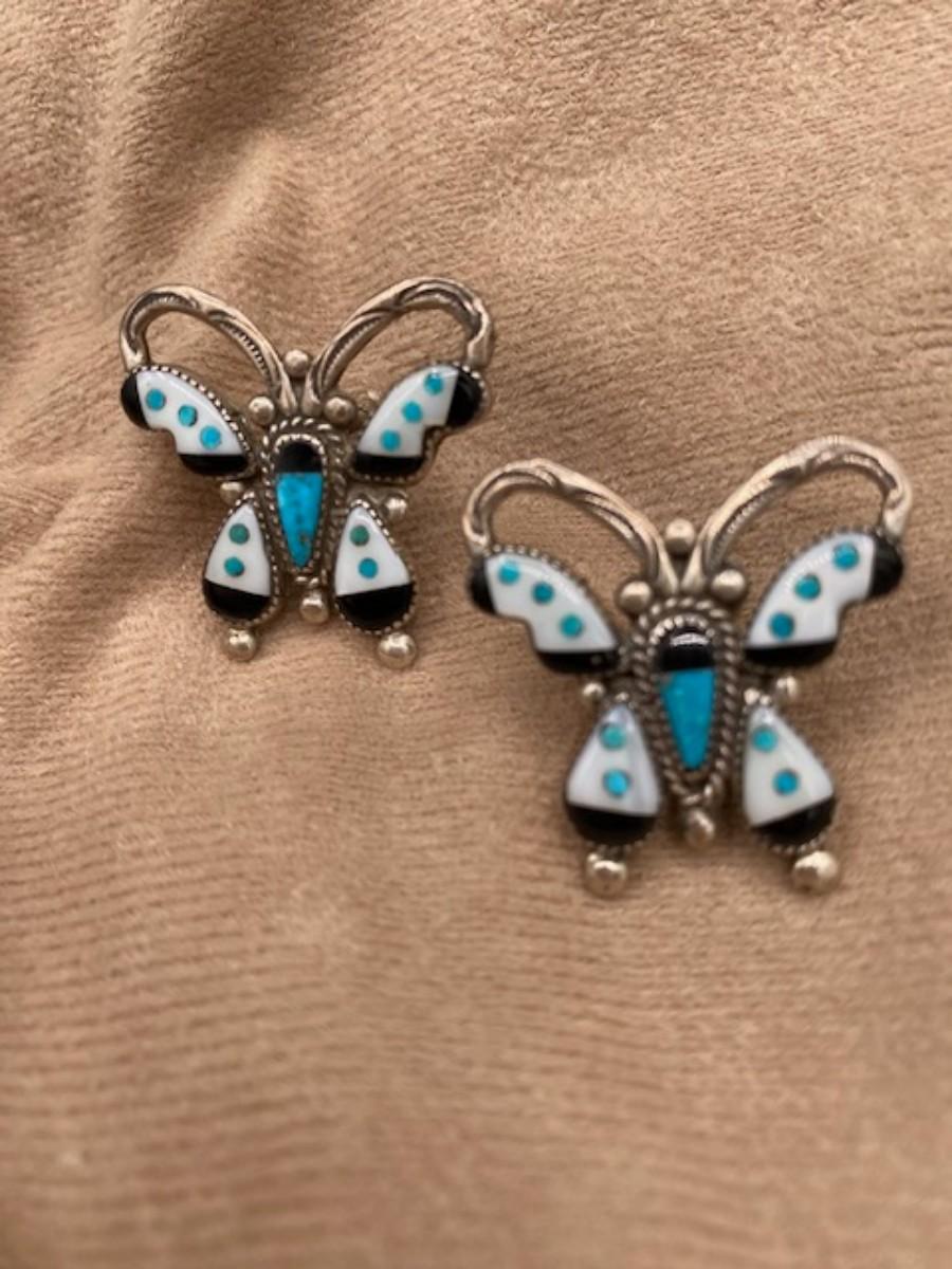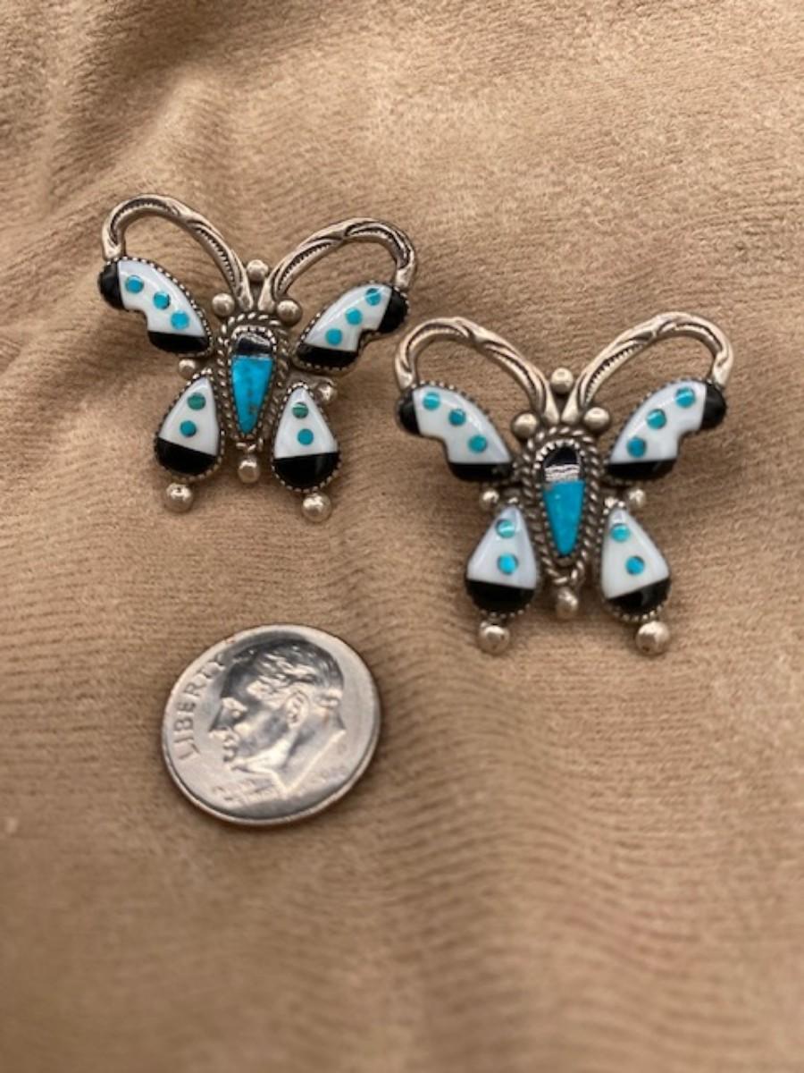 Screwback, vintage sterling butterfly earrings with turquoise mother of pearl, and jet inlay. Similar retail on these are in the $250 to $500 range. Very nice condition.