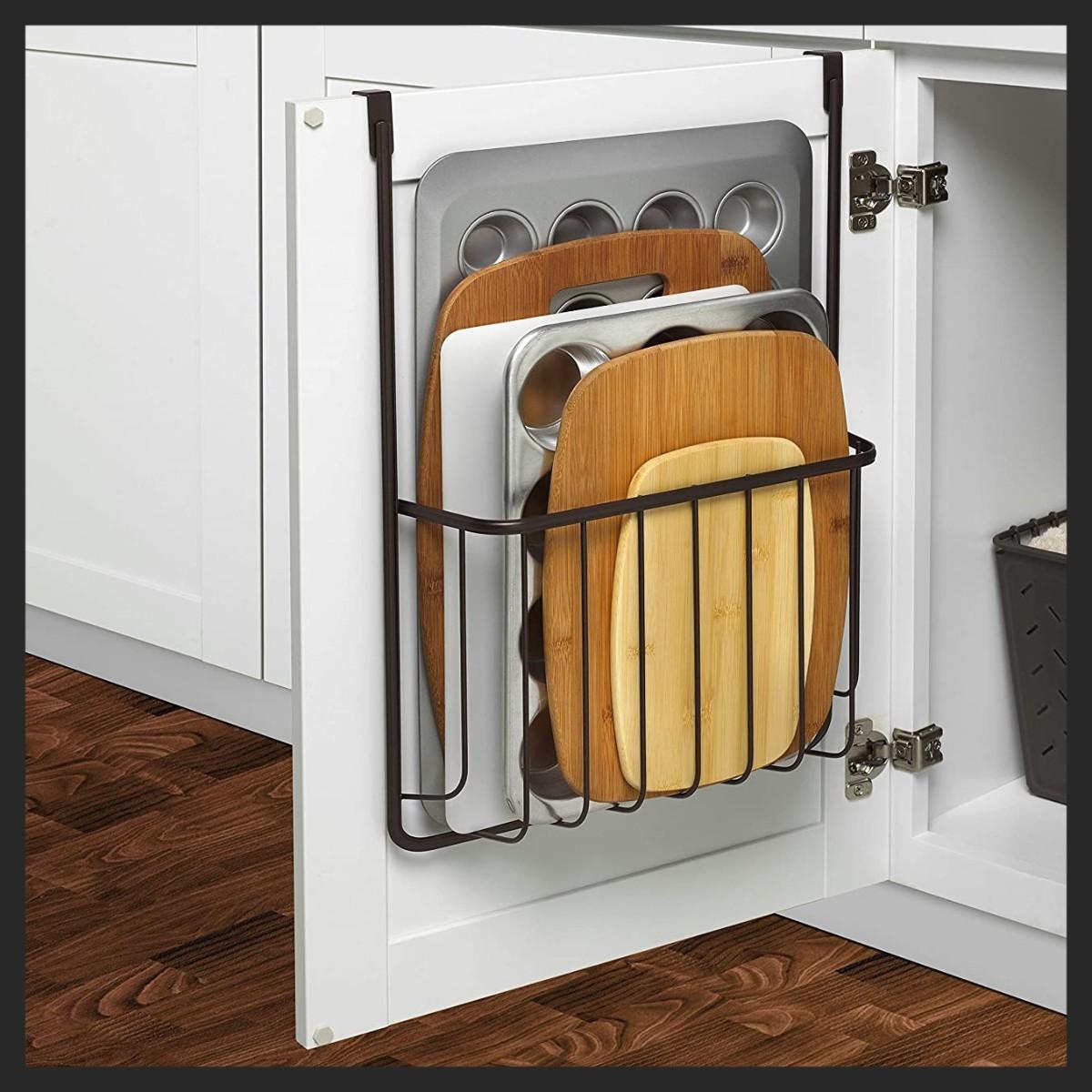 - Neatly organizes cutting boards, bakeware & more