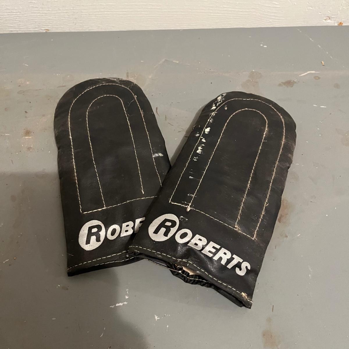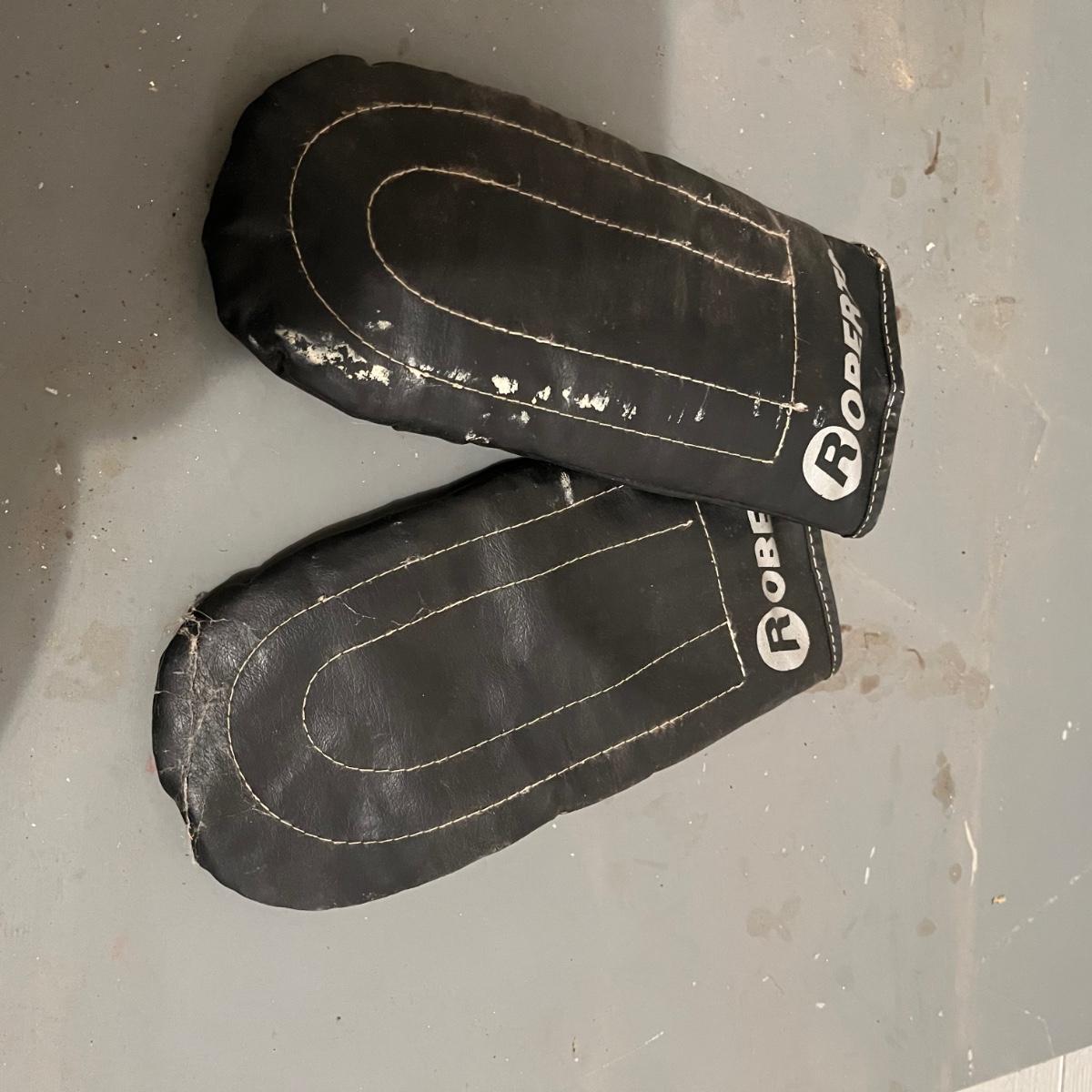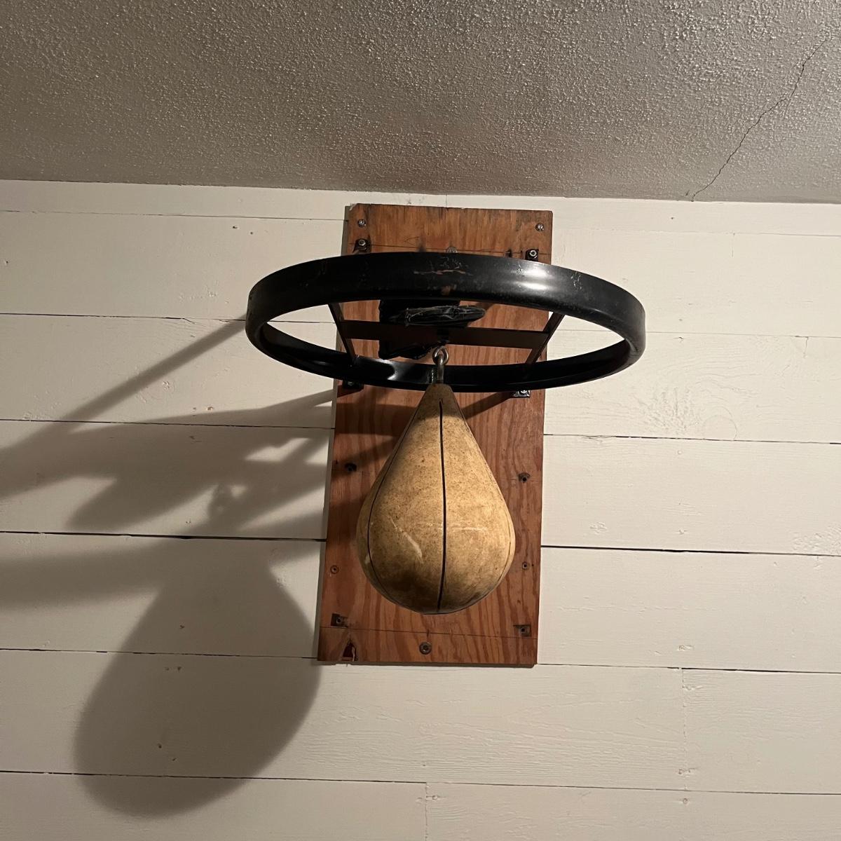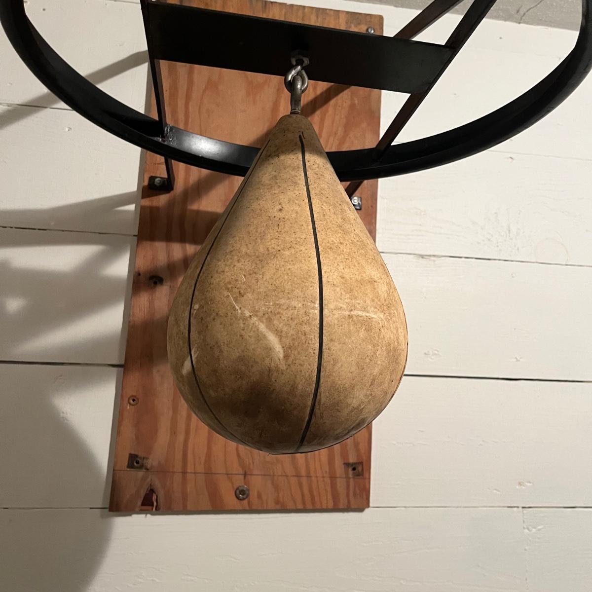 Lot includes a speed bag with metal frame mounted on a piece of plywood. Also includes a pair of Roberts gloves. Mount will need to be taken down by winning bidder amd will require a drill with a.flat head driver. Mount with plywood measures 19” x 24” x 30.5”.