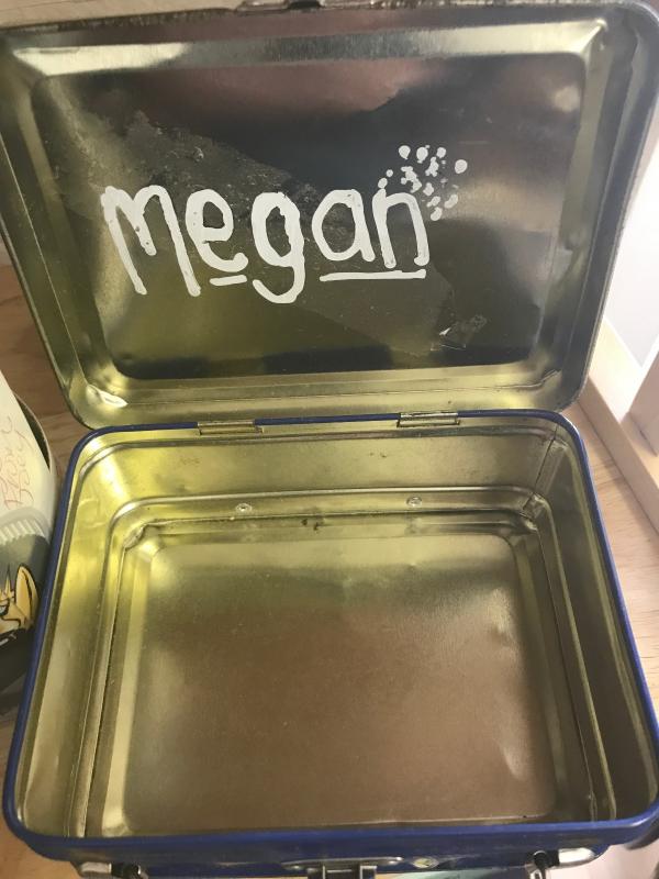 The bobble head has dust in the inside. Extra bonus if your name is" Megan" as thie metal lunch box will be personally engraved (probably white out?) with your name!