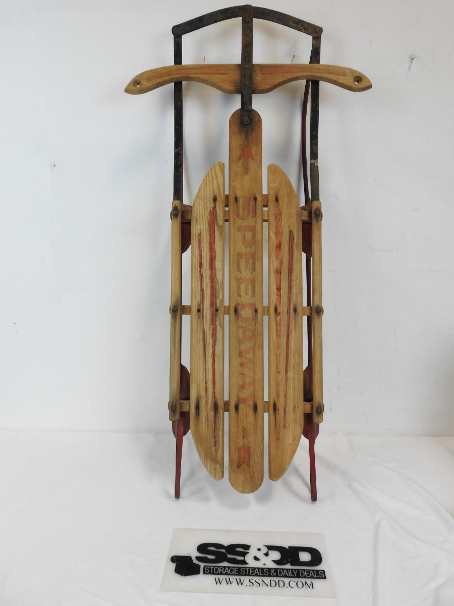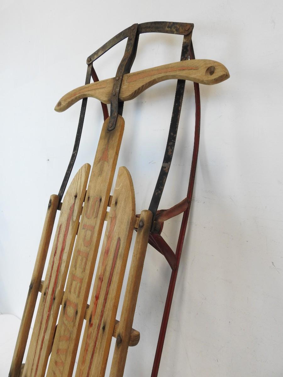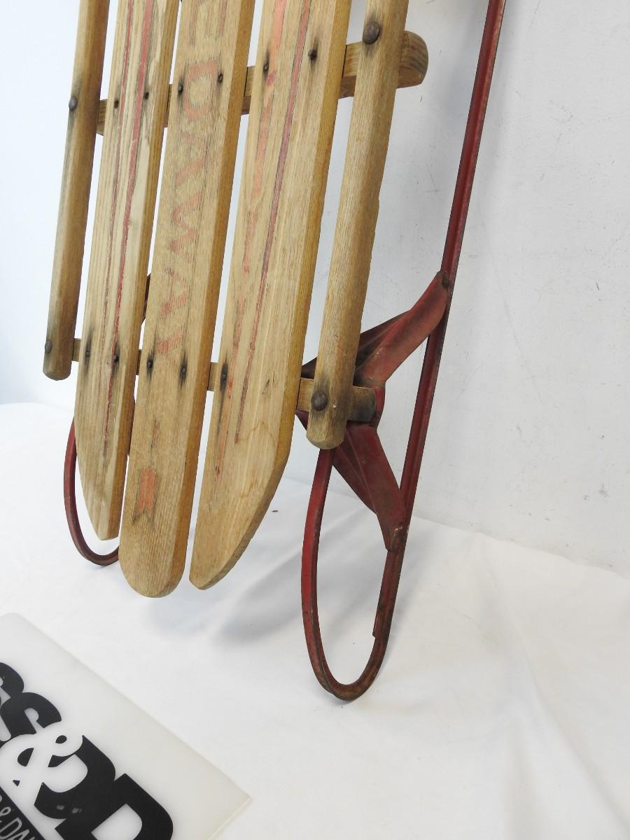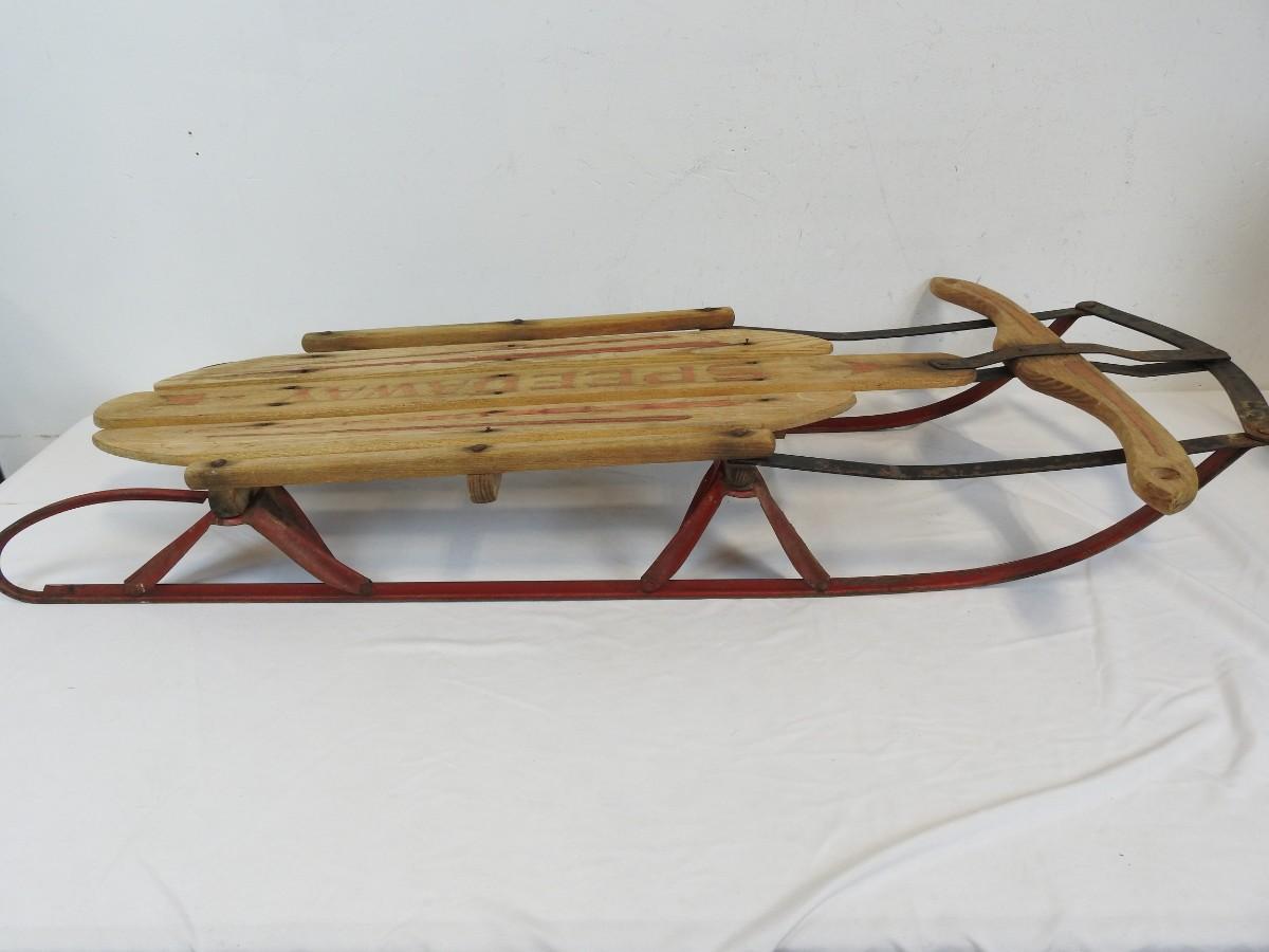 Speedway Snow Sled, Metal & Wood. Black, Brown & Red. Vintage