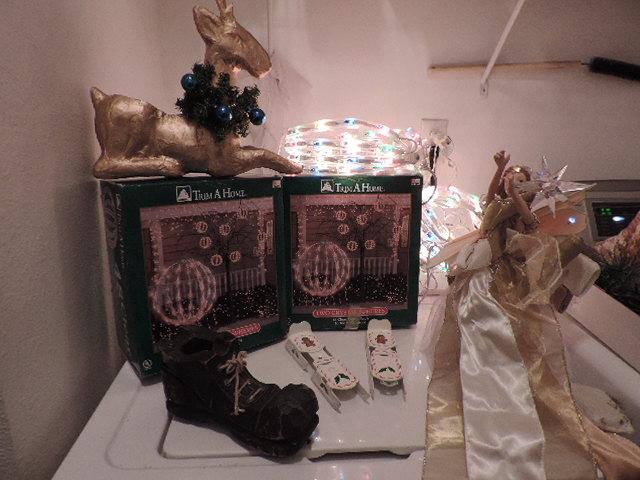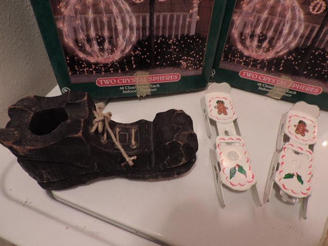 4 MULTI COLOR SPHERES, ANGEL TREE TOPPER, WOOD SHOE. AND MORE