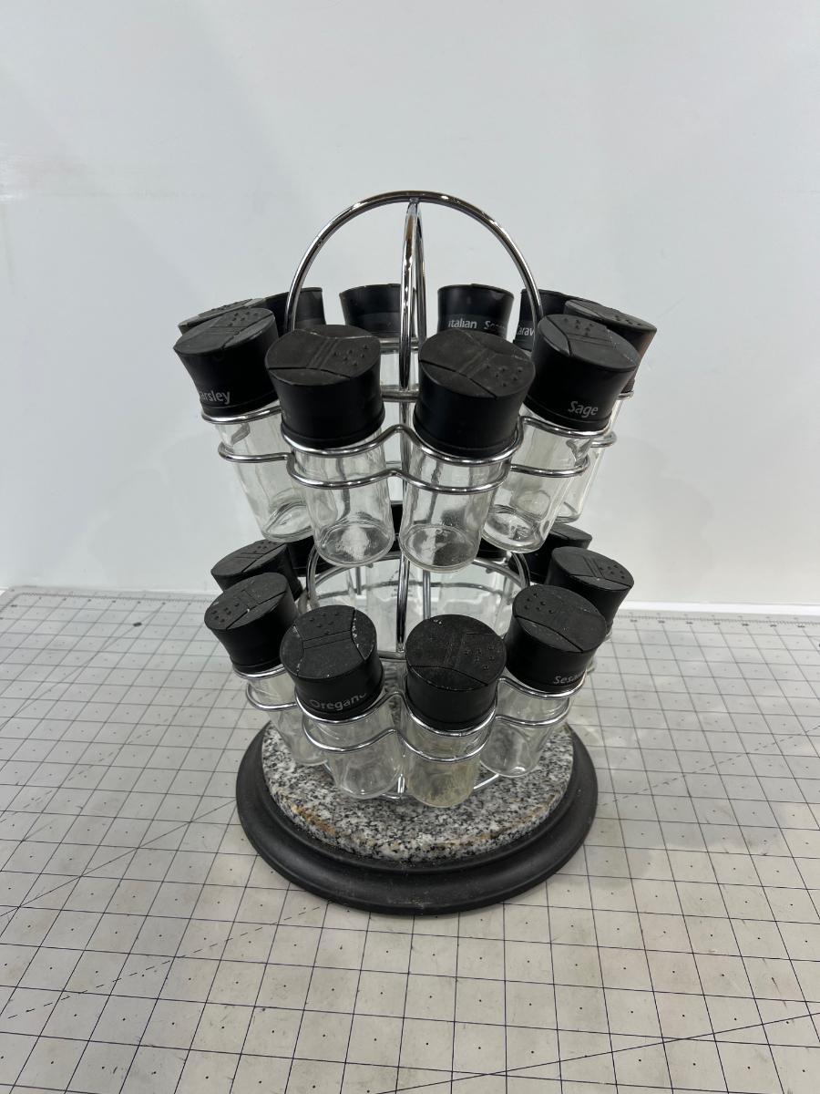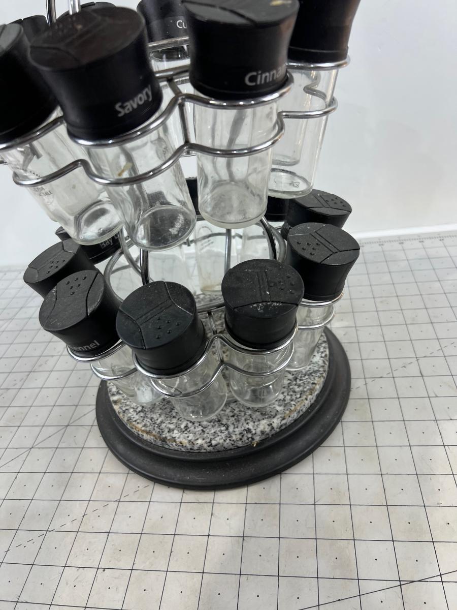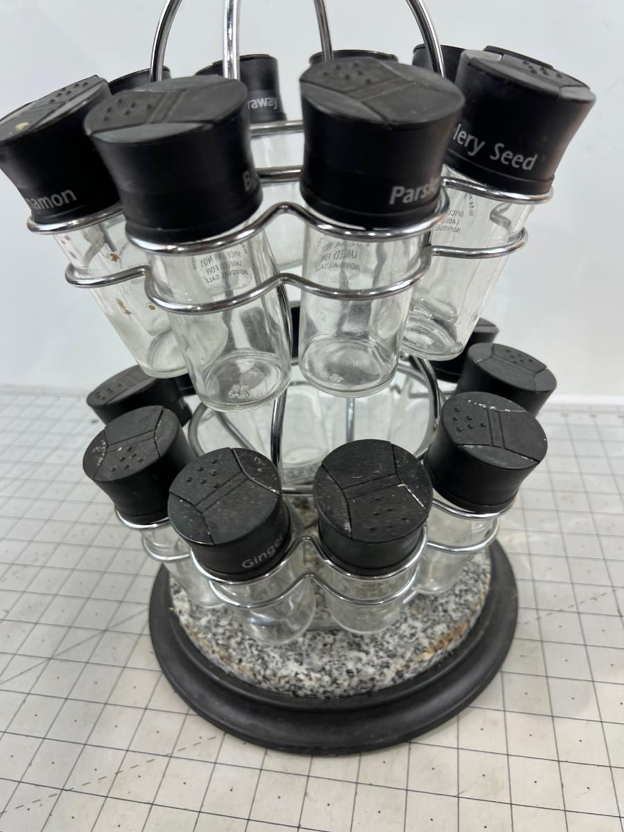 Used. Rotates with Lazy Susan on base. Glass Bottles with Plastic Tops.