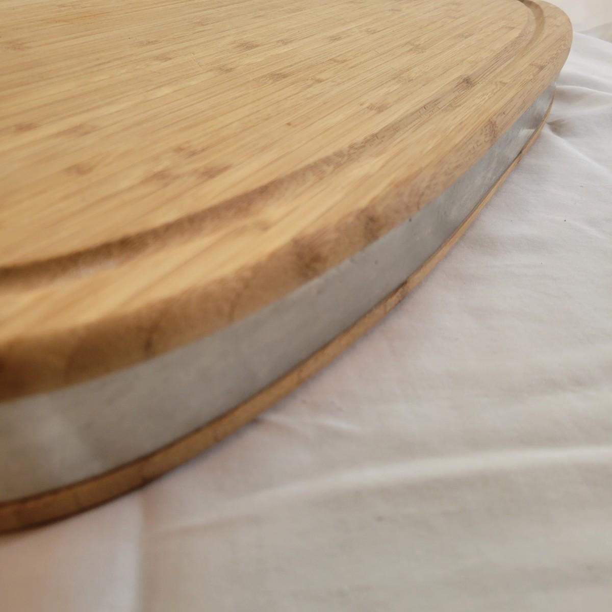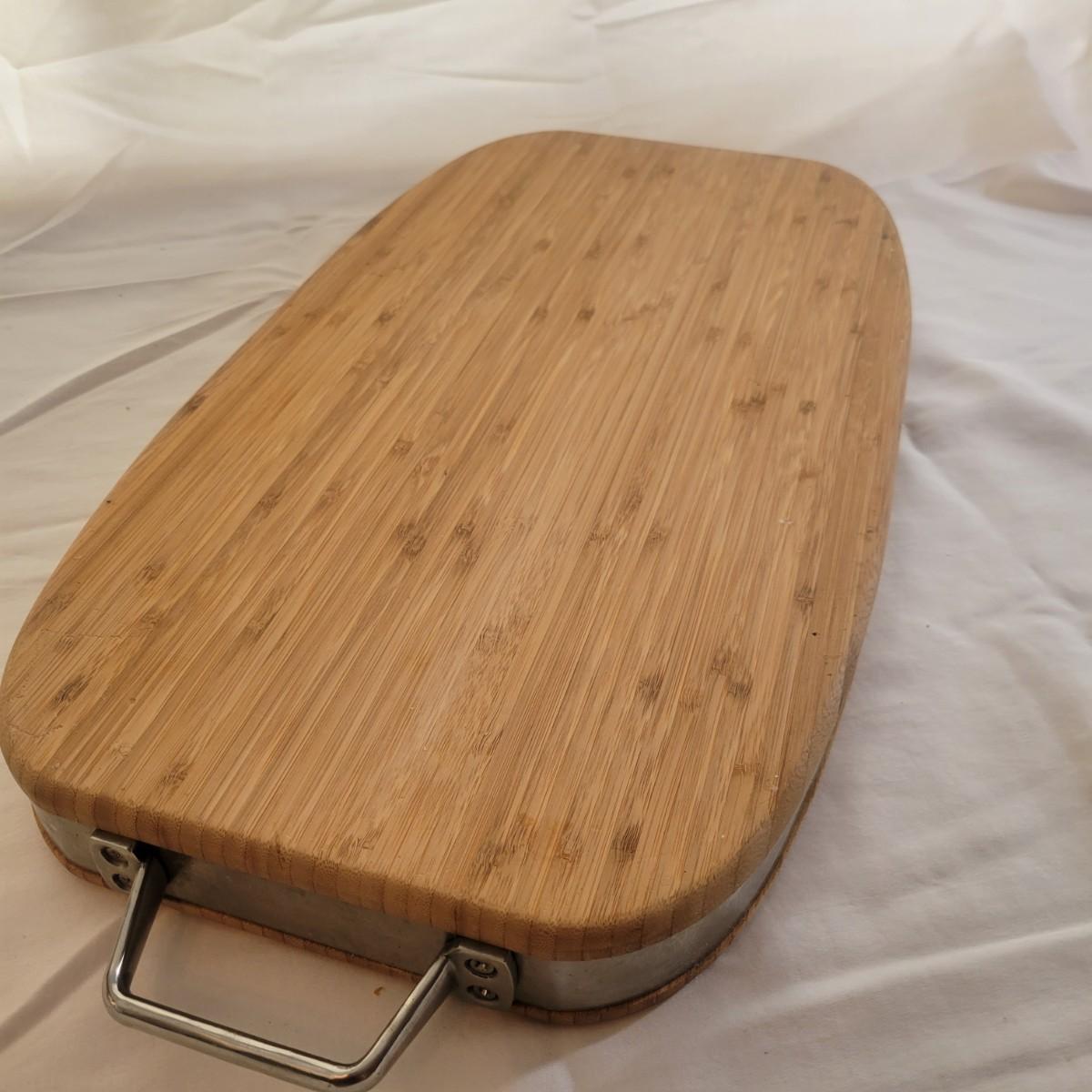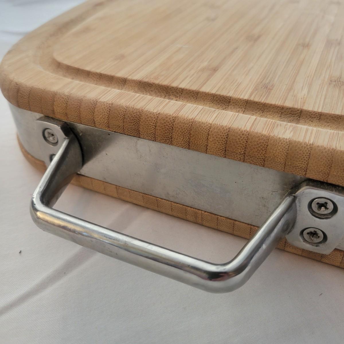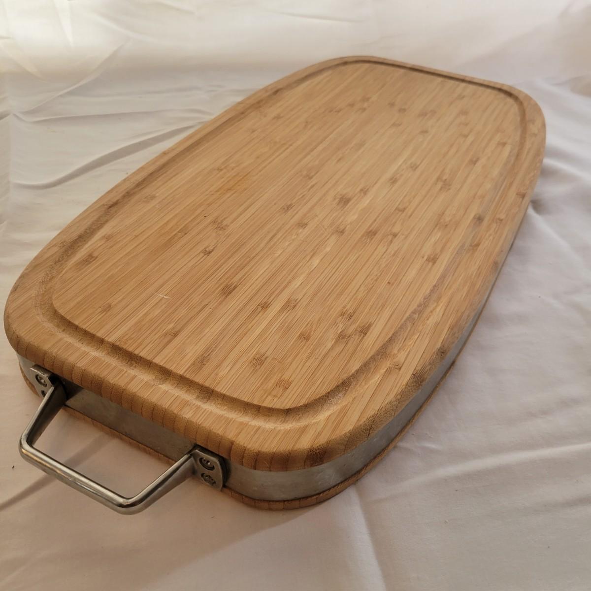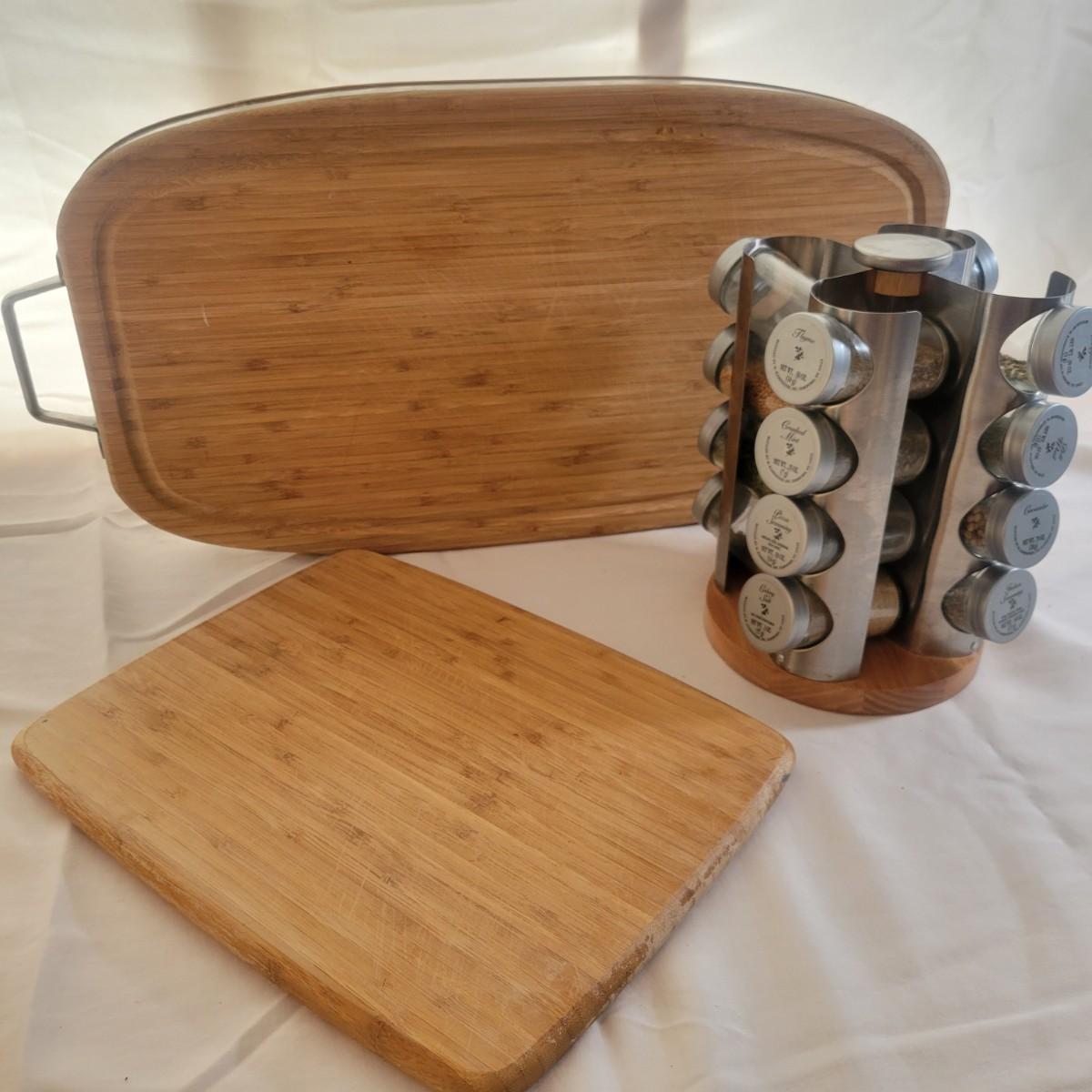 A round spice rack and two cutting boards in good condition, but showing standard wear. The spice rack holds 16 different spices, is made of metal and wood, and revolves. Does include some spices, but no expiration date and we cannot verify the contents. Also includes two wooden cutting boards. One is a smaller standard board that has some minor cut marks and burns. The larger board has a metal wrap with metal handles and juice trough. Board appears to be bamboo and measures approximately 25" x 12" x 2". Shipping available. Shipping can be costly. We suggest calling our local UPS with dimensions and getting an estimate before bidding: (828) 252-6930.