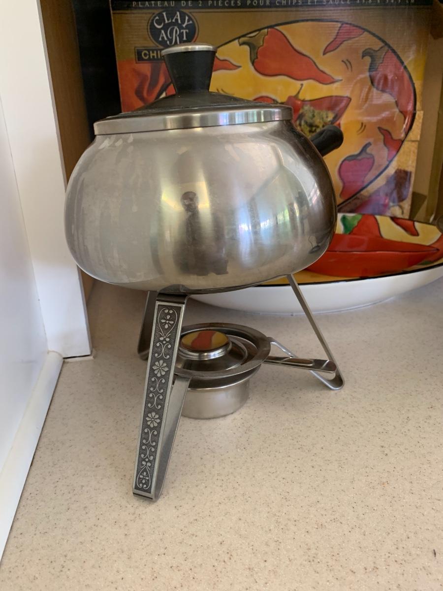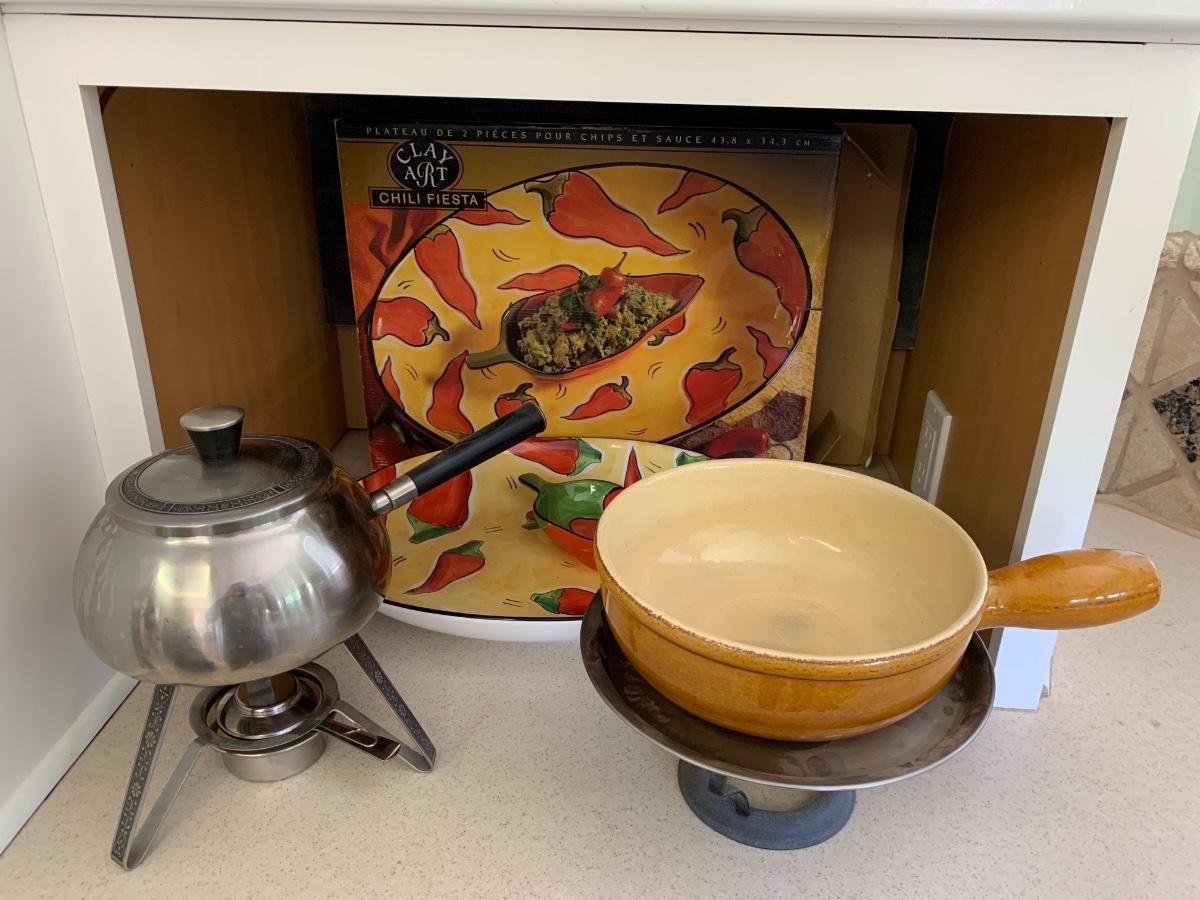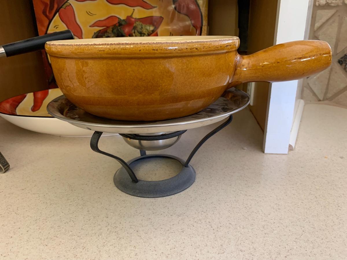 Lot includes a vintage stainless steel fondue pot with warmer. A large chili themed serving tray with dip and a very cool vintage Swiss Landert 22 stoneware fondue pot with stand and warmer.