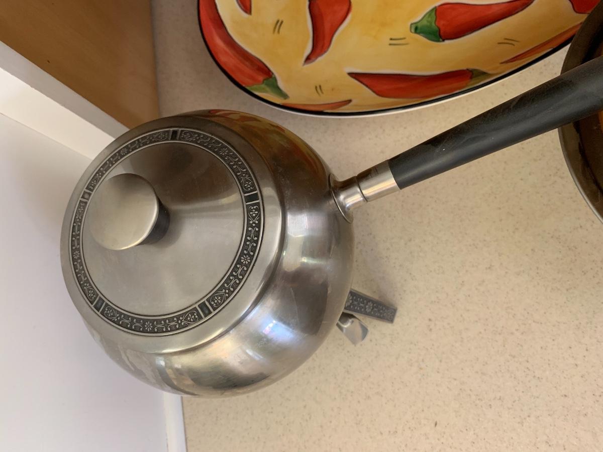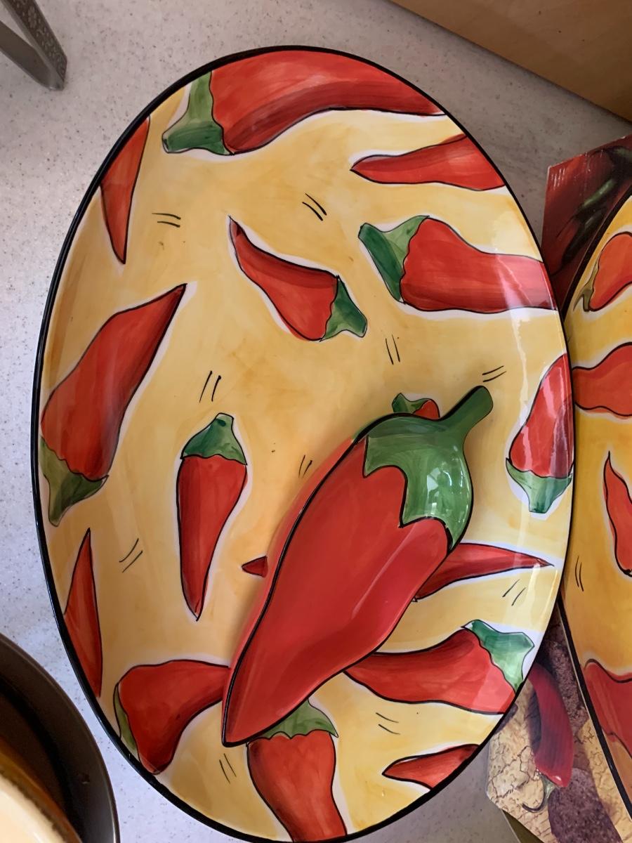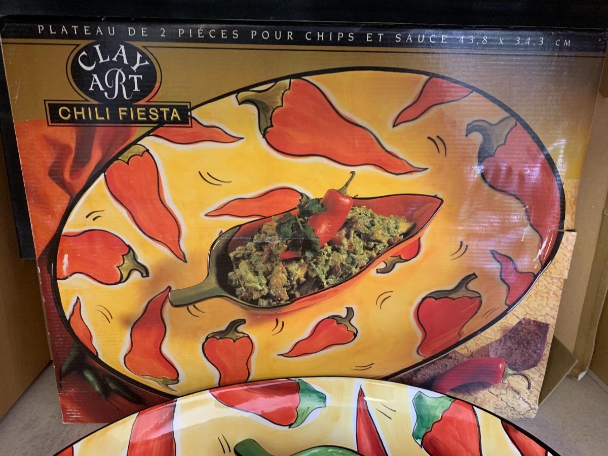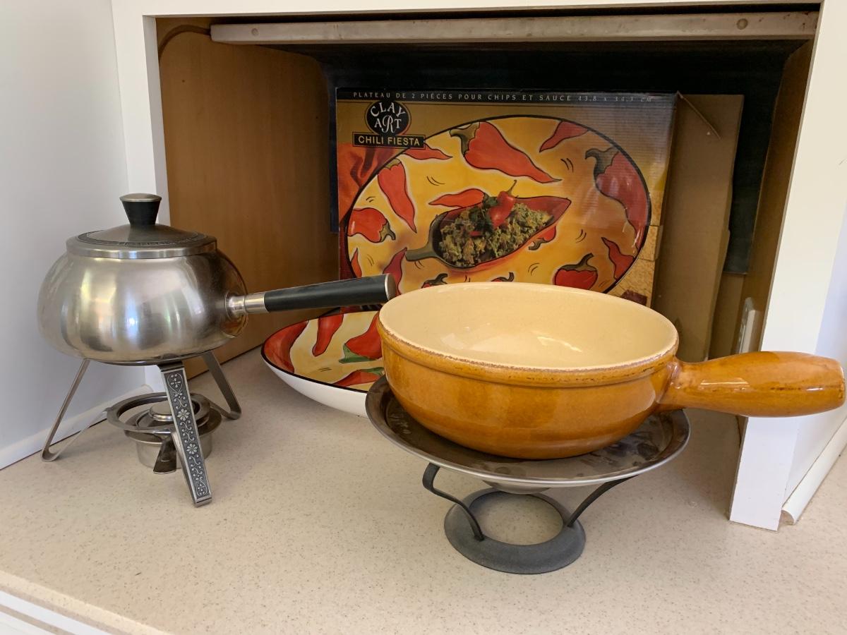 Lot includes a vintage stainless steel fondue pot with warmer. A large chili themed serving tray with dip and a very cool vintage Swiss Landert 22 stoneware fondue pot with stand and warmer.