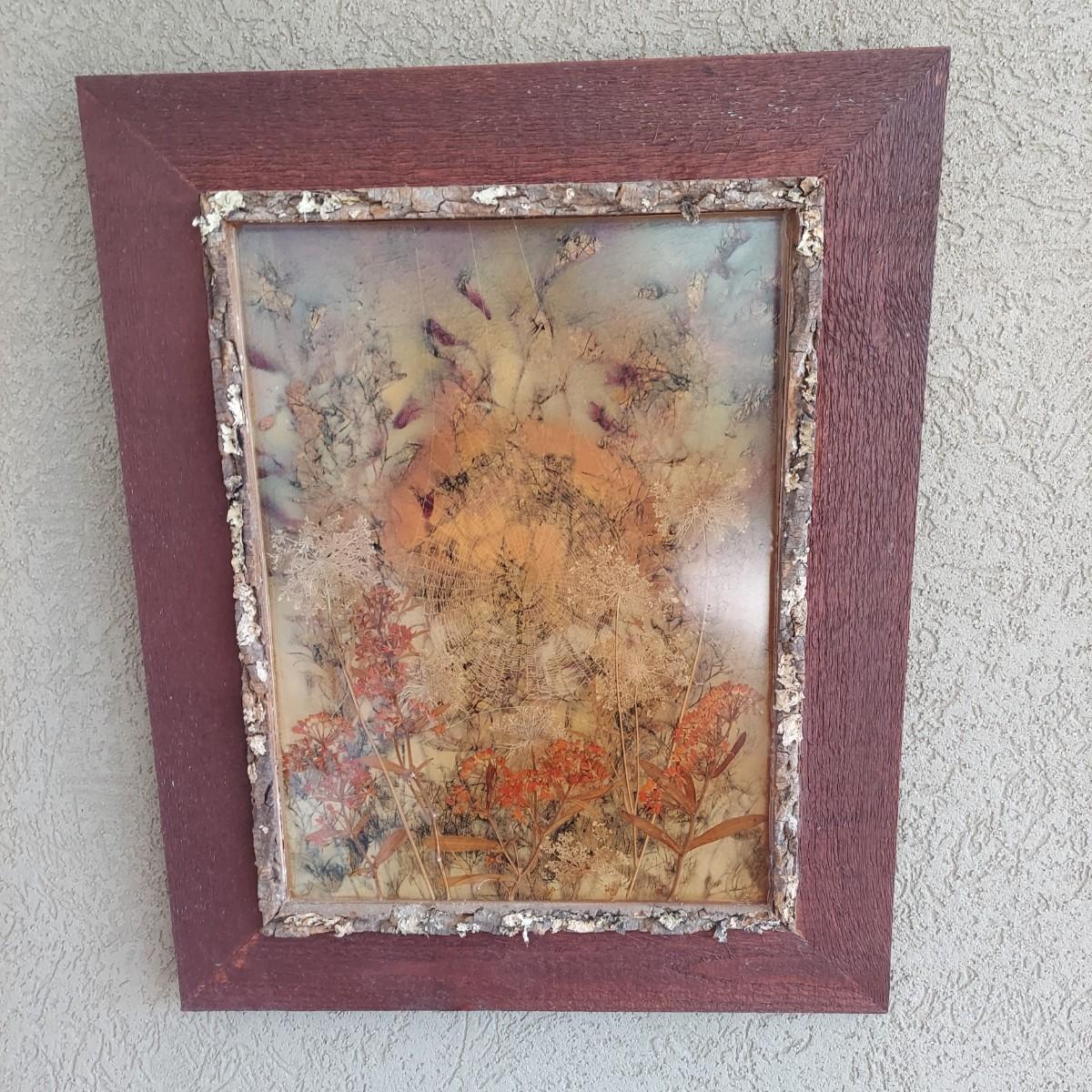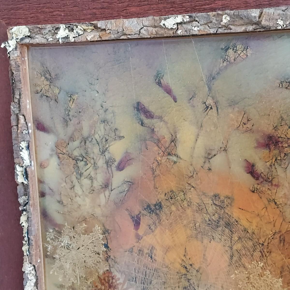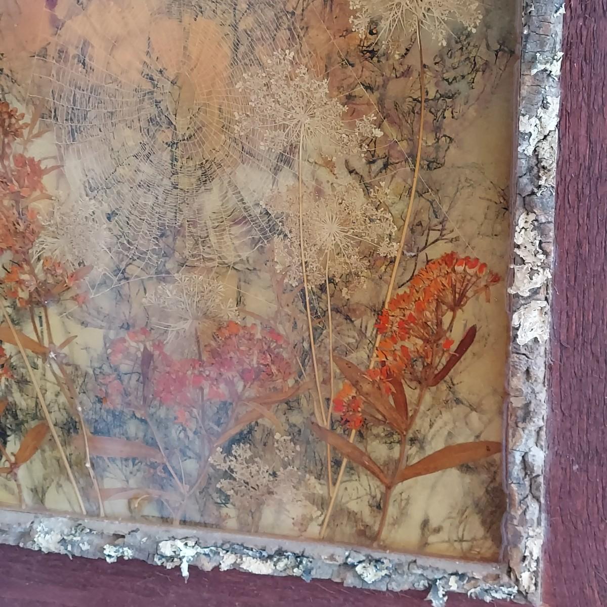 Folk art style spider web art. Piece appears to be made by local NC wood artist Michael Walsh of Michael's Wild Woods. It looks to be dried flowers and a spider web with acrylic poured over and then framed. The solid wood frame measures approximately 17” x 21"H. Please see photos for details. Shipping available