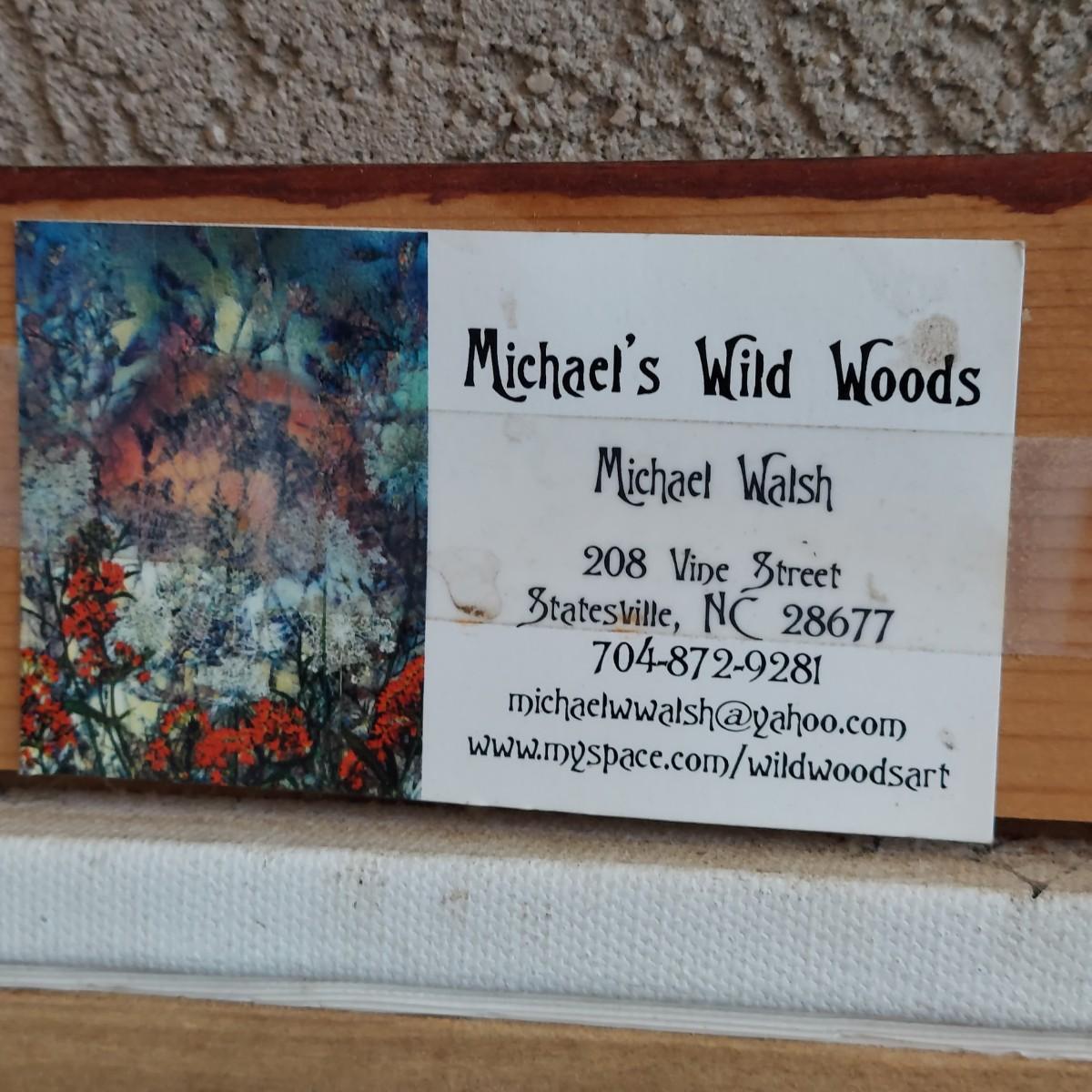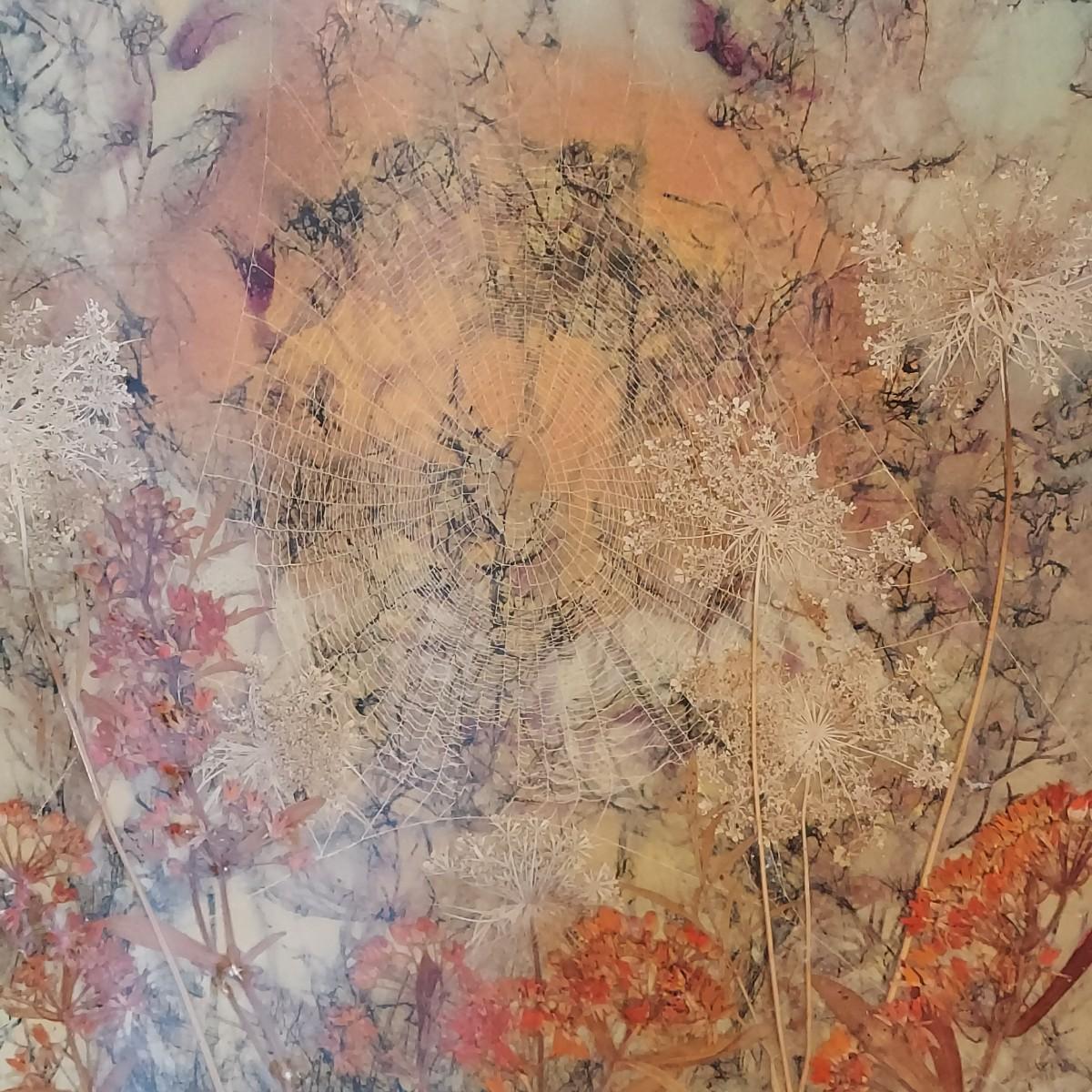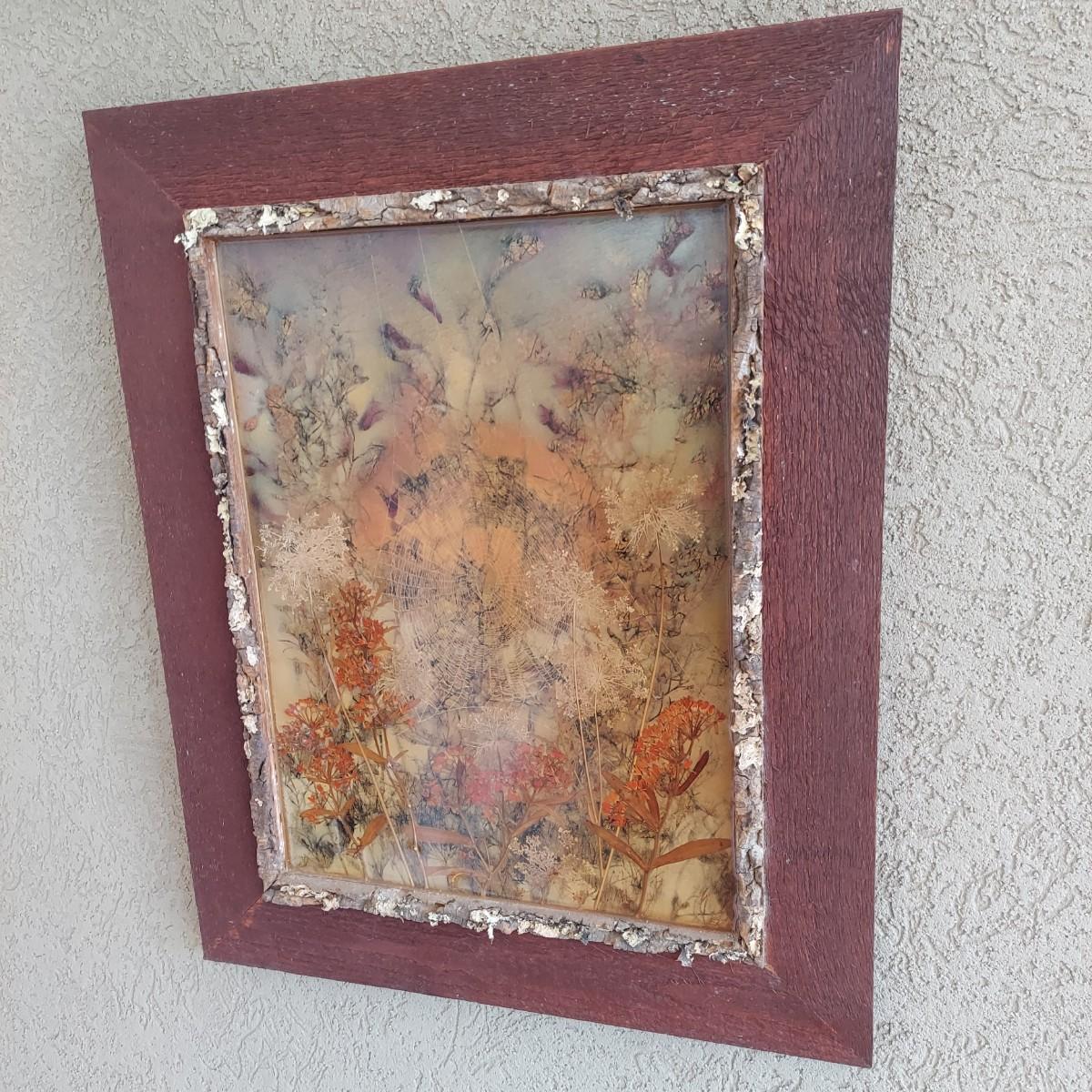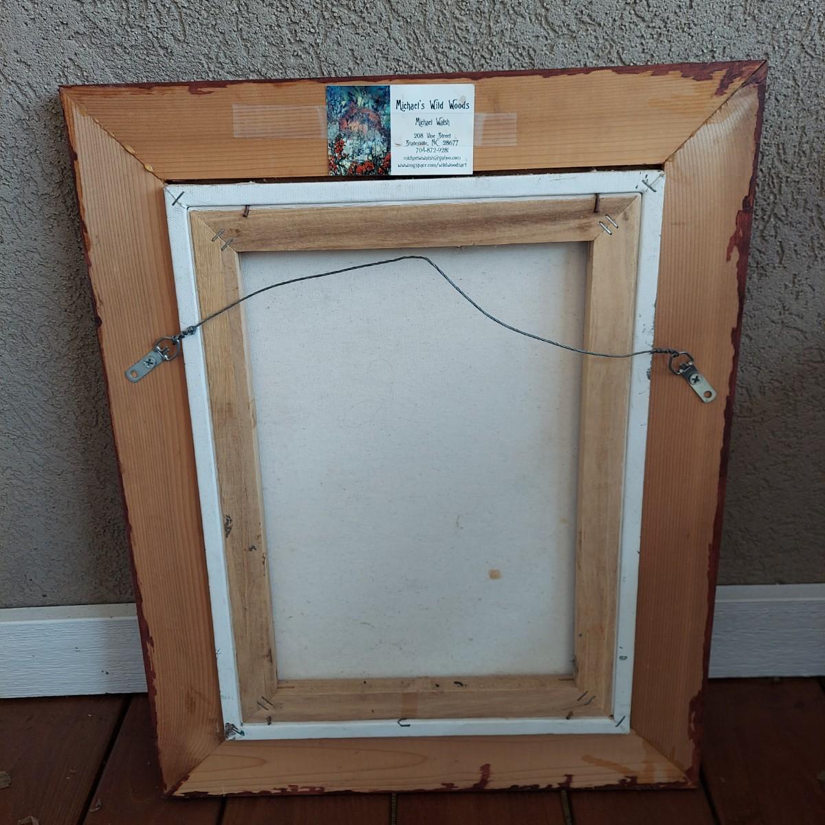 Folk art style spider web art. Piece appears to be made by local NC wood artist Michael Walsh of Michael's Wild Woods. It looks to be dried flowers and a spider web with acrylic poured over and then framed. The solid wood frame measures approximately 17” x 21"H. Please see photos for details. Shipping available