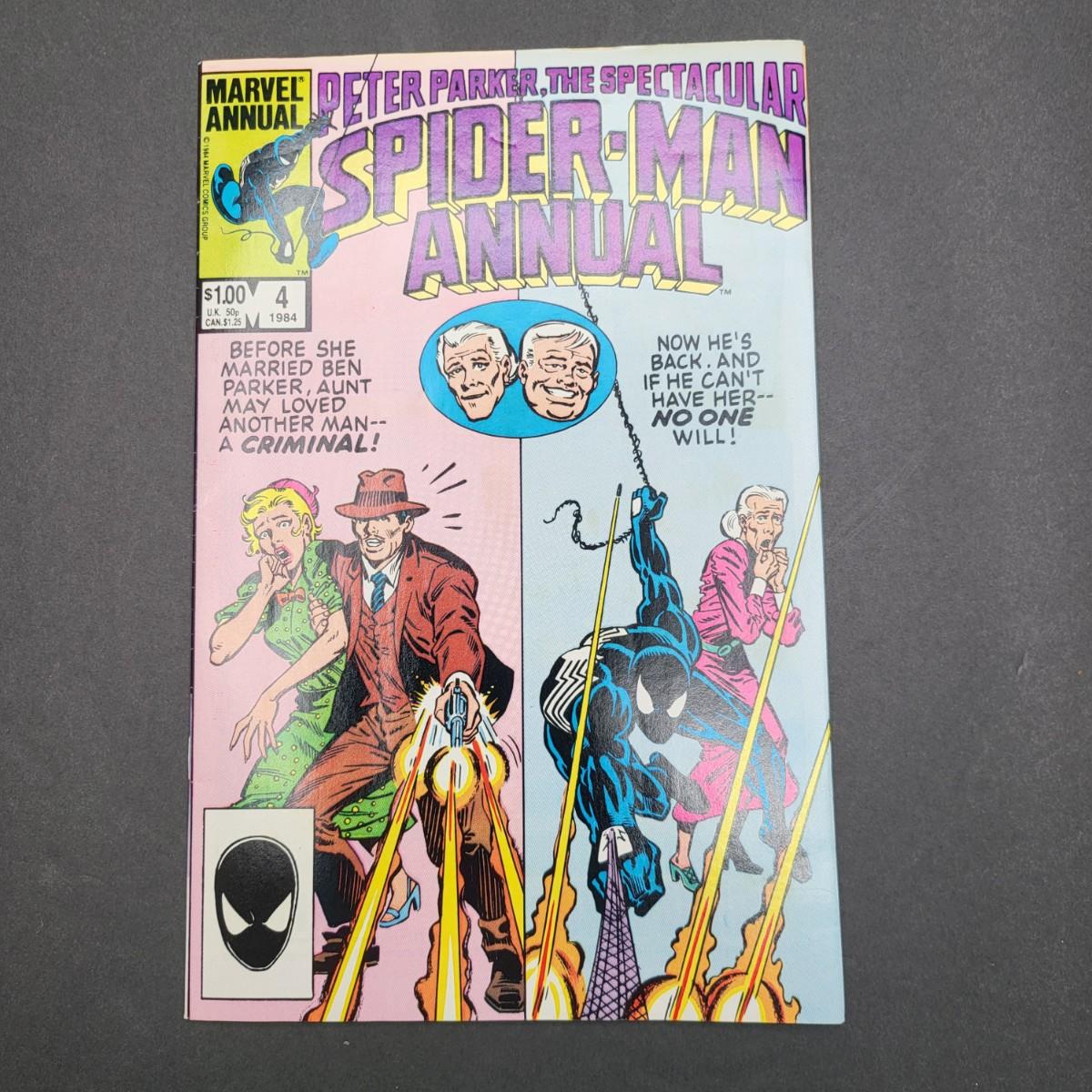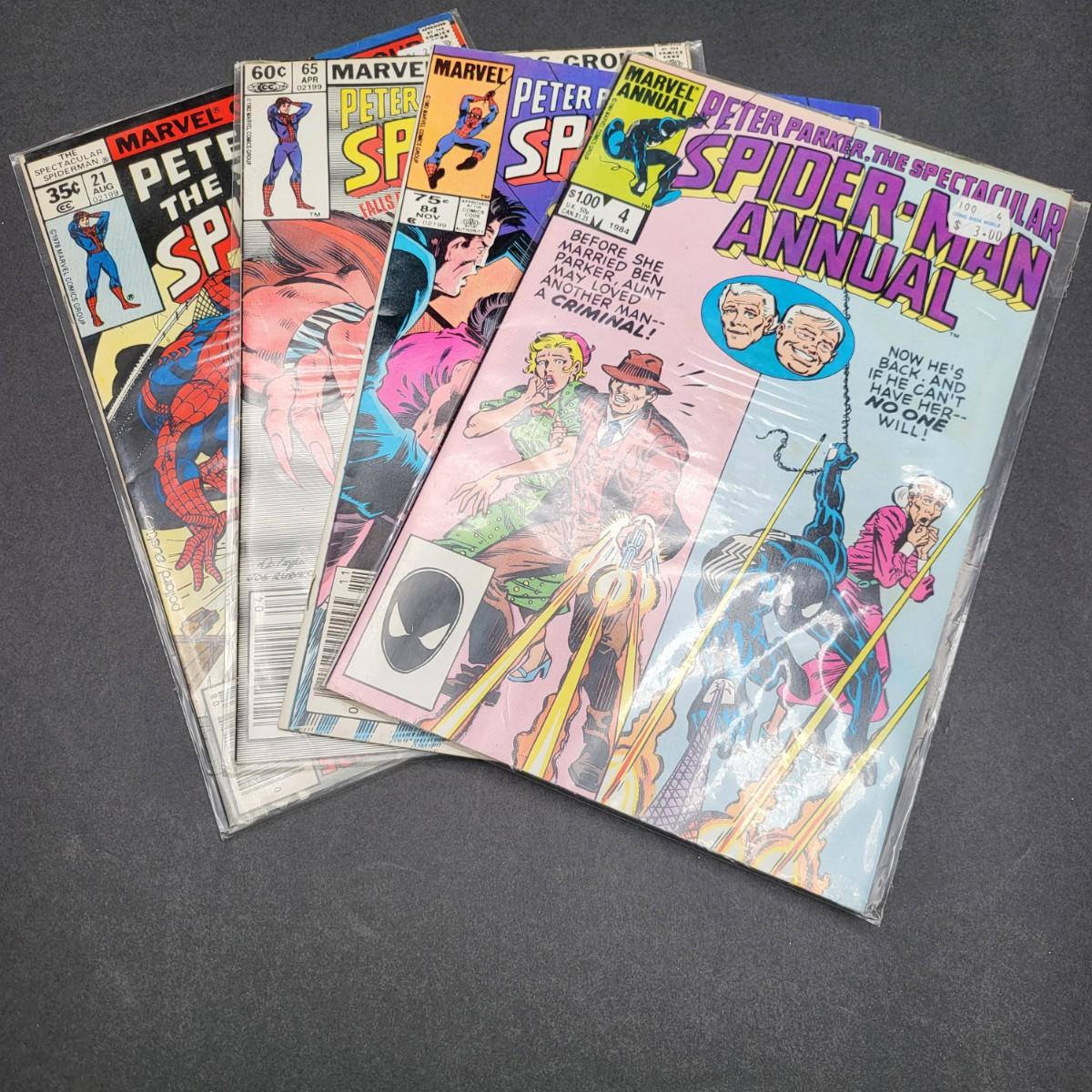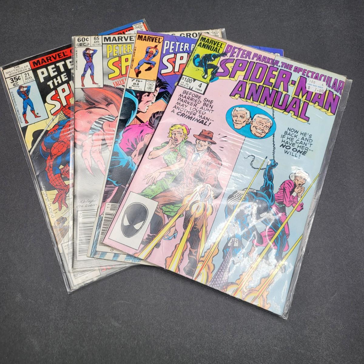 1978 Peter Parker The Spectacular Spider-Man, 1982 Spider-Man Kraven The Hunter, 1983 Spider-Man and 1984 Spider-Man Annual.