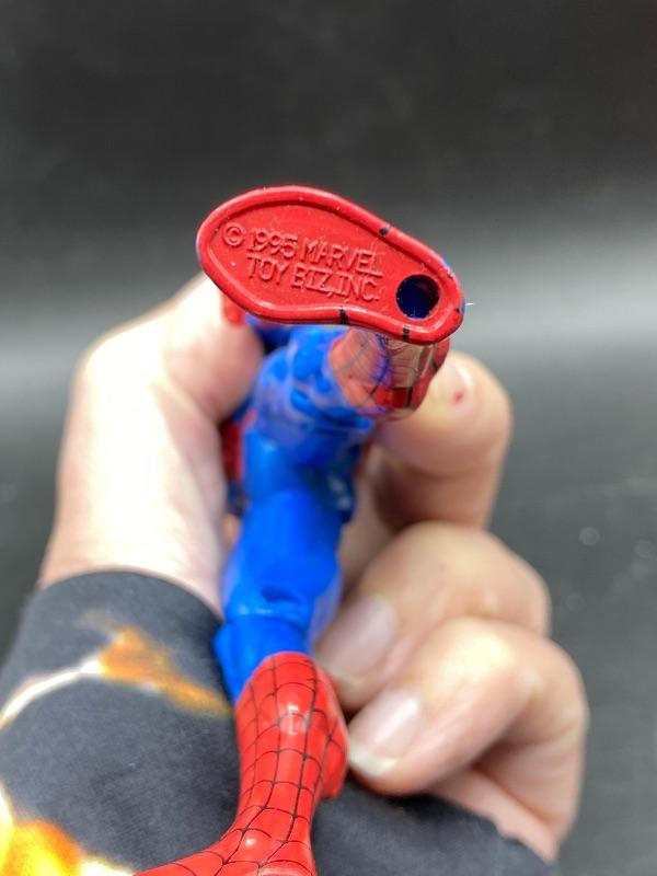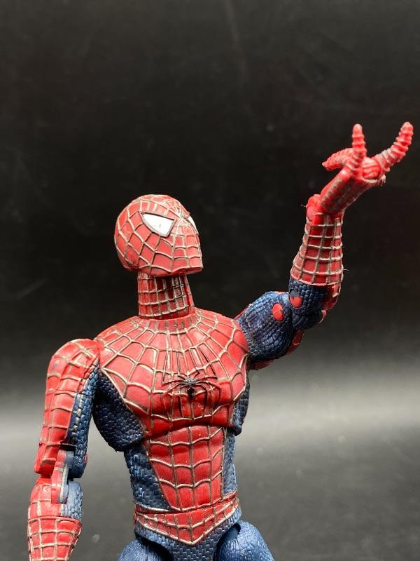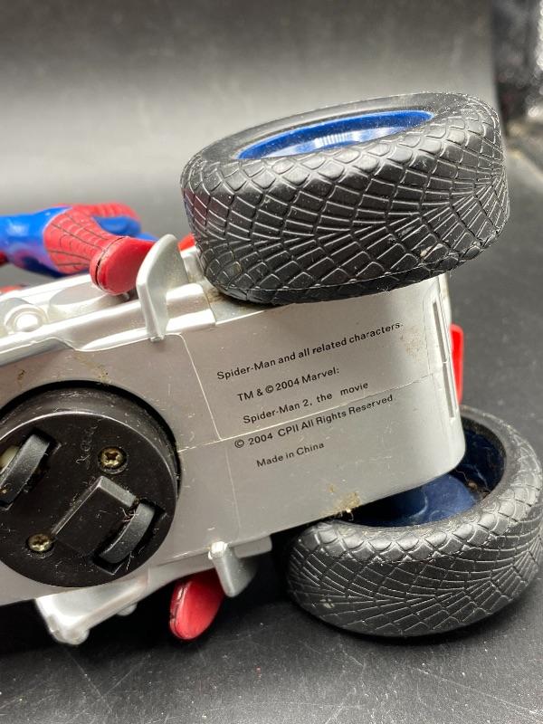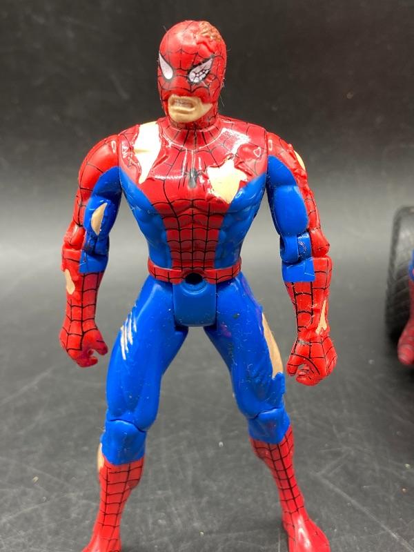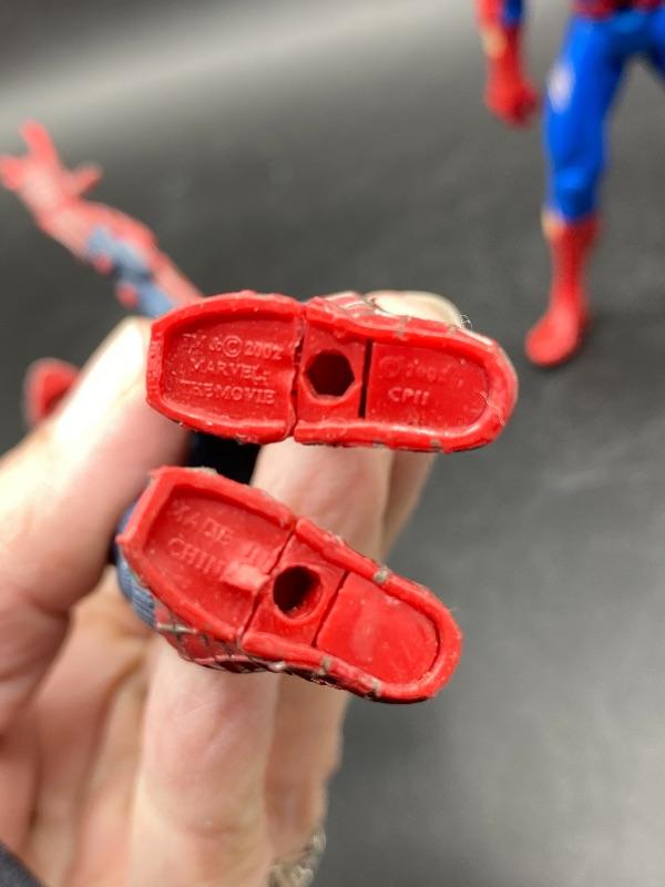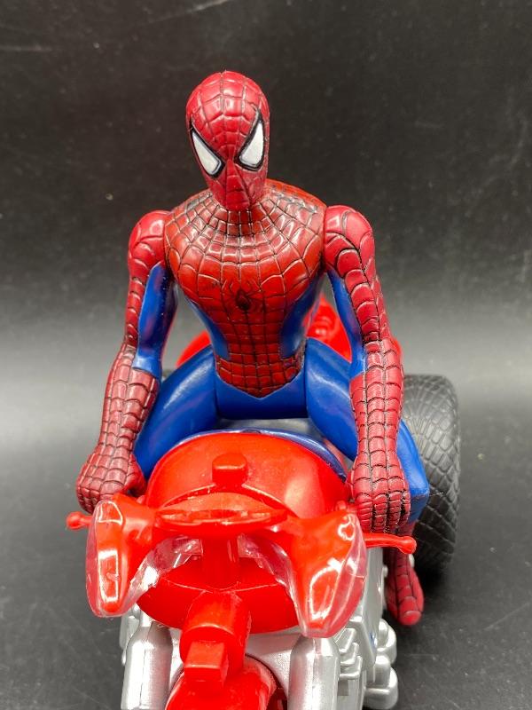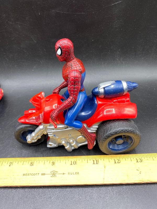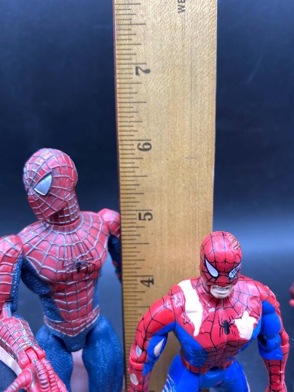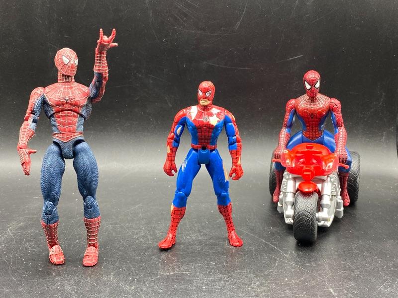 Spider-Man trio of action figures. Different eras. 2002 Spider-Man is fully articulated including fingers, feet, waist, arms, and leg. Stands 6". The ripped costume Spider-Man is from 1995 and is about 5" tall. The las one is on a battery op motorcycle. Action figure does come off the bike. He is from Spider Man 2 in 2004. All are previously played with. Great for display or toy box.