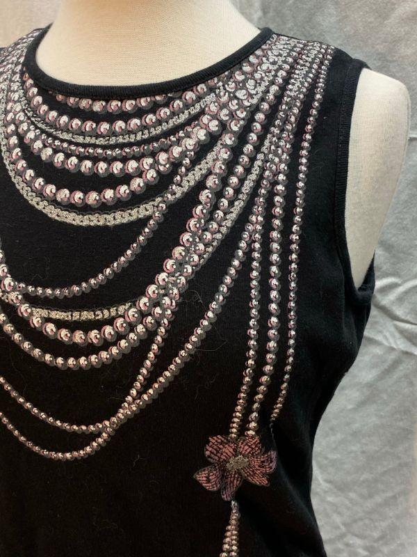 Spiegel black tank with multiple strands of pearls printed on the front. Great with jeans and a jacket. Size XL
