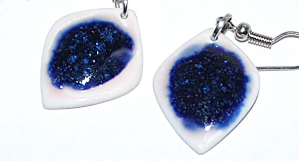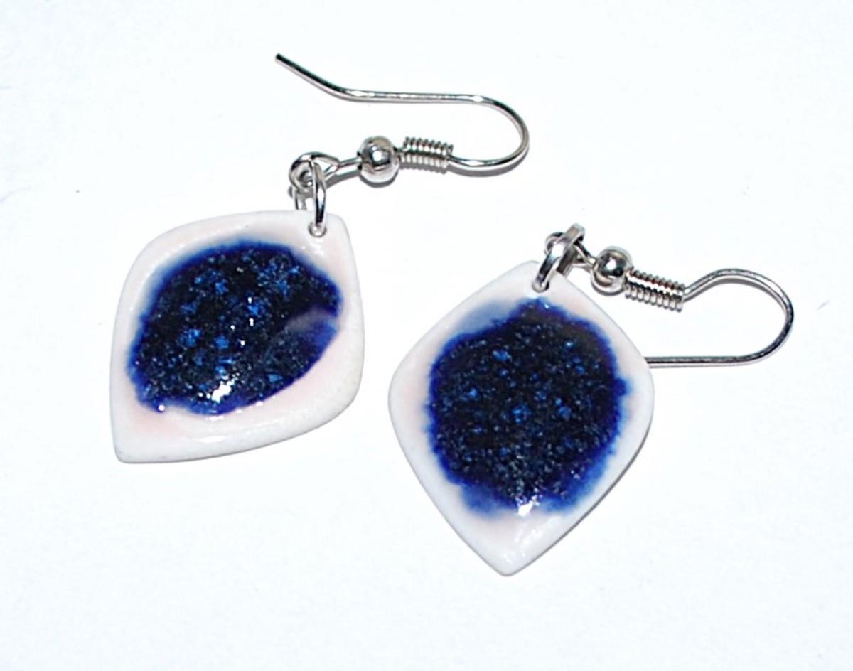 "Spilled Blue Paint" Teardrop EARRINGS Set on White Base and Wire Hook Clasp