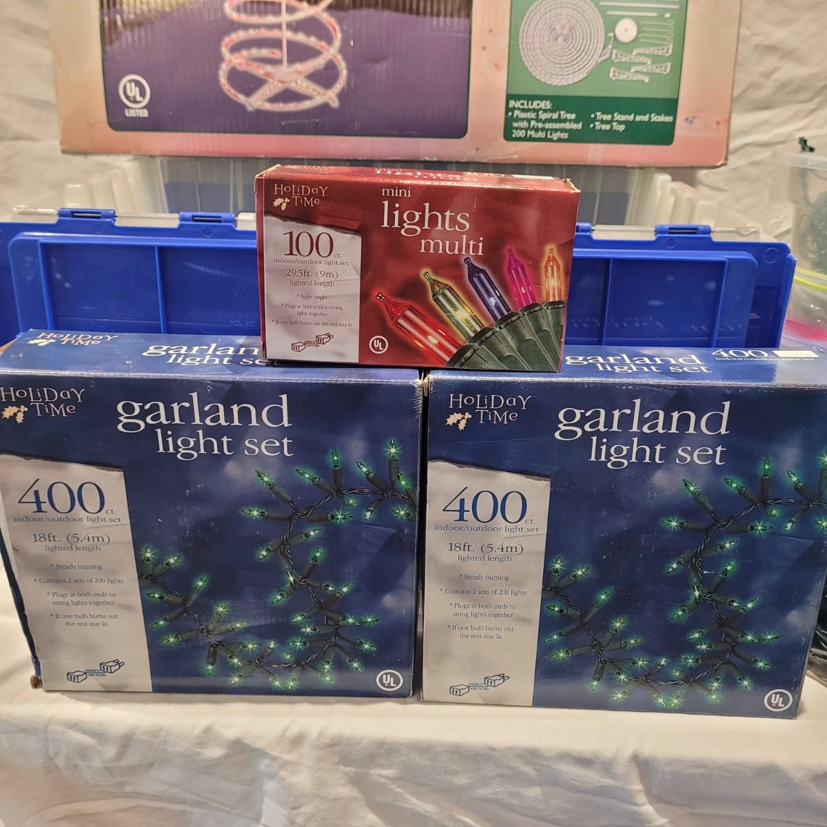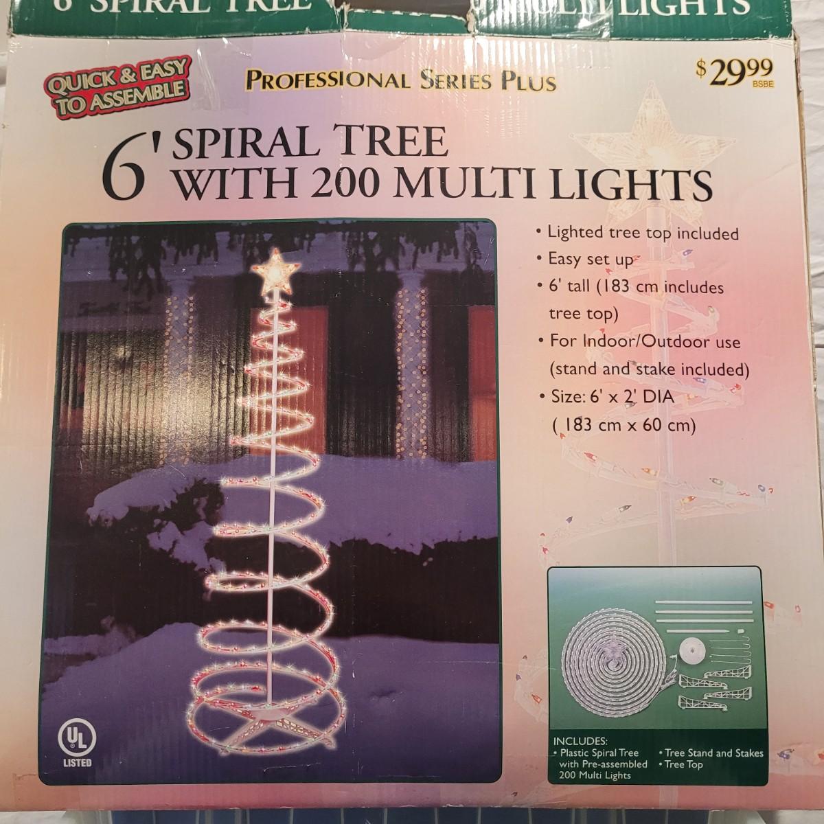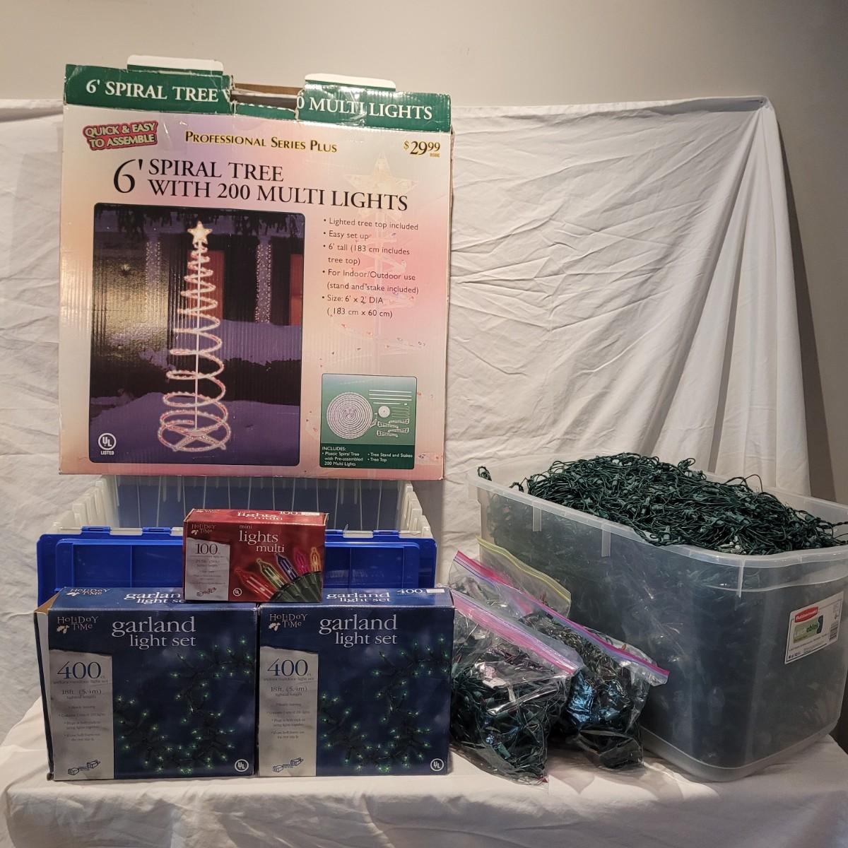 This lot of Christmas decor includes a 6"™ spiral tree with multicolored lights, in addition to a variety of white and multicolored string lights. Lights turn on when plugged in. Shipping available.