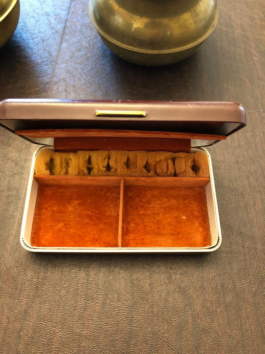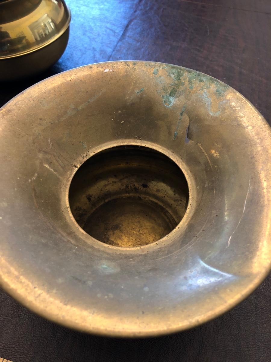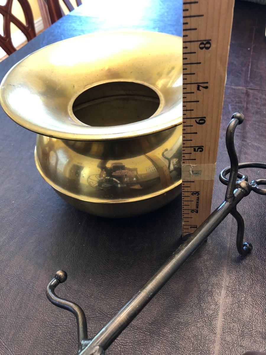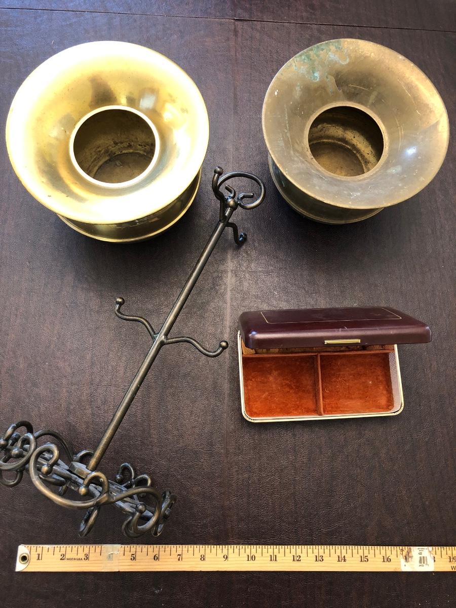 Lot of two brass spittoons, decorative metal hanger, and small hinged jewelry box