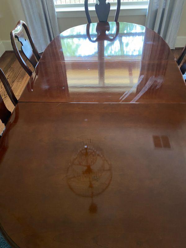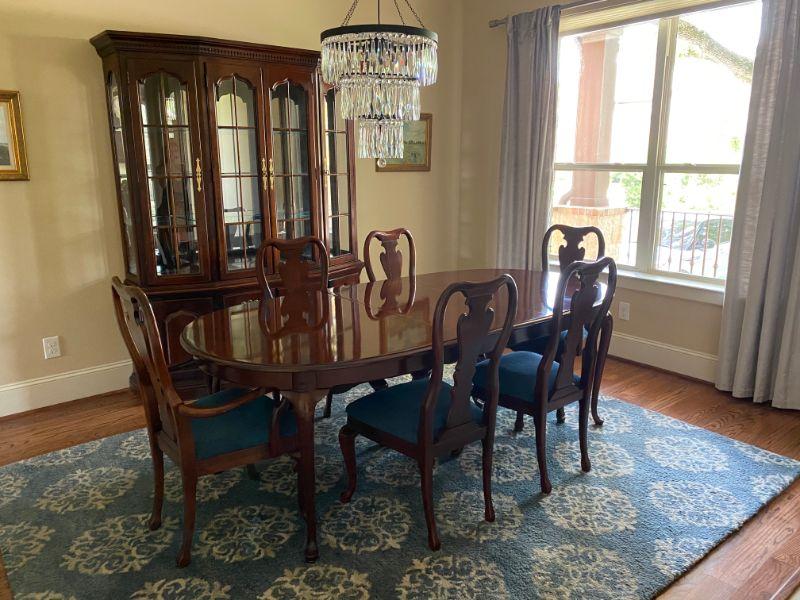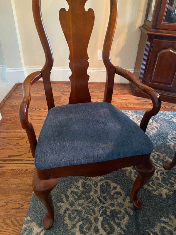 Splendid Queen Anne Style Solid Cherry Dining Set Oval 60" Table (Expandable to 84" with Two Leaves) with 8 Chairs. Bought in the 90’s (can we can call it antique yet?) newly reupholstered chairs in a great blue fabric. Perfect as-is or a DYI project. Some scratches; selling at over $4K on other sites.