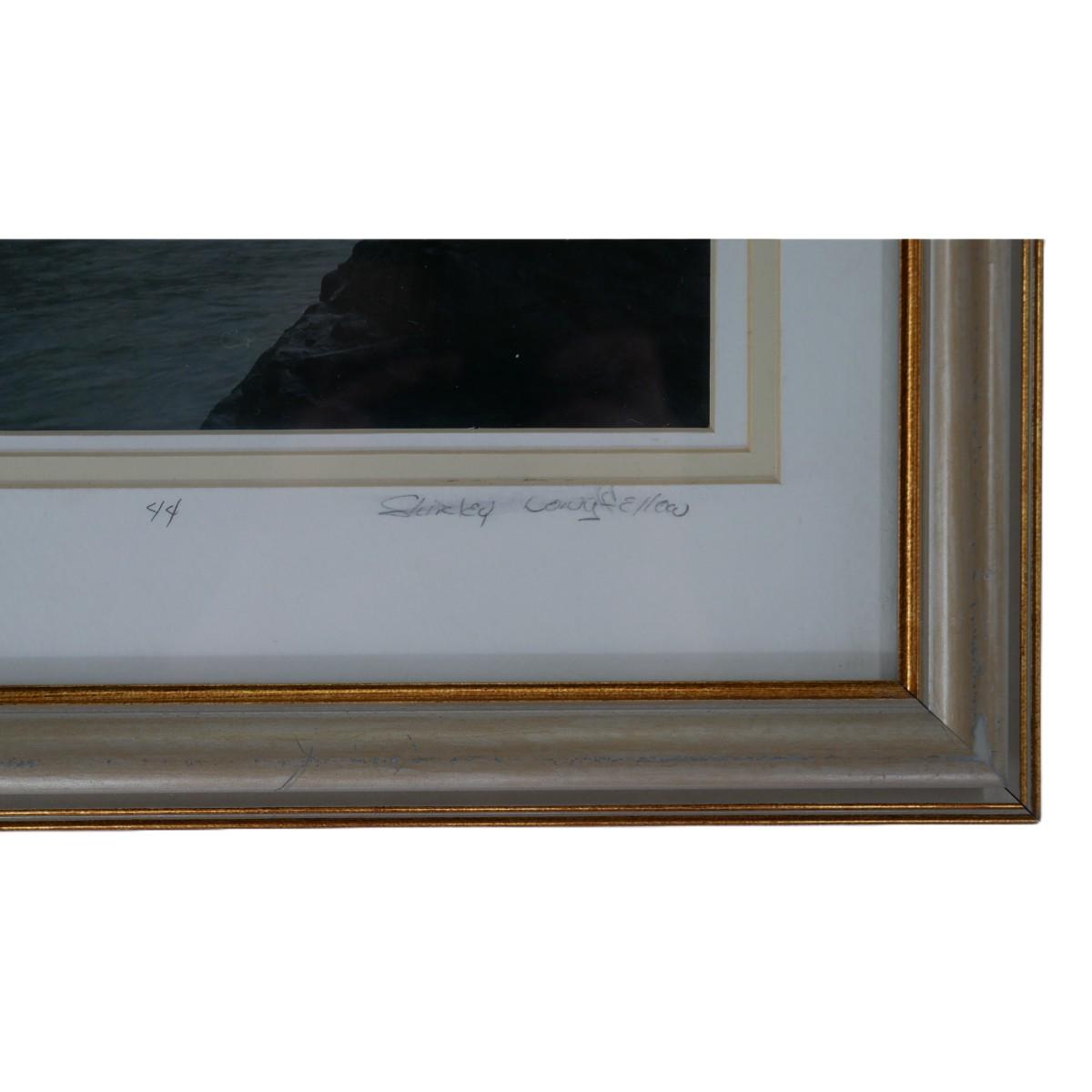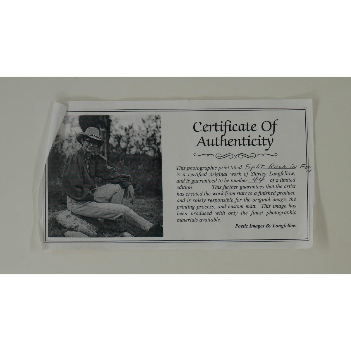 "Split Rock in Fog" by Shirley Longfellow limited edition photograph, numbered 44. Signed in pencil by artist. Certificate of Authenticity is included. Excellent condition! Art measures L 10" x H 13.25". Frame measures L 16" x H 20" x D 1". Weight is 3 lb 4 oz. (A39)