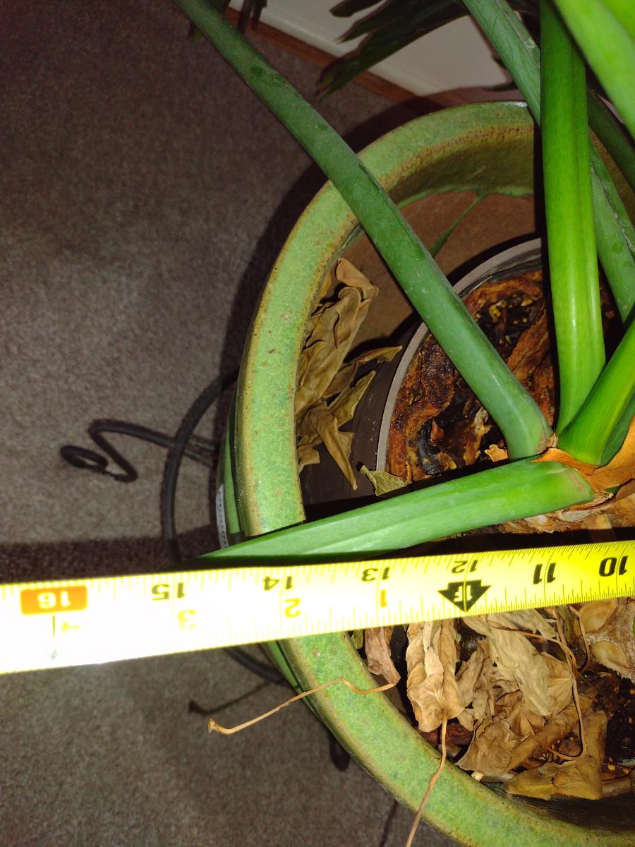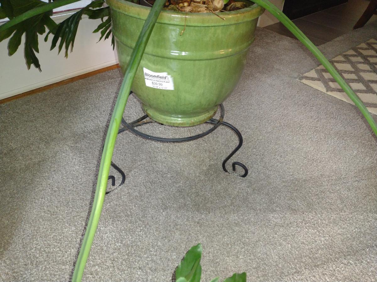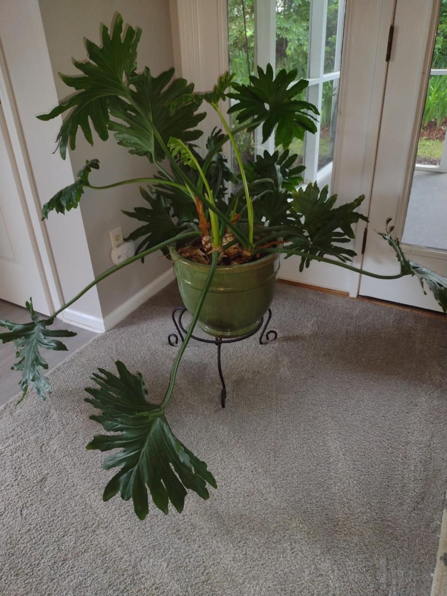 Split-leaf Philodendron Live Plant in Glazed Ceramic Pot and Metal Plant Stand. Pot is approx 14" in diameter.