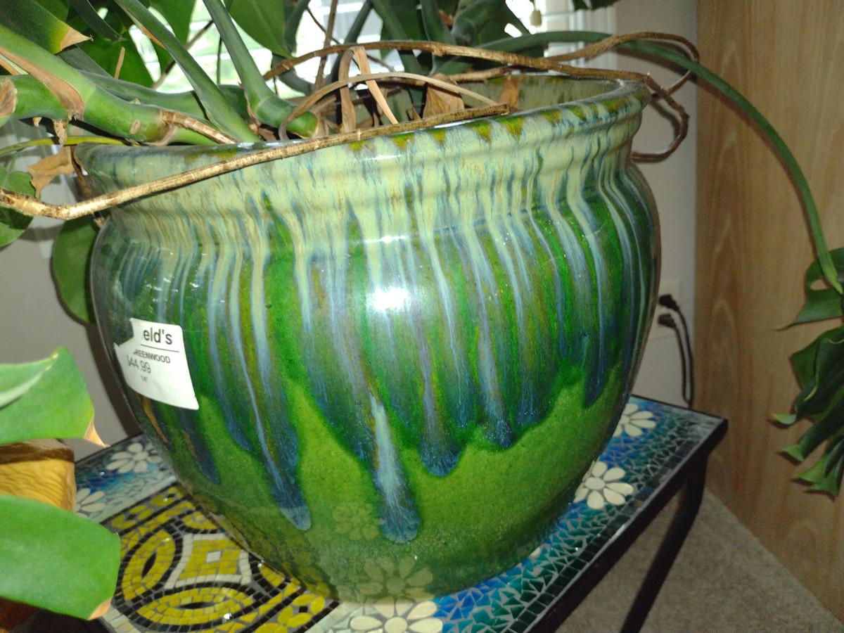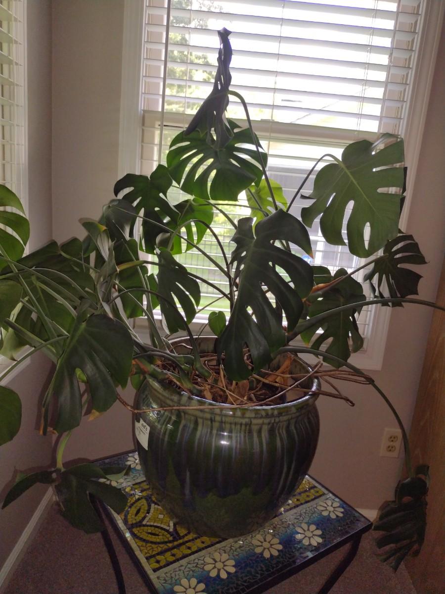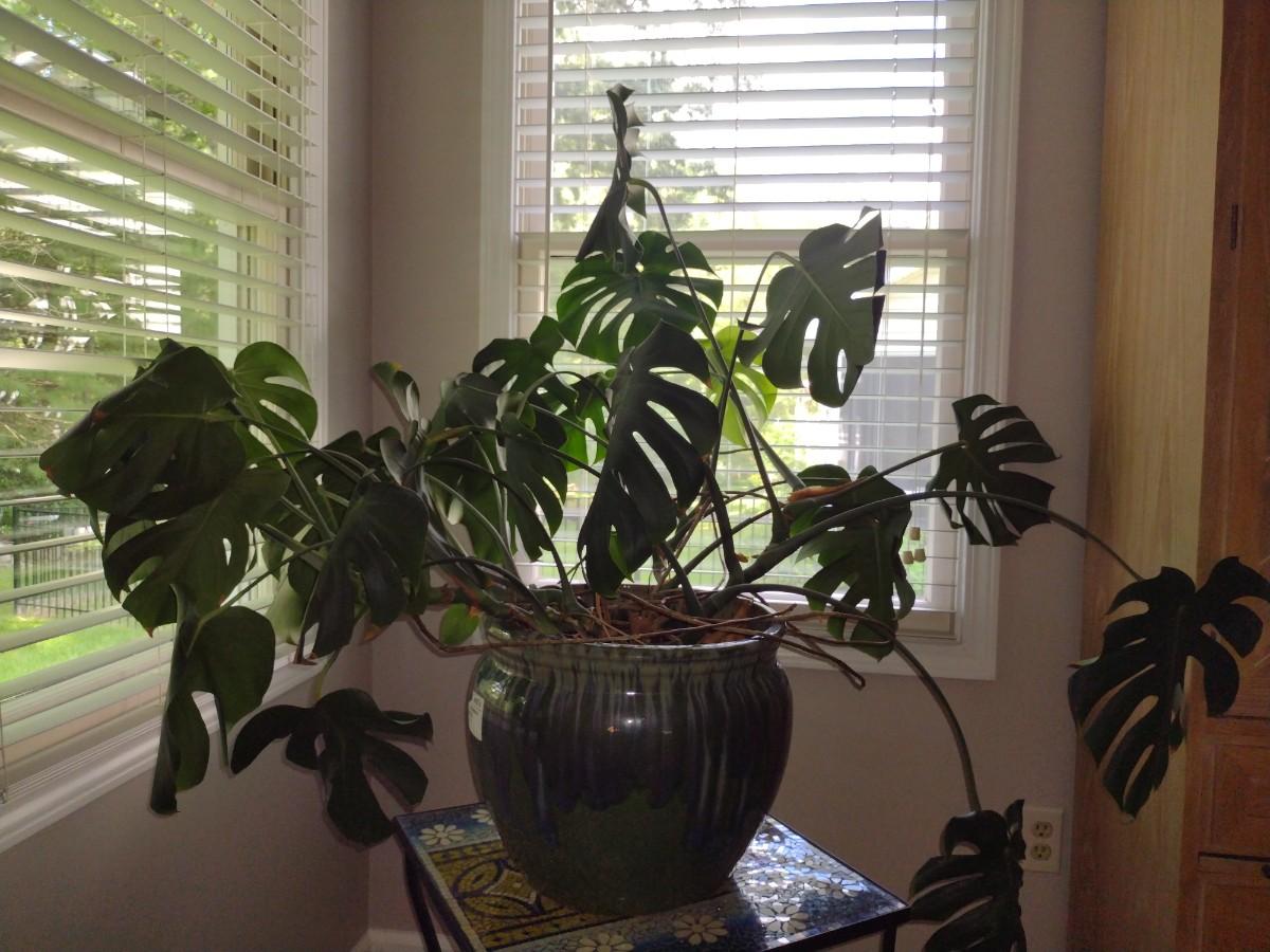 Split-Leaf Philodendron Live Plant in Glazed Ceramic Pot. Pot is approx 14" in diameter, 12" tall. Table not included.
