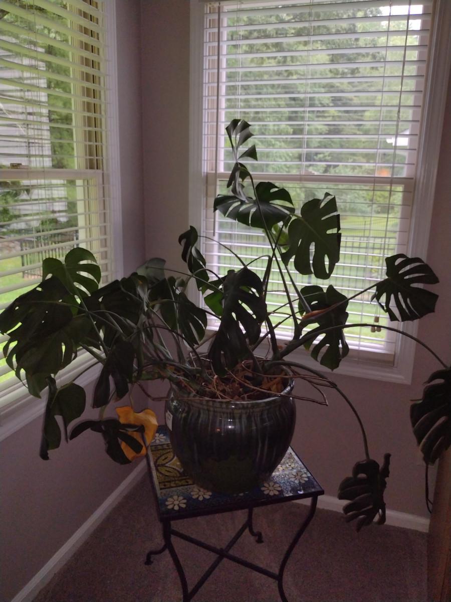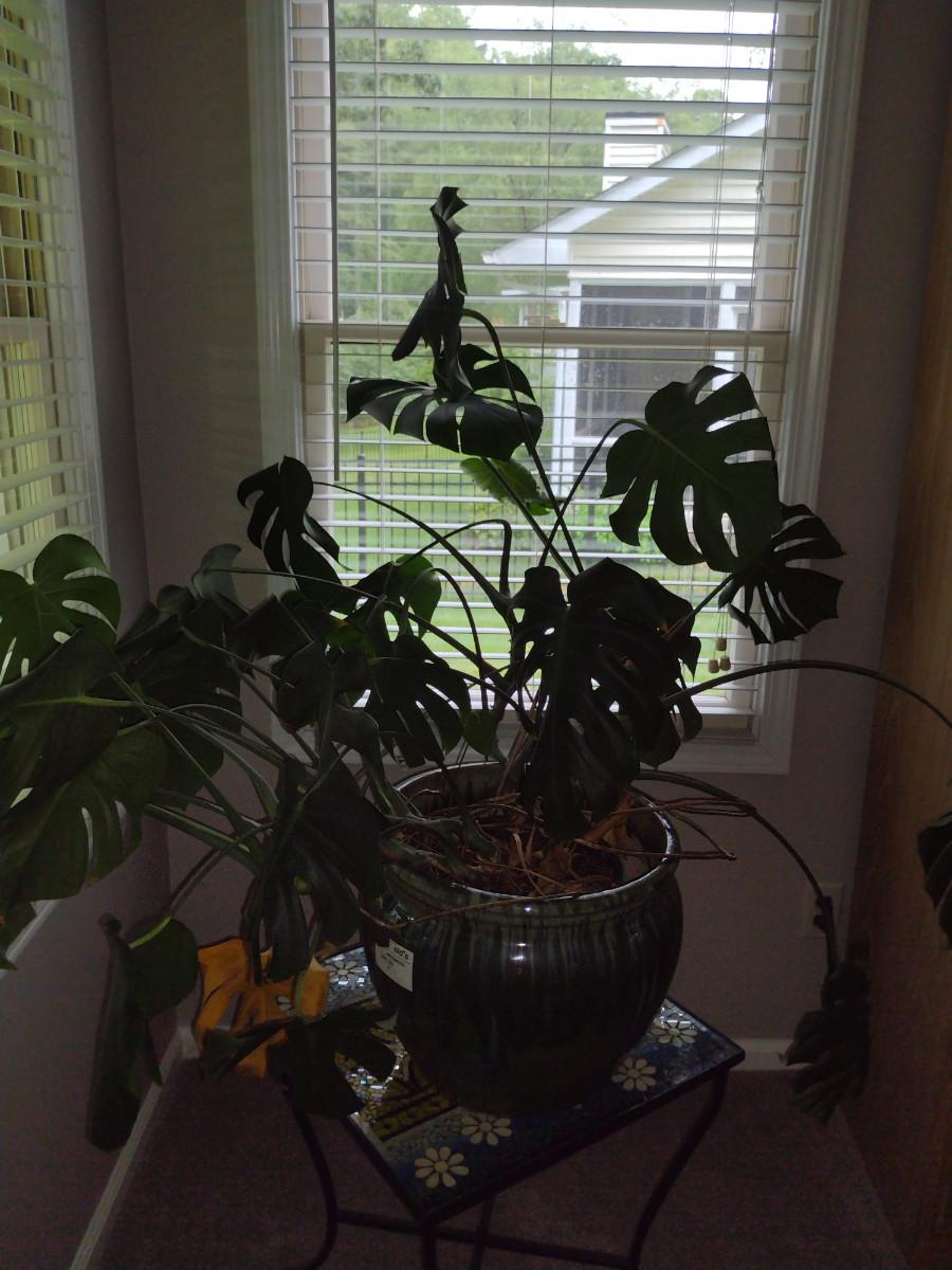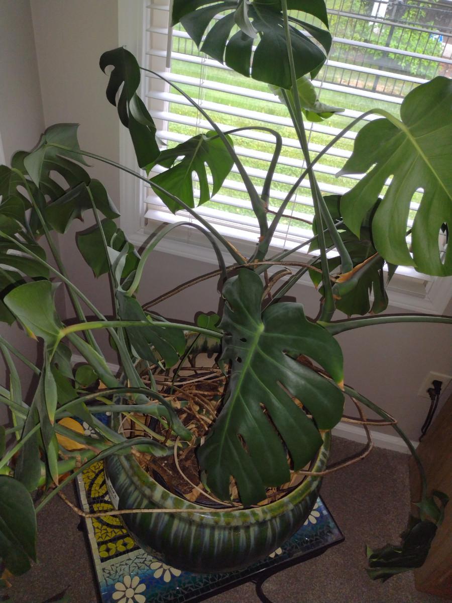 Split-Leaf Philodendron Live Plant in Glazed Ceramic Pot. Pot is approx 14" in diameter, 12" tall. Table not included.