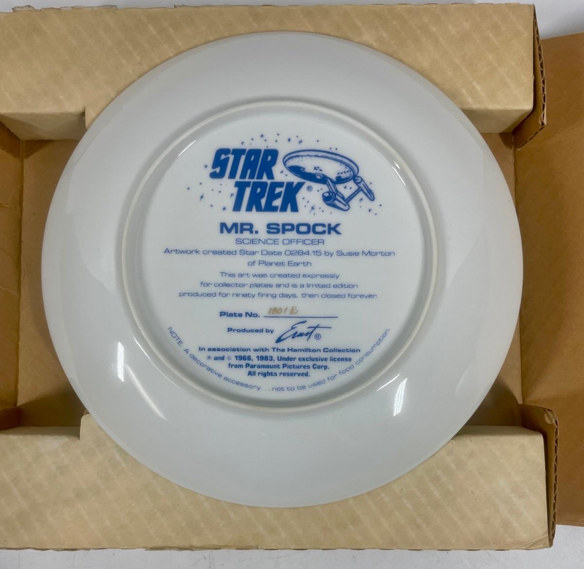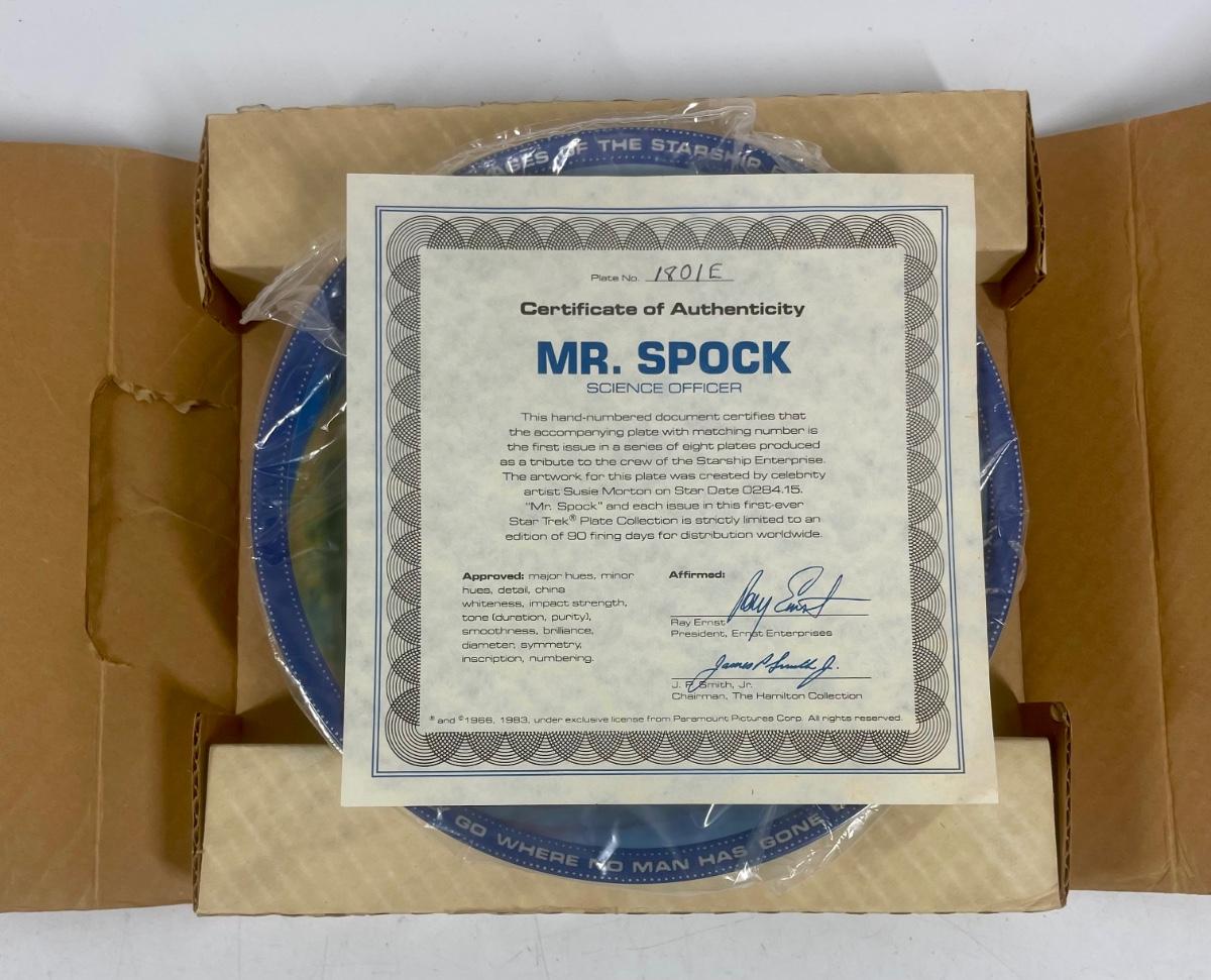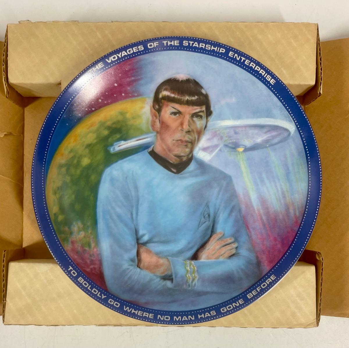 8 1/2” Star Trek Collector plate from 1984. Image of Mr. Spock with the USS Enterprise and a planet in the background. With certificate of authenticity, In original shipping box. Part of a set of 9, see other auctions for more.
