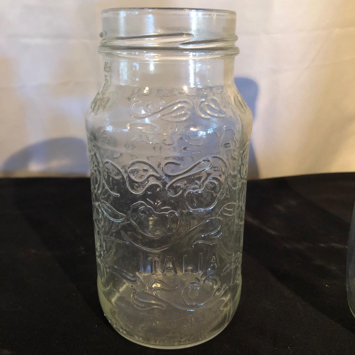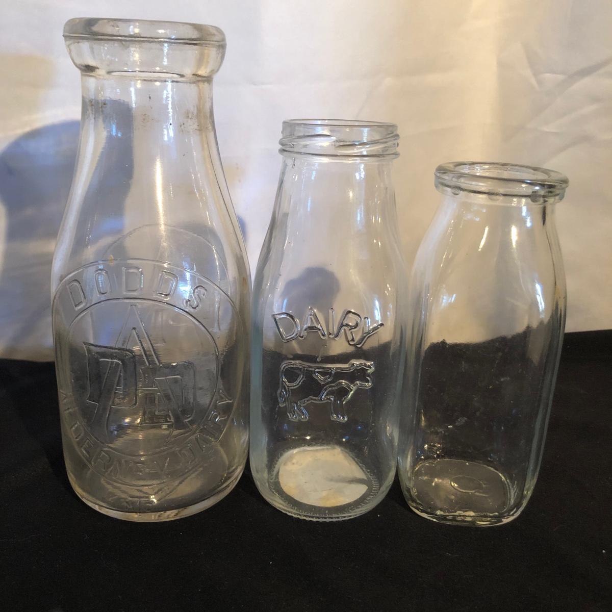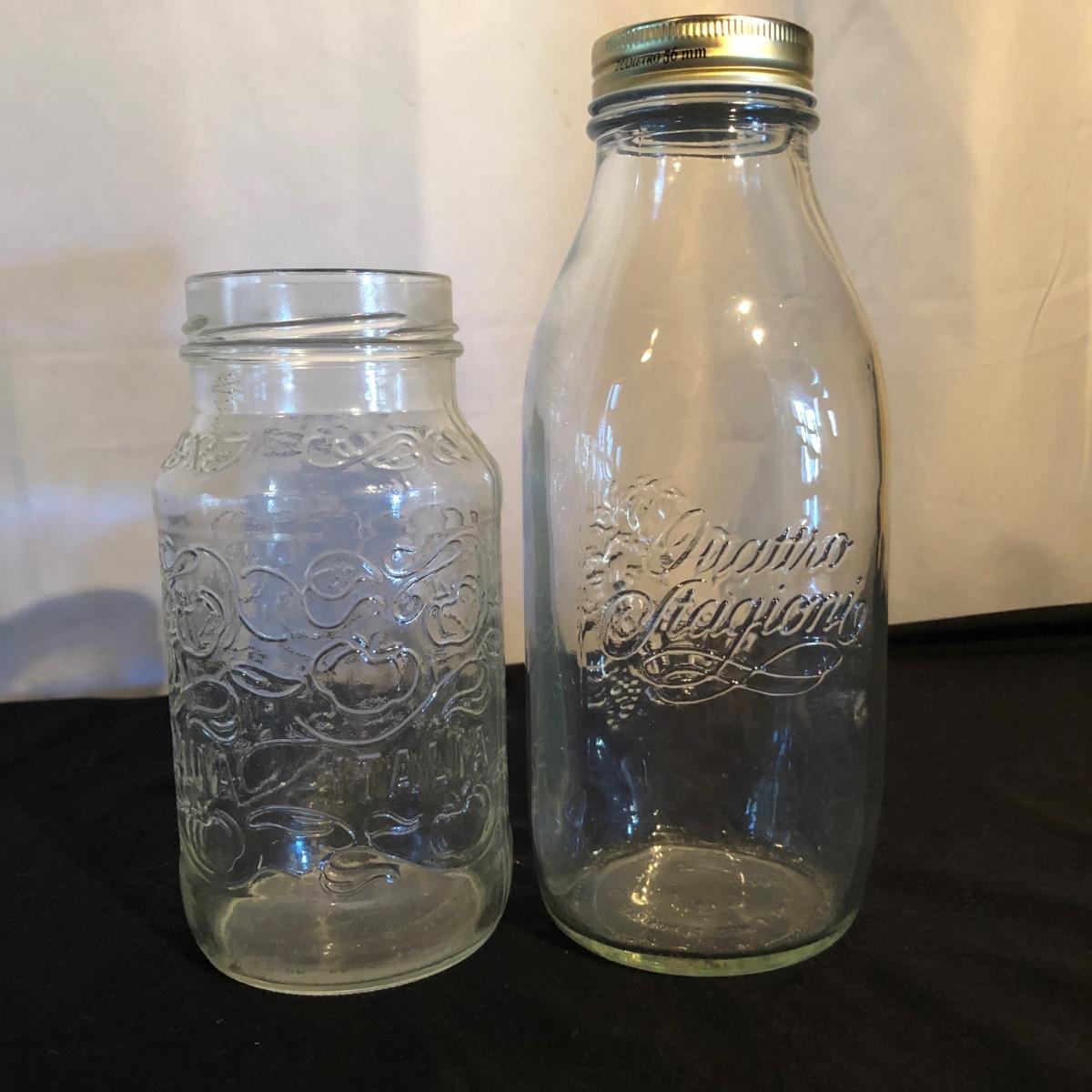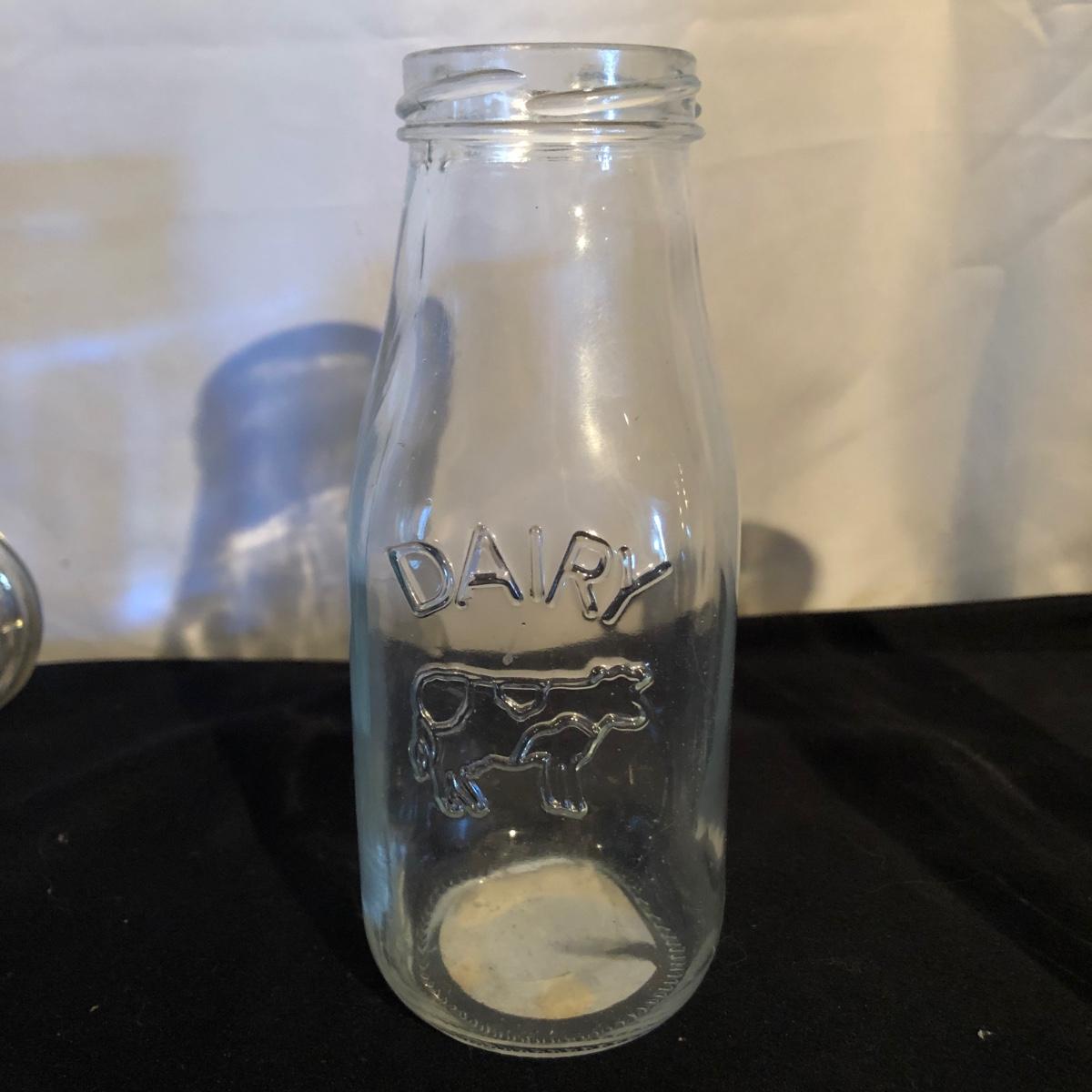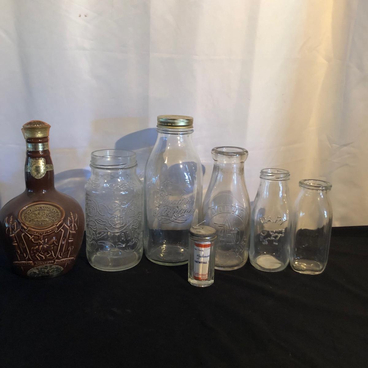 Lot includes a ceramic Spode Chivas bottle, three milk bottles, Italia jar and a Bormioll Rocco bottle. Also includes is a glass dental floss dispenser. Spode bottle measures 4.5”D x 9” tall.