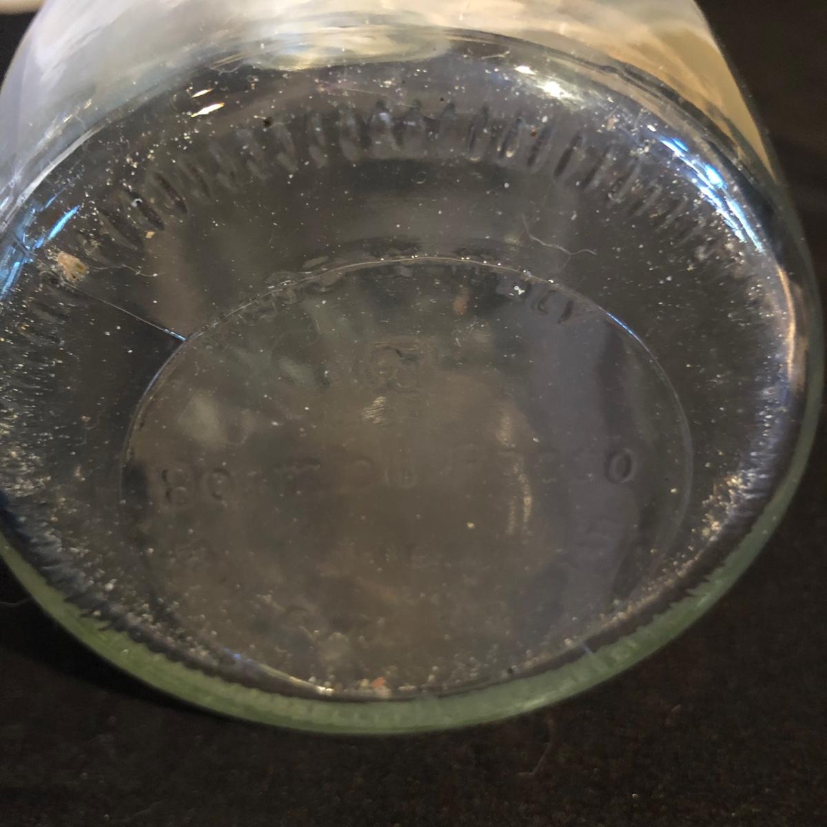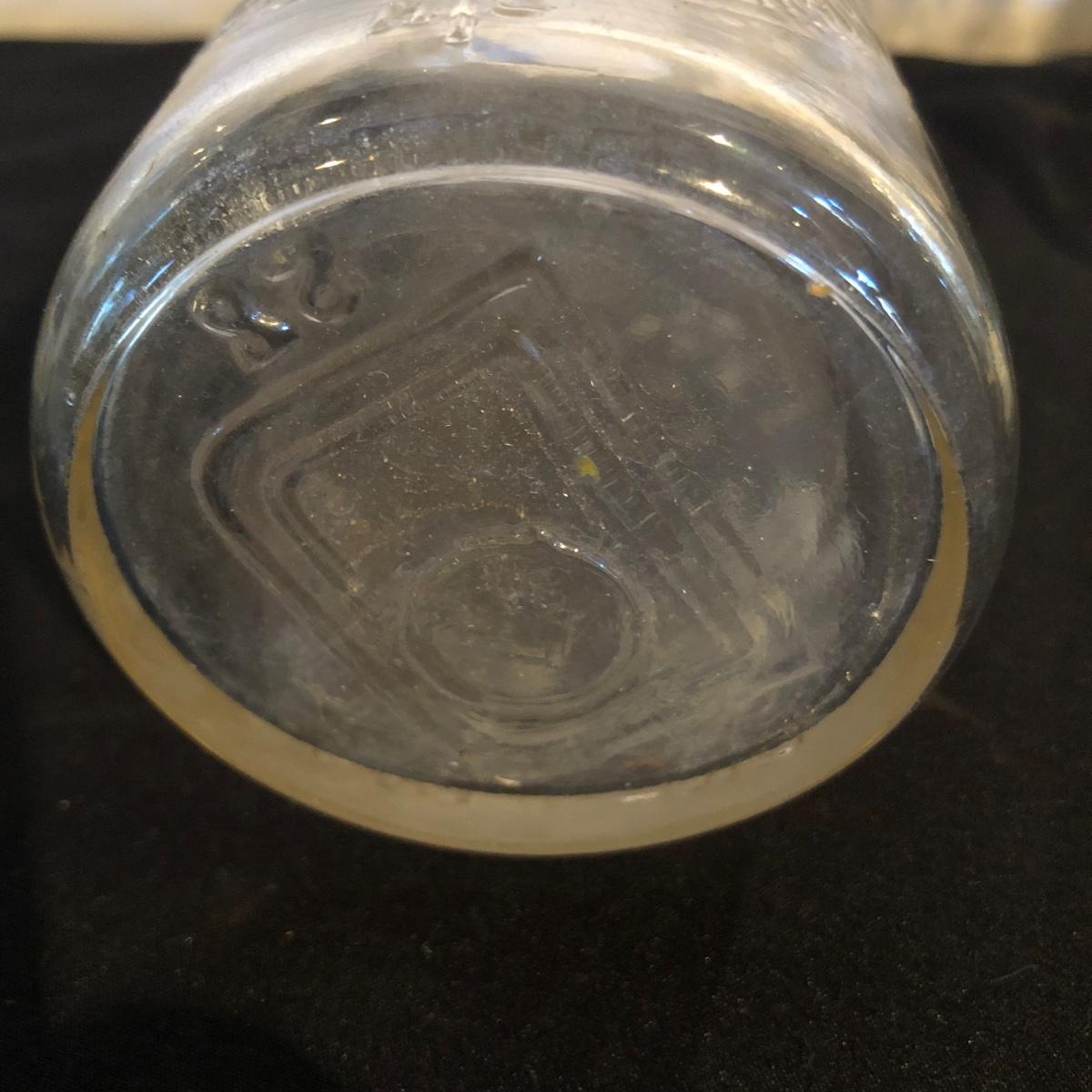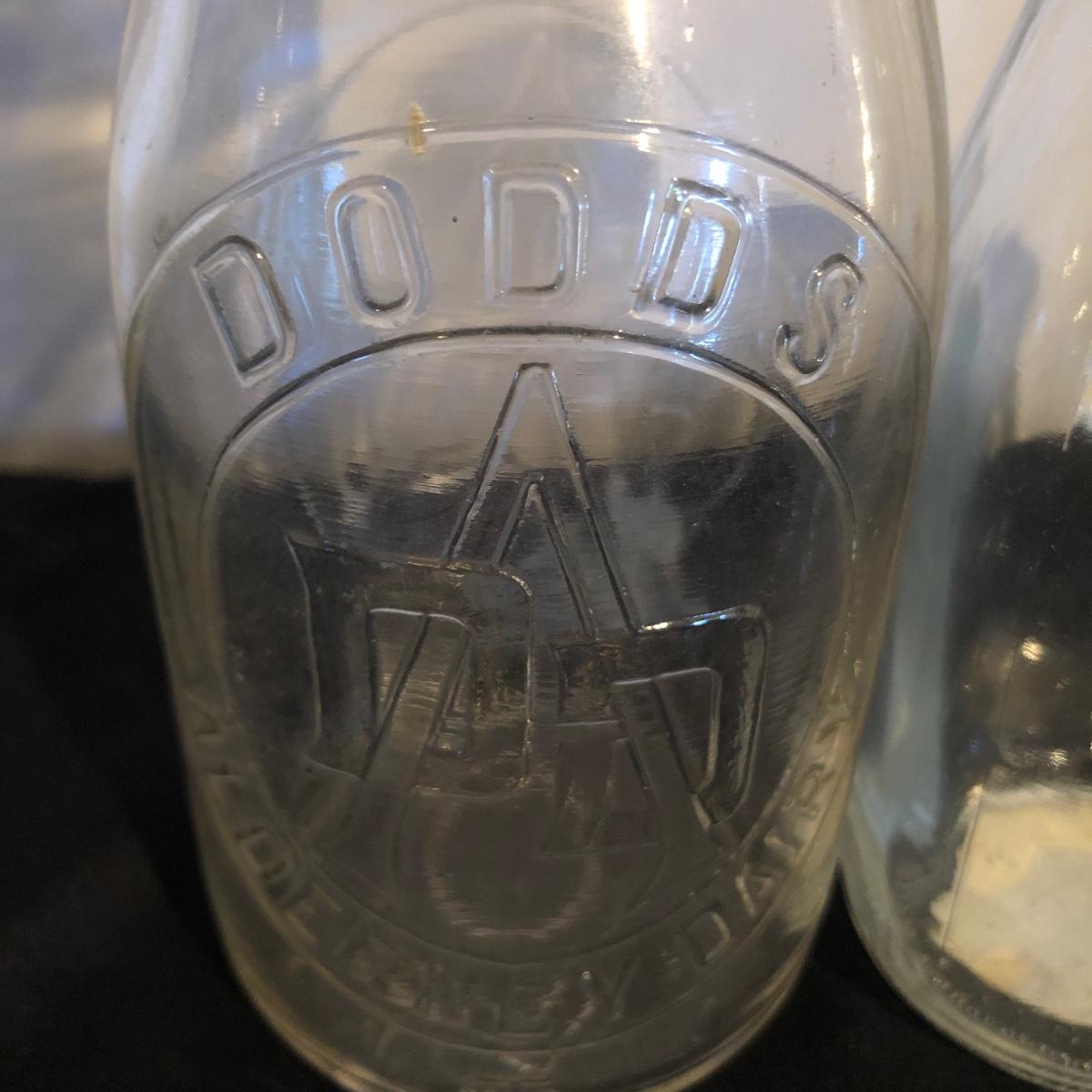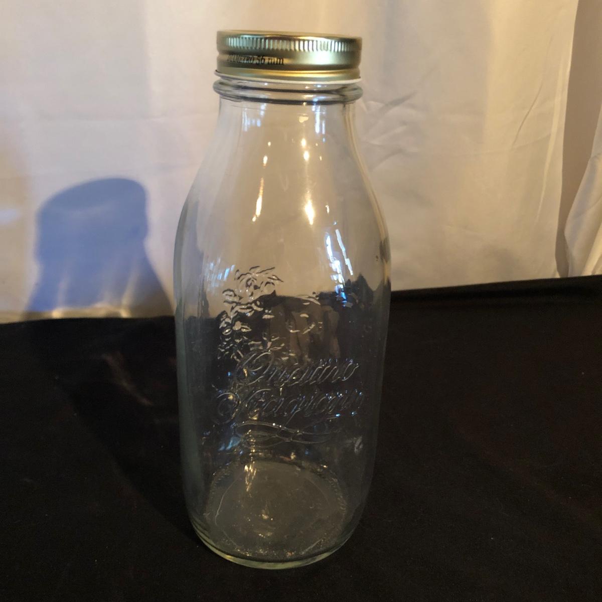 Lot includes a ceramic Spode Chivas bottle, three milk bottles, Italia jar and a Bormioll Rocco bottle. Also includes is a glass dental floss dispenser. Spode bottle measures 4.5”D x 9” tall.