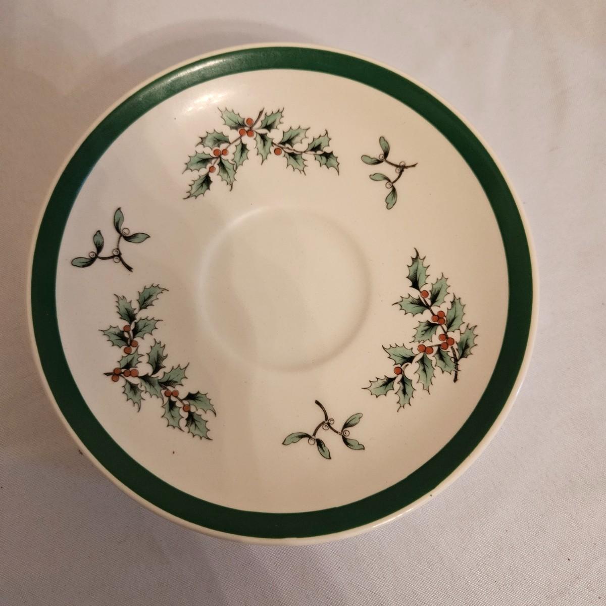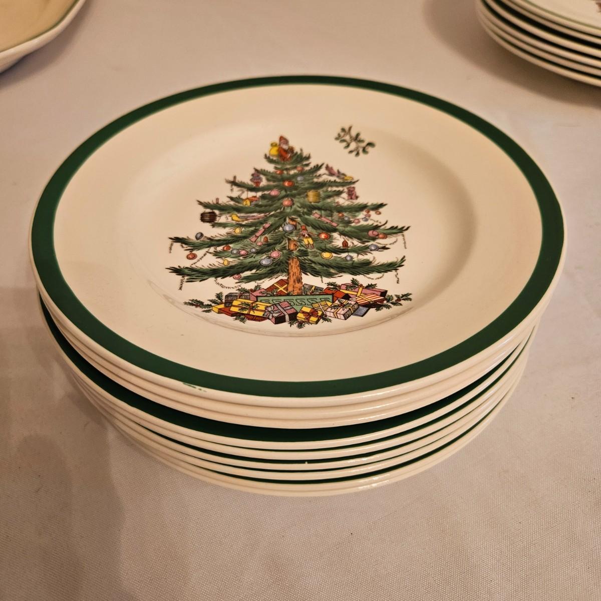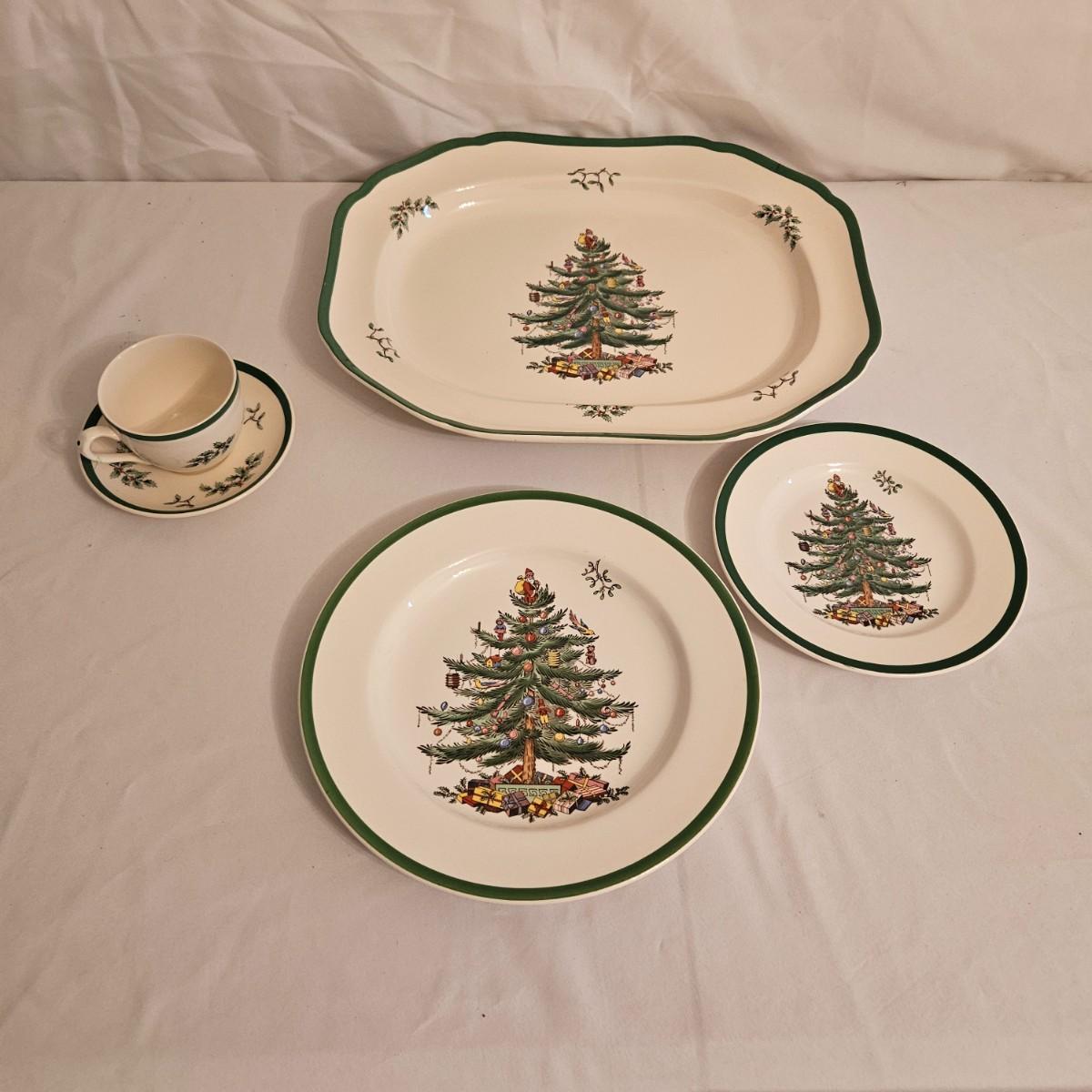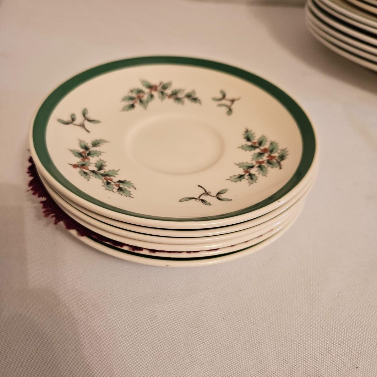 A six place setting Spoke Christmas china set that includes a large serving platter. There are six dinner plates, saucers and coffee cups, in addition to ten salad plates. The serving platter measures approximately 16" x 13". Shipping available.