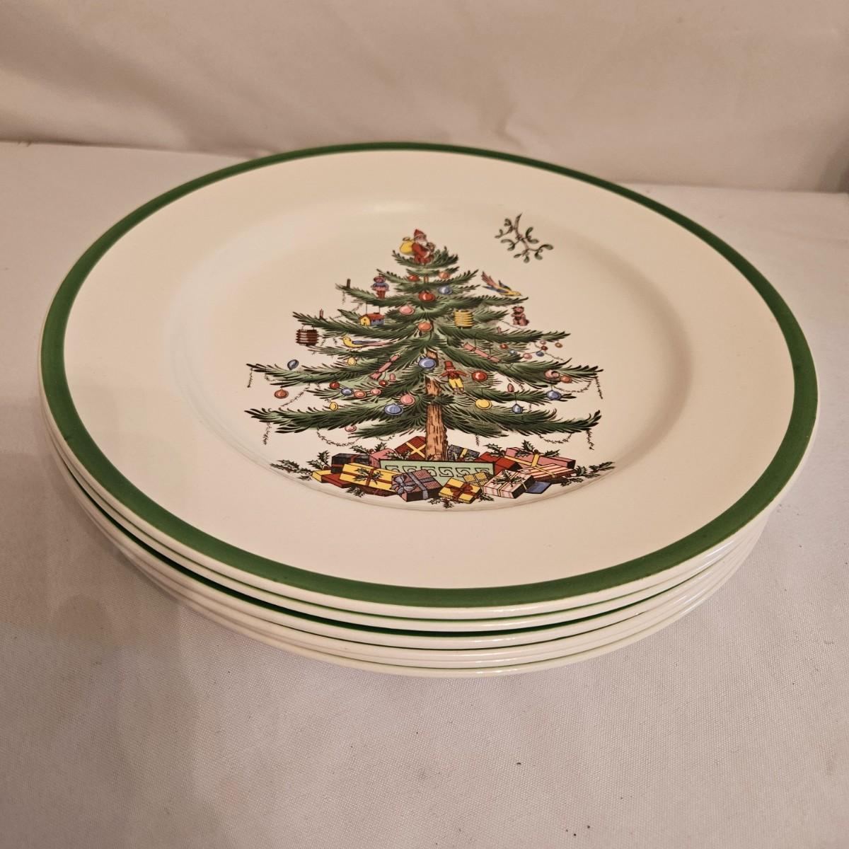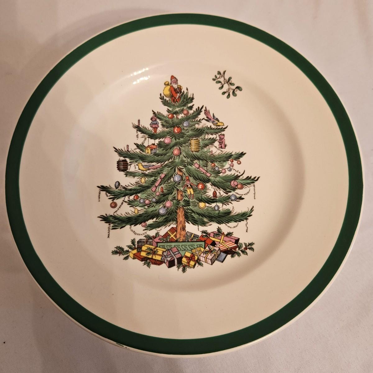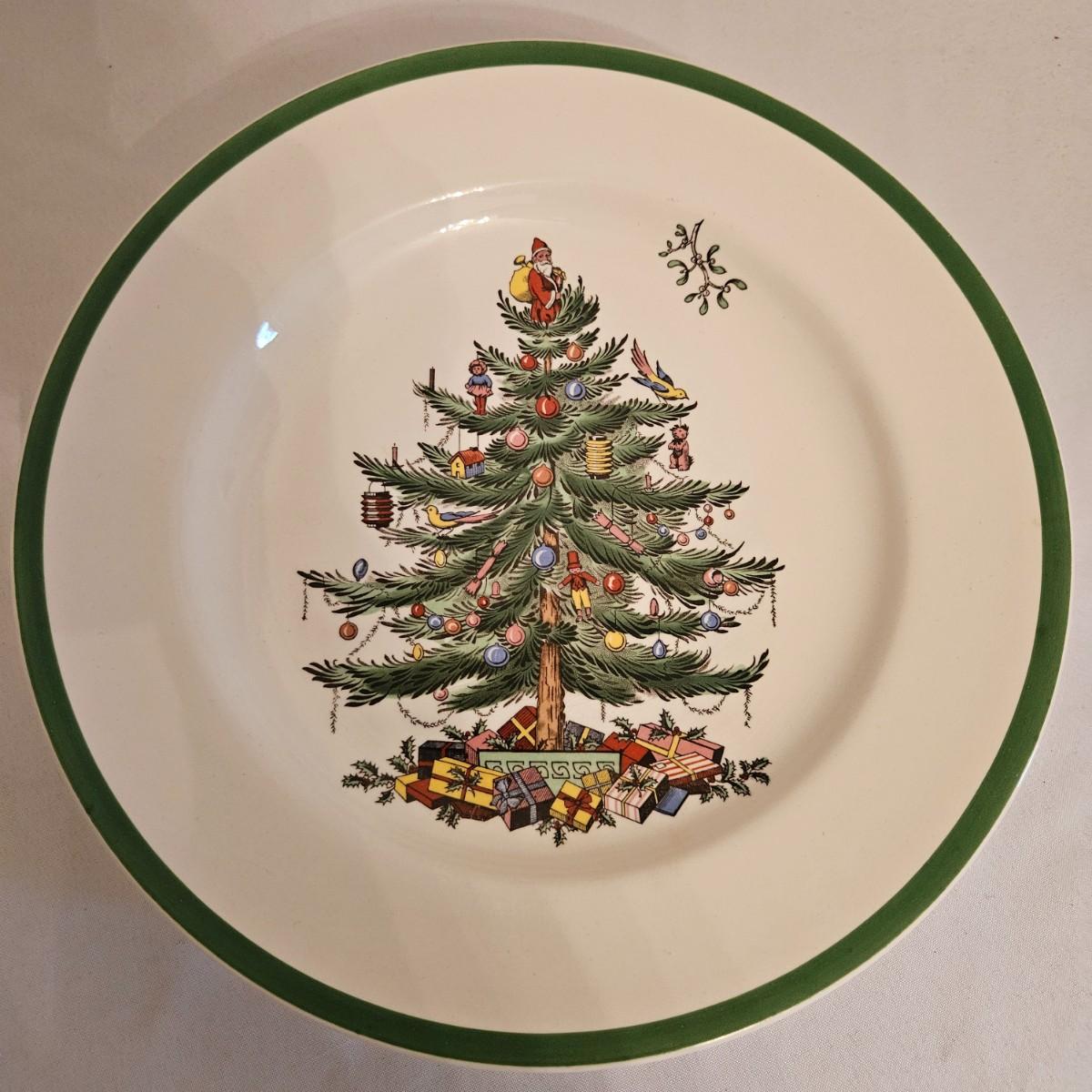 A six place setting Spoke Christmas china set that includes a large serving platter. There are six dinner plates, saucers and coffee cups, in addition to ten salad plates. The serving platter measures approximately 16" x 13". Shipping available.